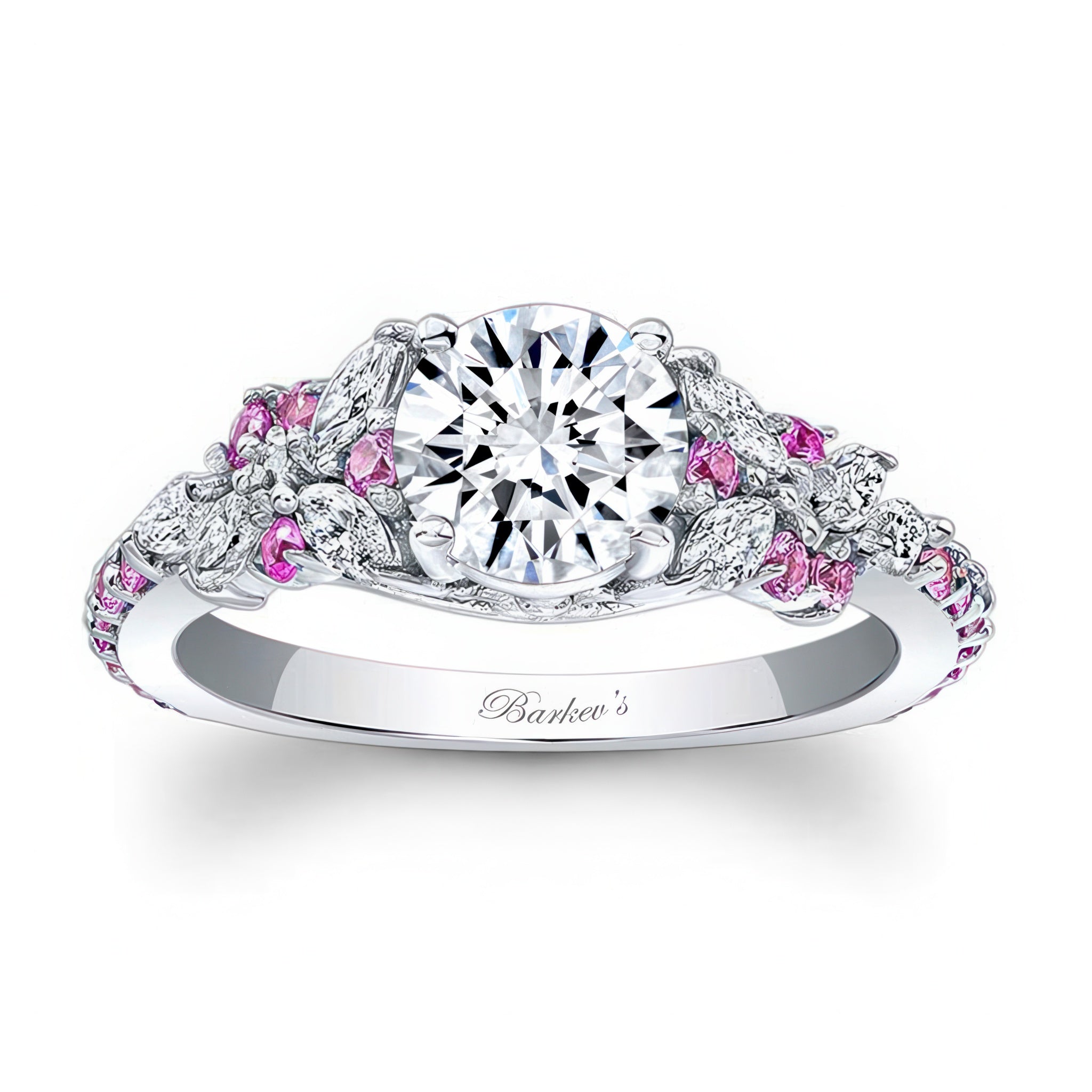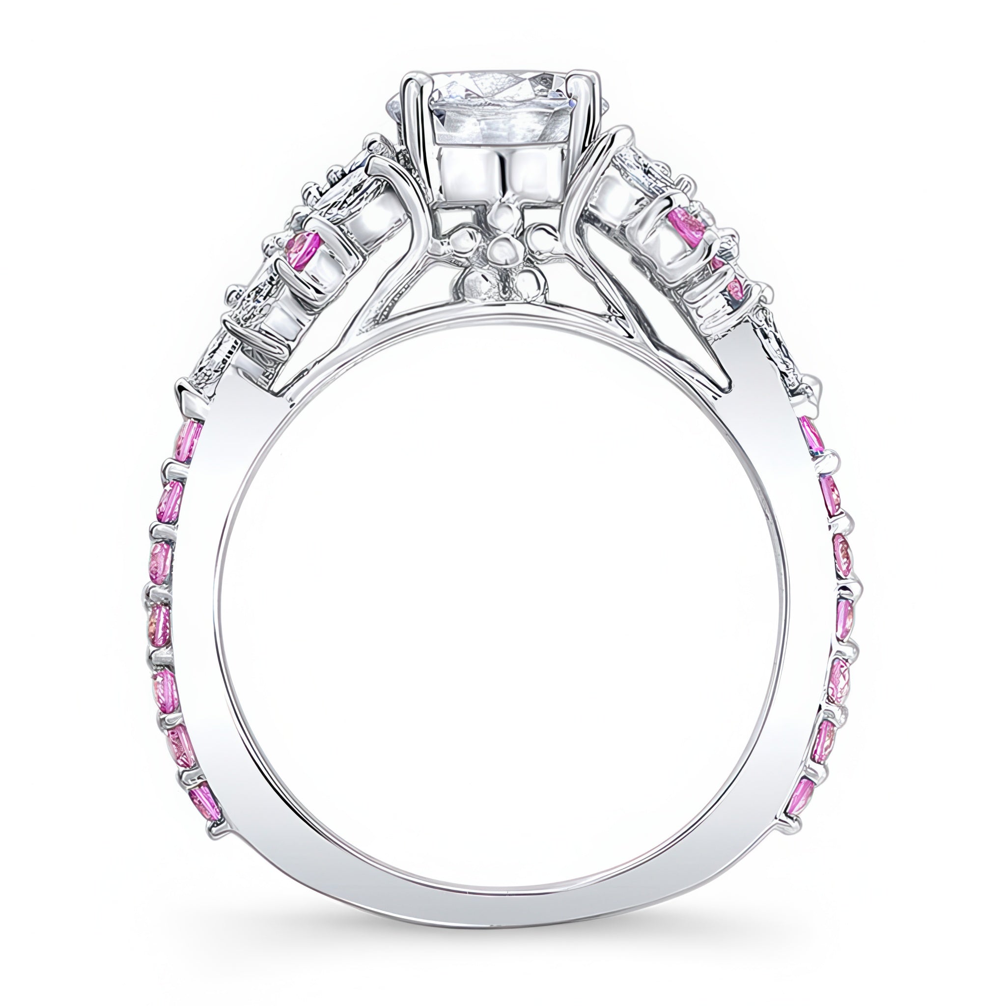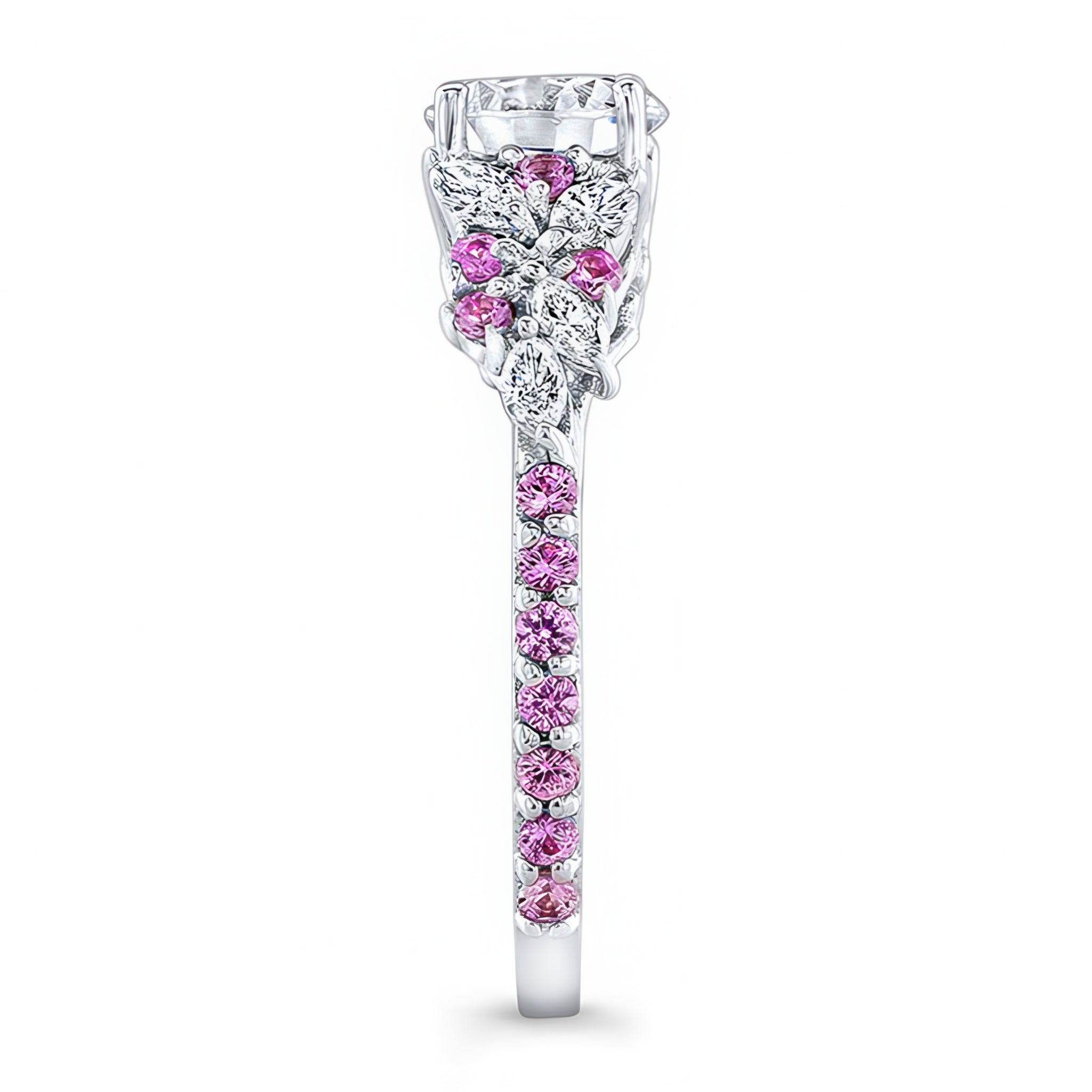 An exquisite vintage marquise pink sapphire accent engagement ring featuring a prong set round center and cathedral shoulders artfully adorned with marquise diamond melees and round pink sapphires.