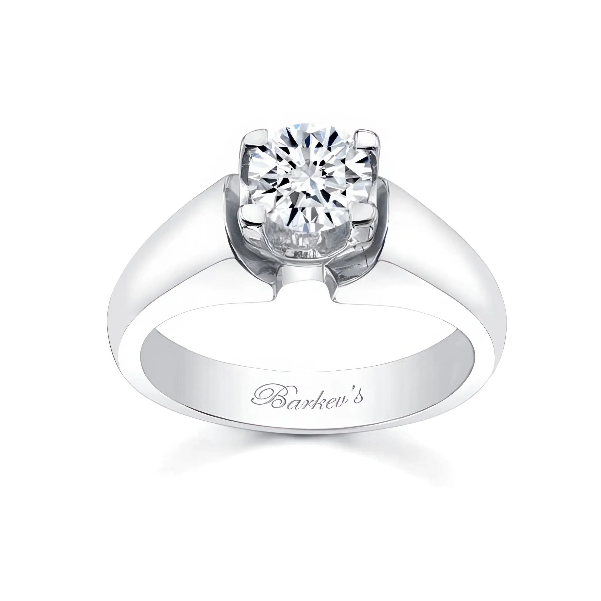 This low dome comfort fit solitaire engagement ring features a prong set round center with a domed cathedral shank that sits on the finger comfortably.