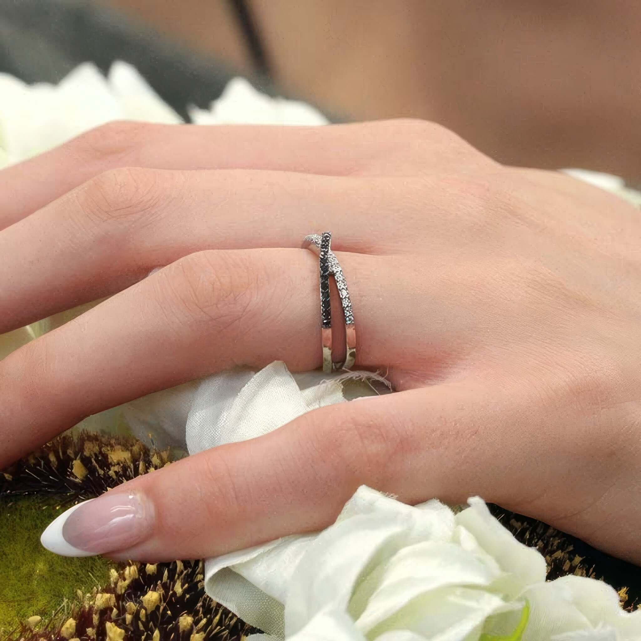 A beautiful criss cross black and white diamond promise ring featuring shared prong set black and white diamonds sitting on a gold band