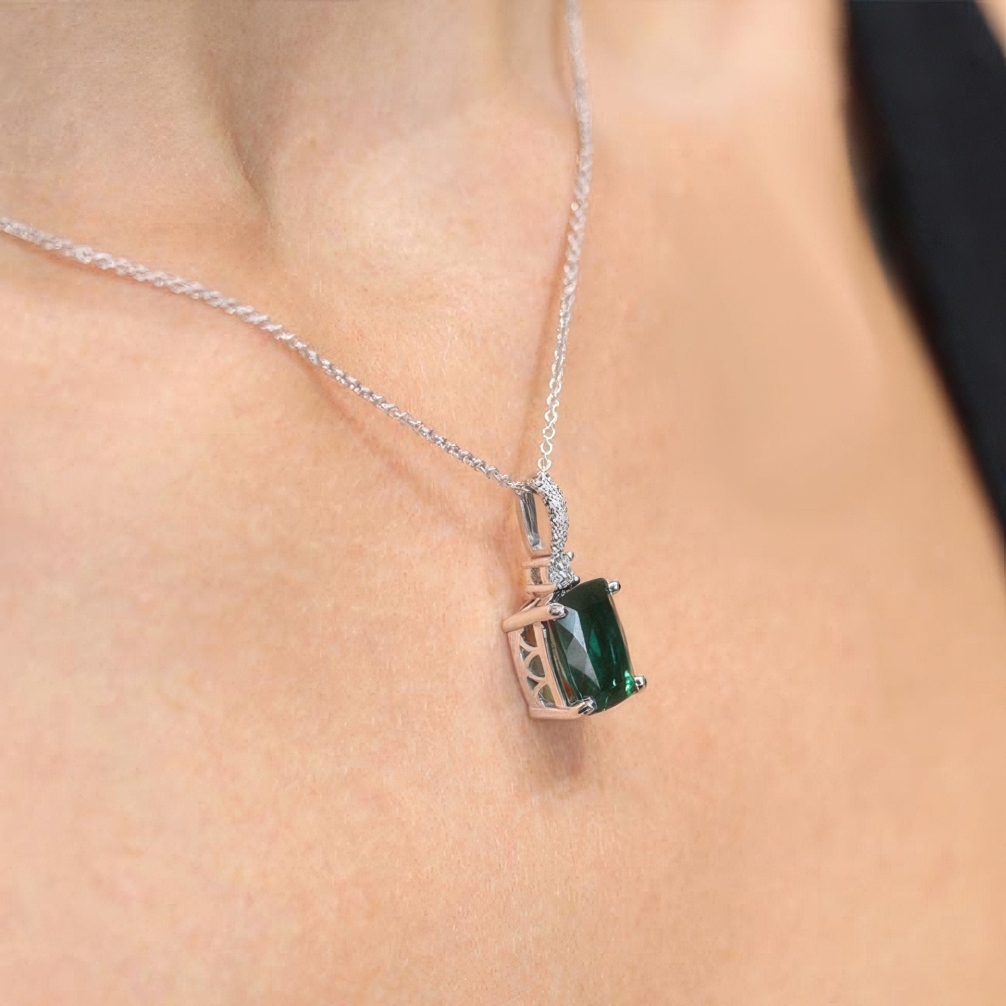 This cushion green tourmaline and diamond necklace features a beautiful prong set cushion green tourmaline with an accent diamond ontop of it and a cascade of diamonds graduating in size.
