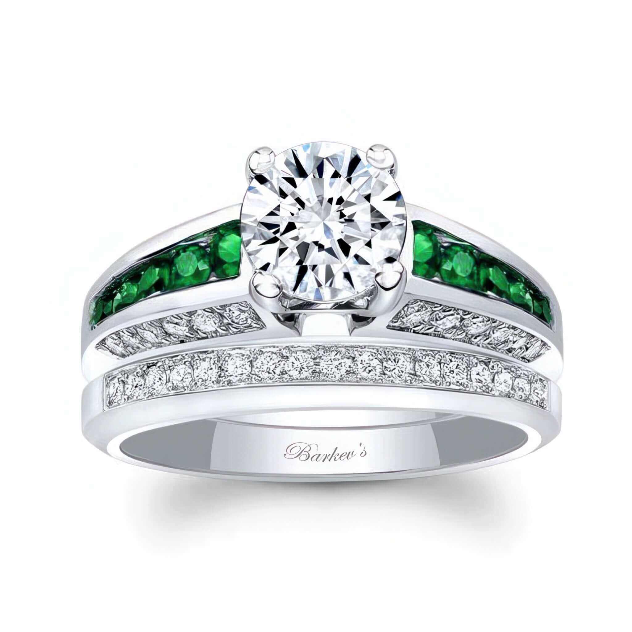 This magnificent emerald accent channel set wedding ring set boasts with sparkle from every angle featuring beveled edges and a round center that is met by a row of channel set emeralds and pave white diamonds adorning not only the top, but also each side of the shank. Adding to this brilliance, the diamond wedding band fits snuggly close to the engagement ring for an unparalleled look.