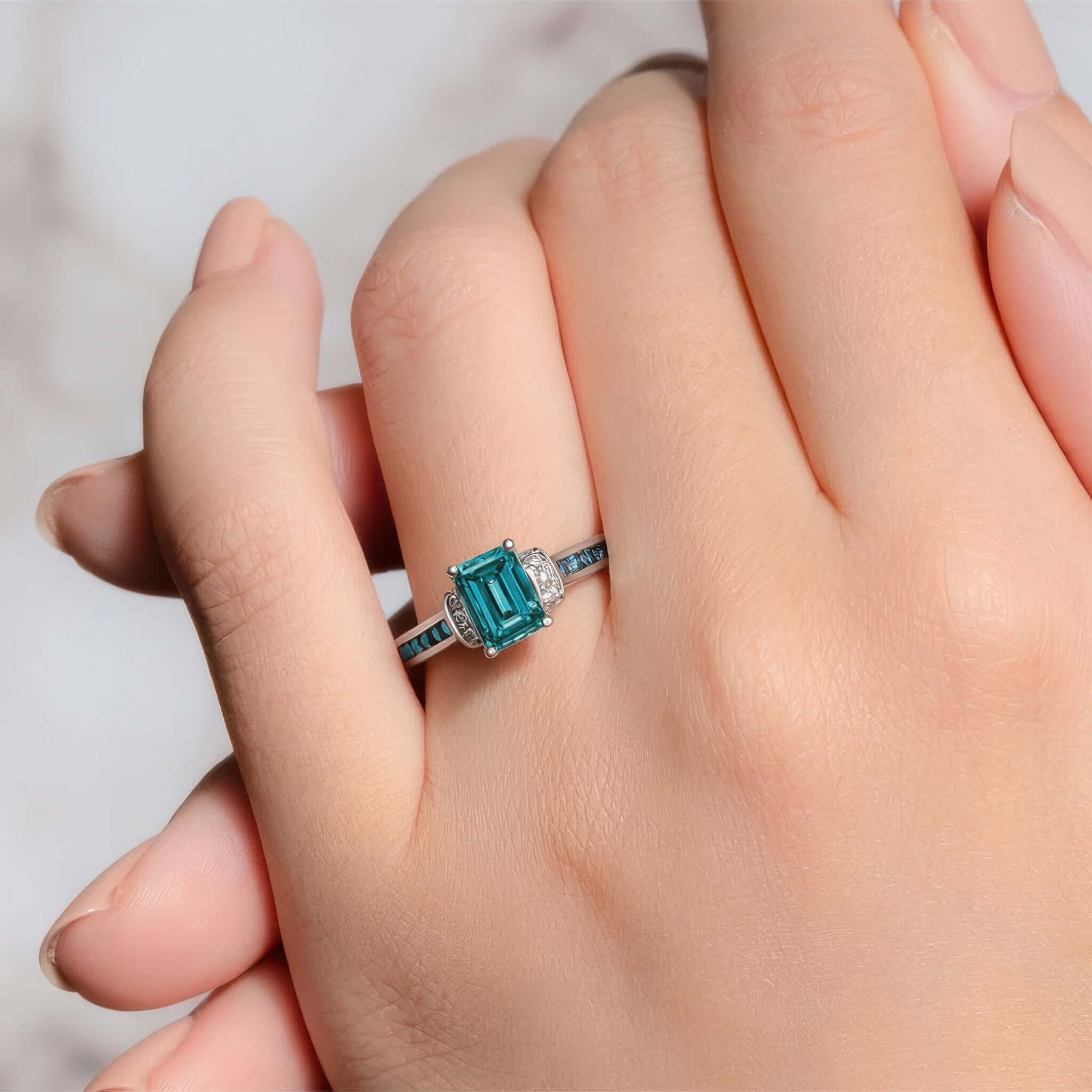 A stunning emerald cut blue diamond ring featuring a unique design with channel set blue diamonds, pave set round diamonds and 2 smaller bezel set princess cut blue diamonds all flanking the 1 carat center stone.