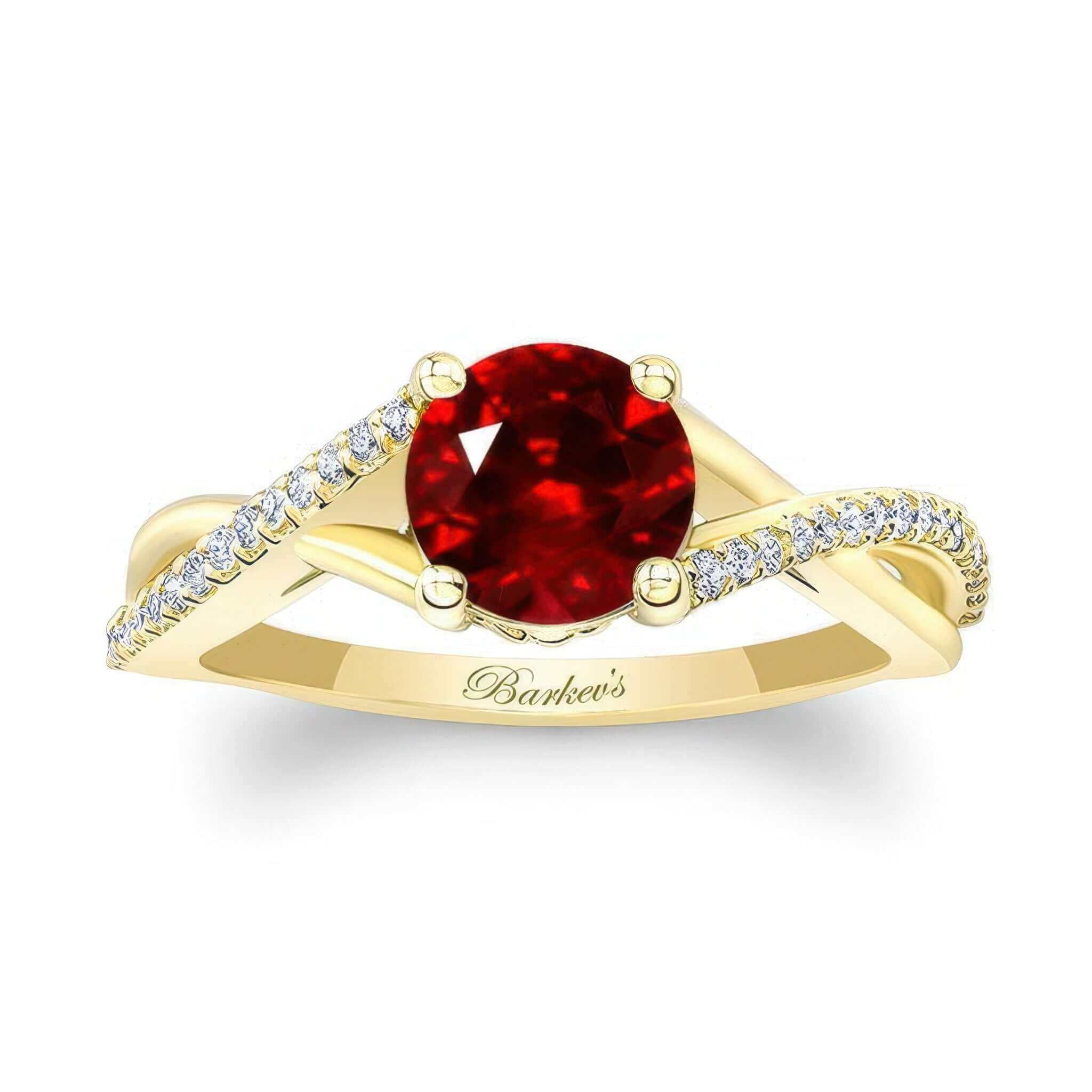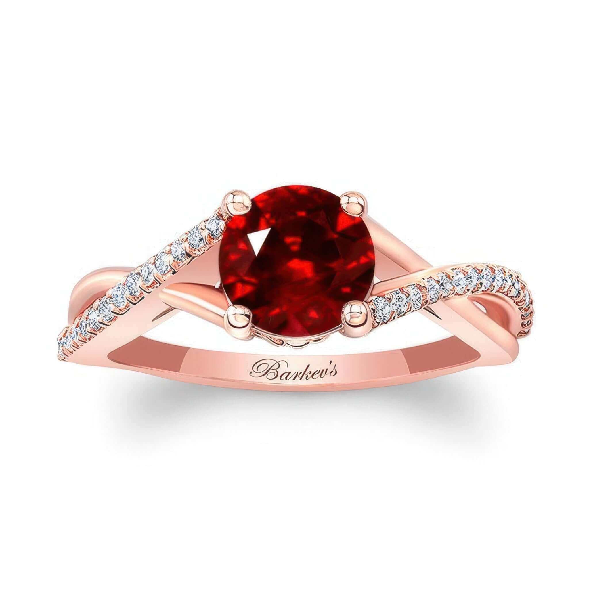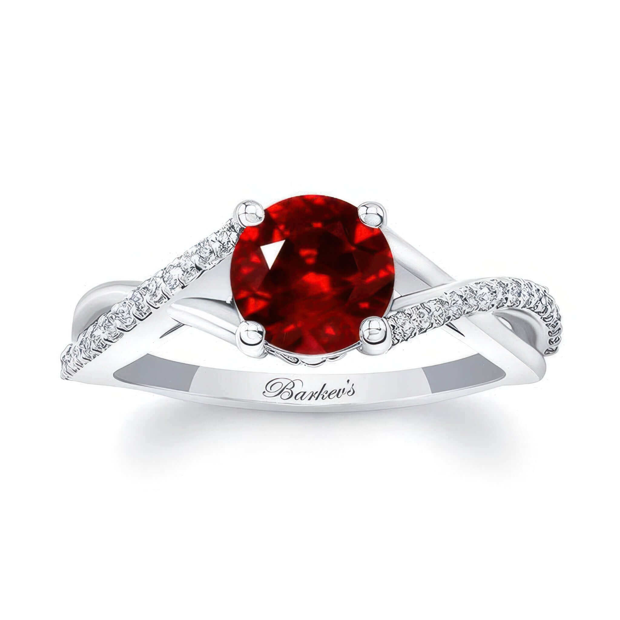 A simple one carat lab grown ruby and diamond ring featuring a round center, a criss crossing split shank and shared prong diamonds on the sides.