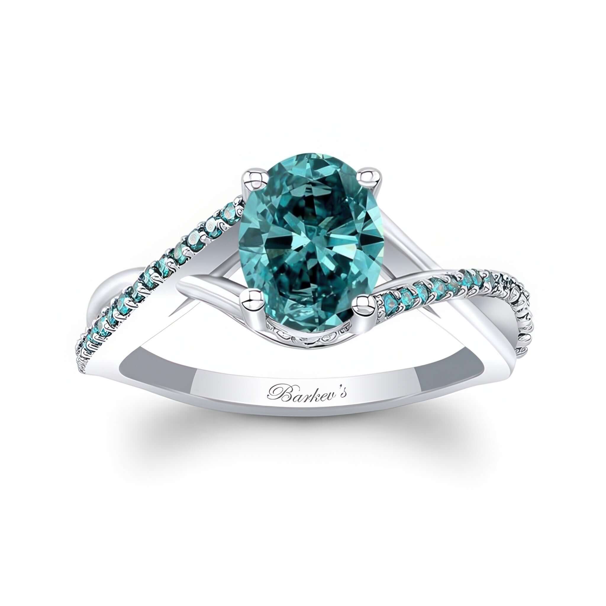 A simple one carat oval blue diamond ring featuring an oval center, a criss crossing split shank and shared prong blue diamonds on the sides.