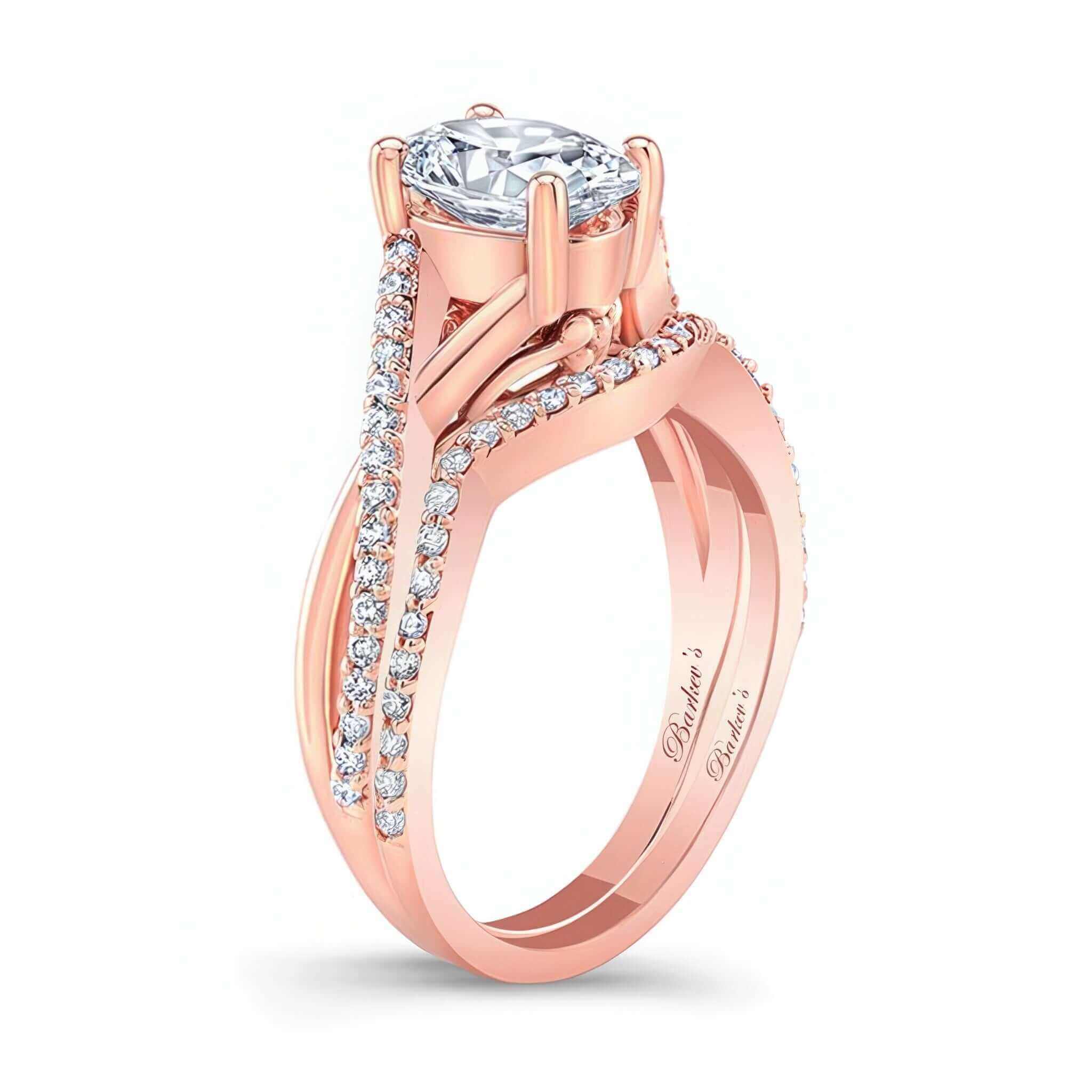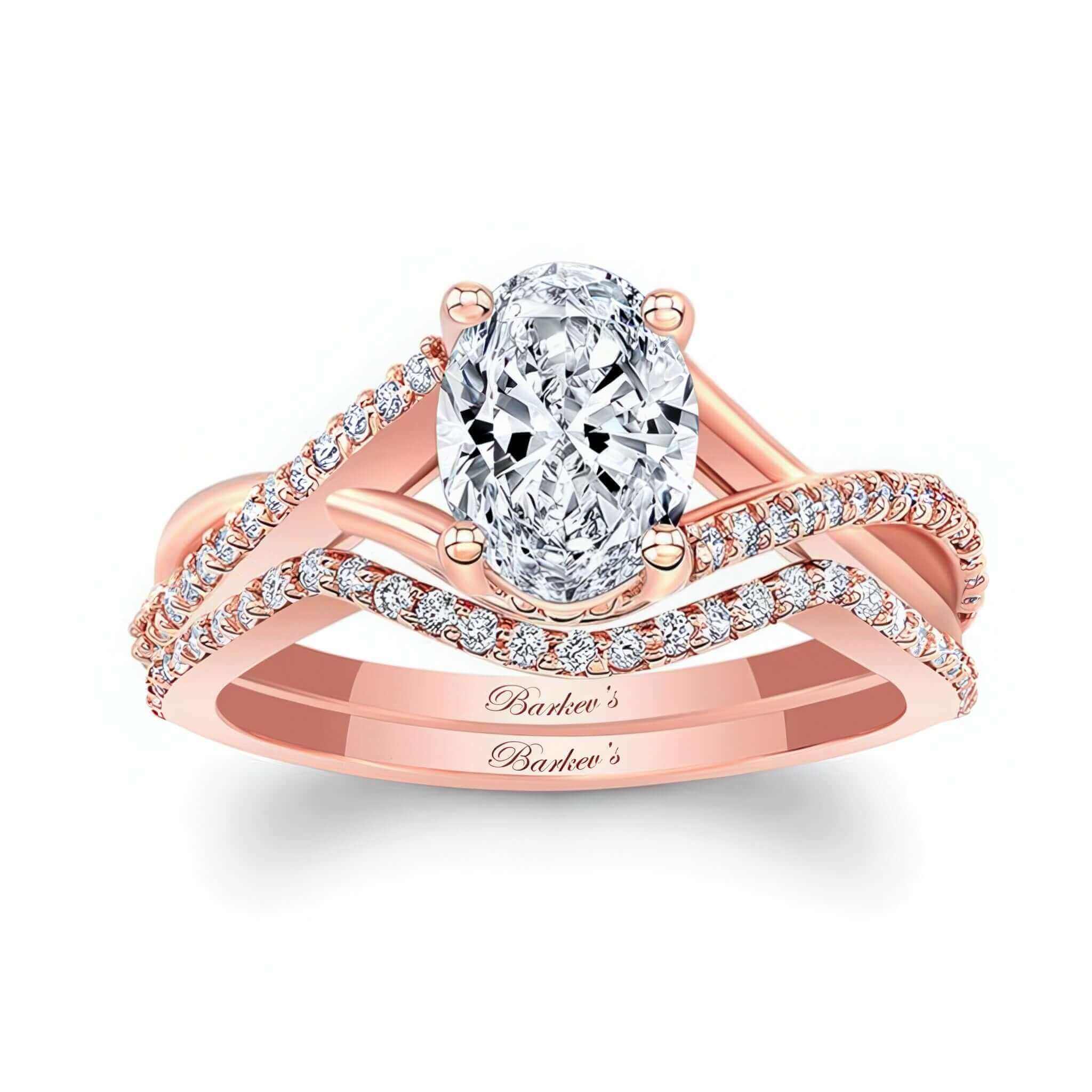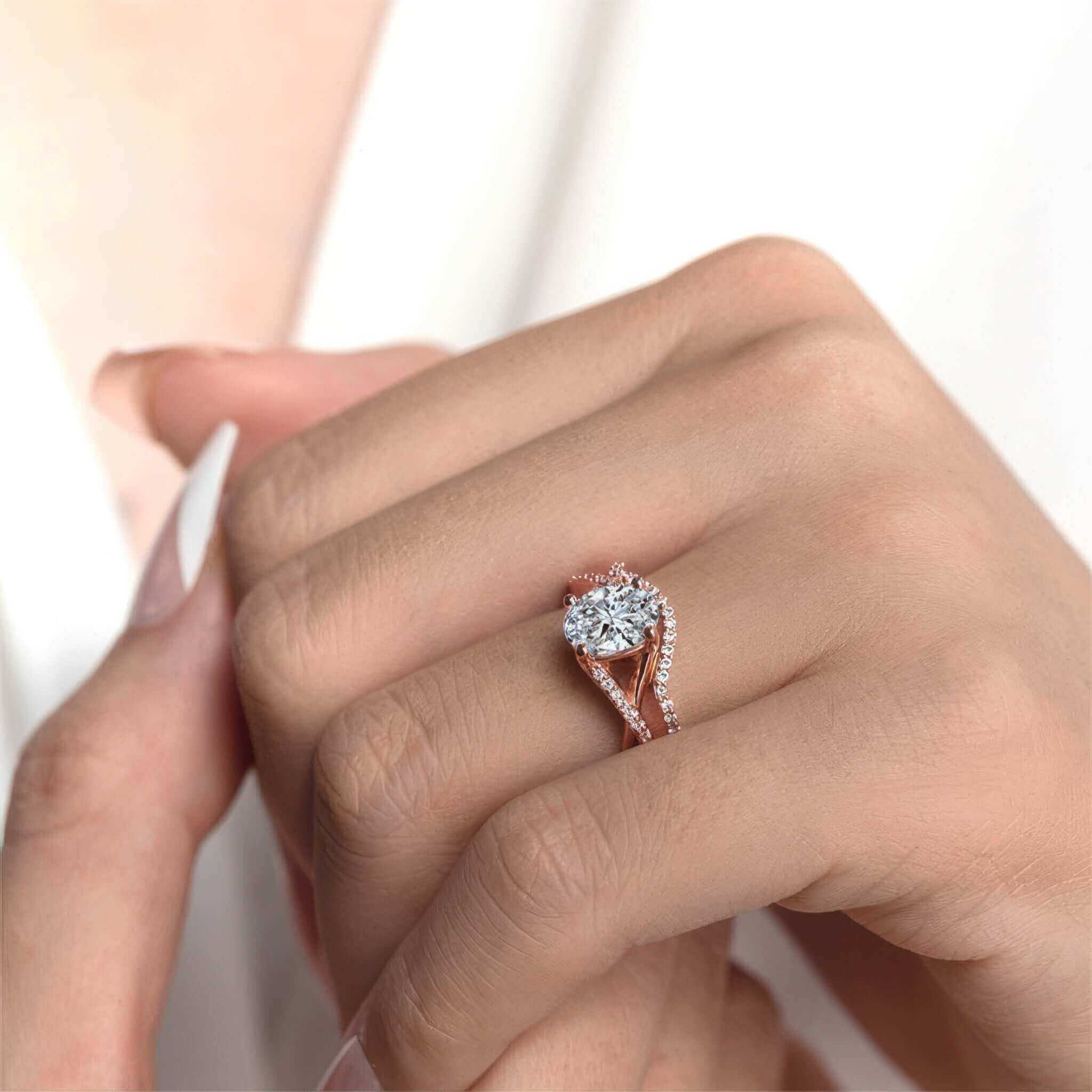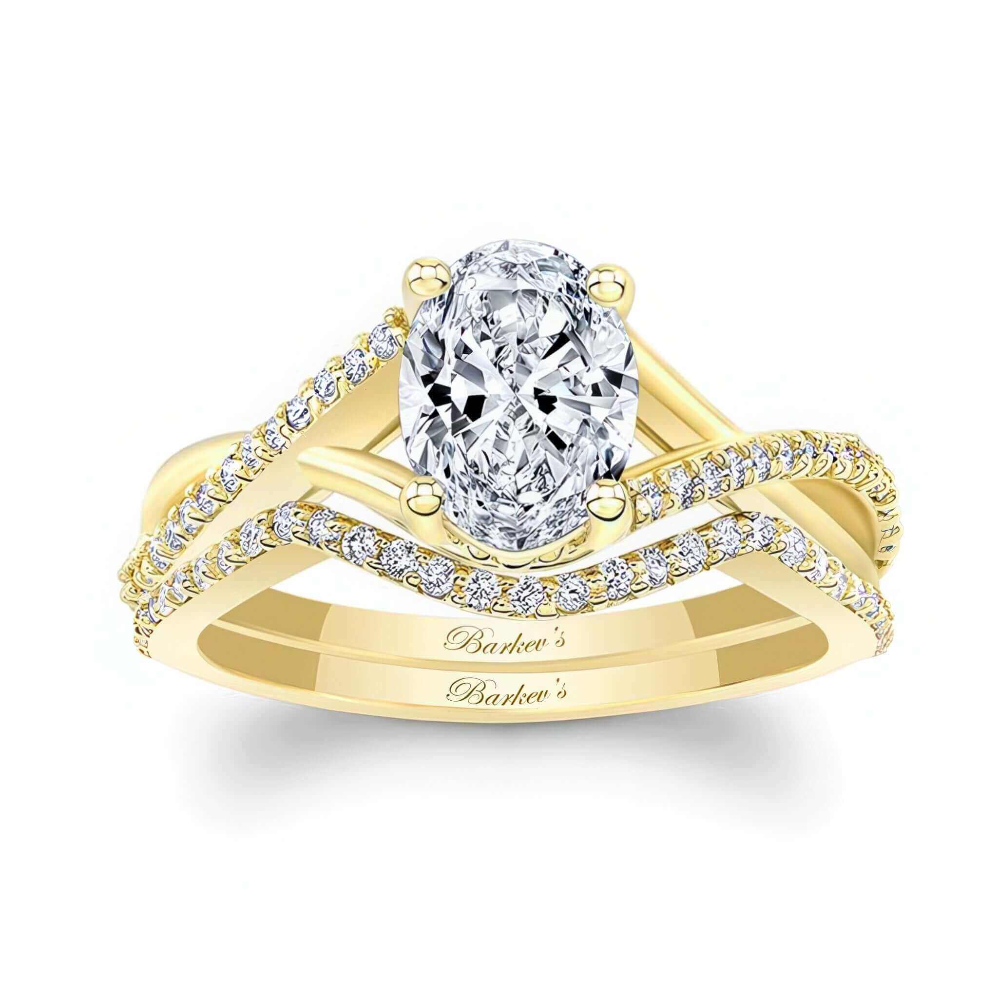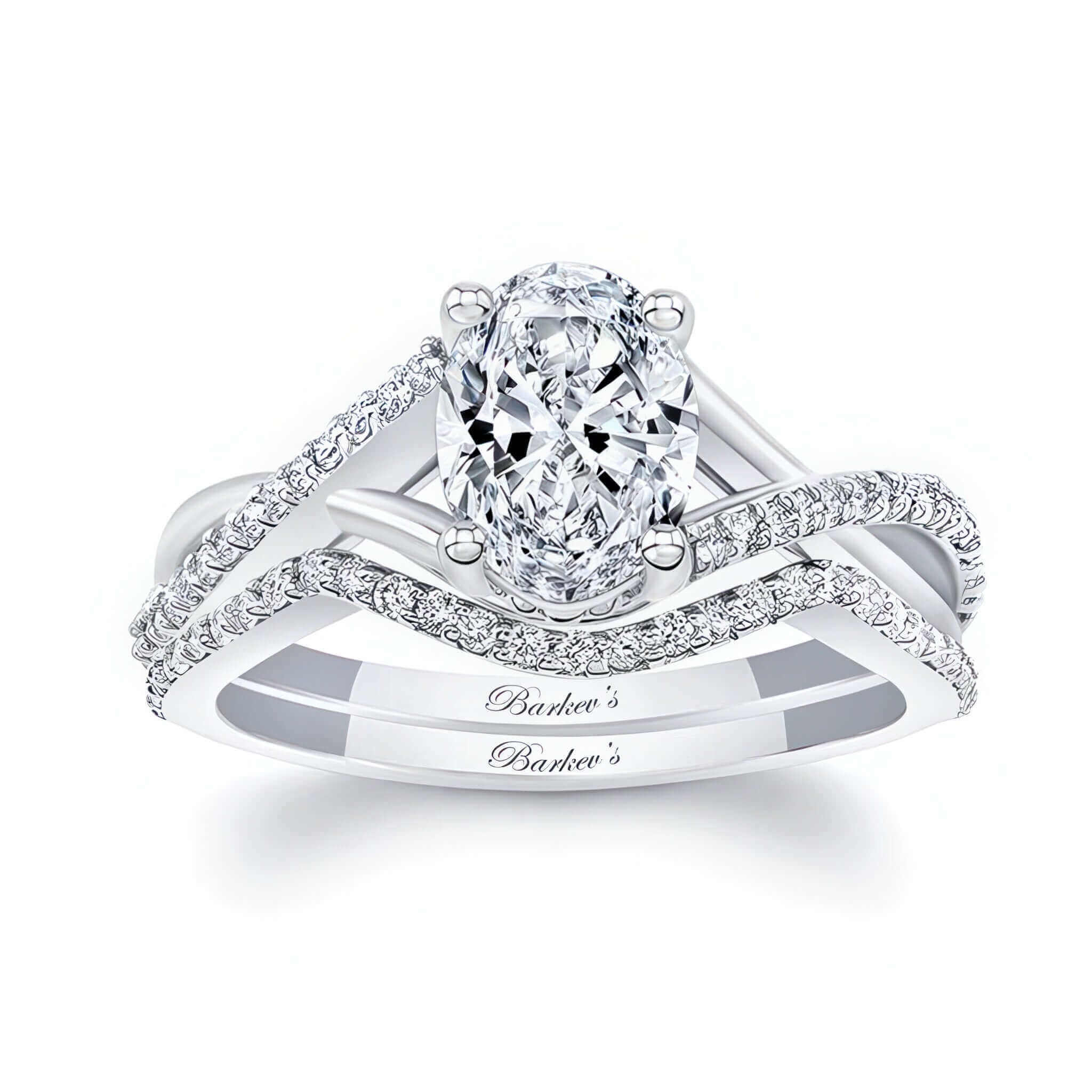 A simple one carat oval diamond bridal set featuring an oval center, a criss crossing split shank and shared prong diamonds on the sides. Comes with a matching wedding band.