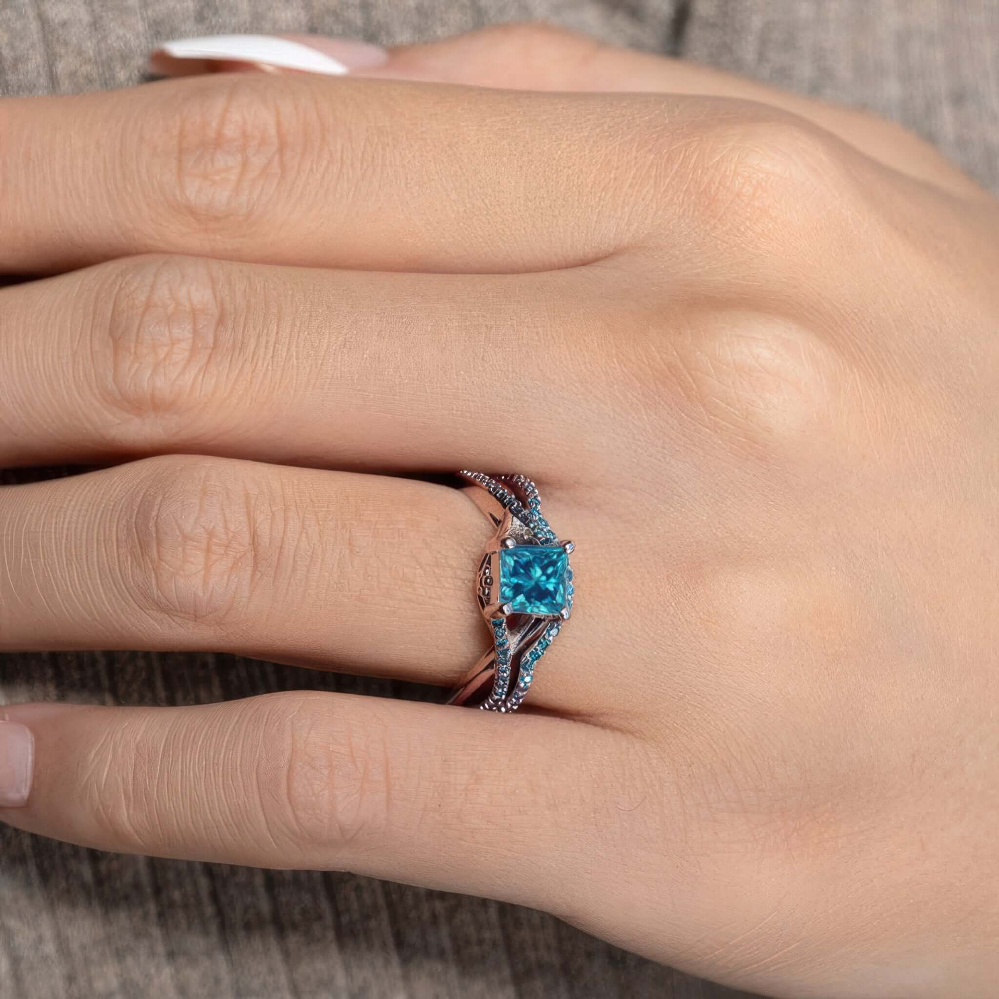 A simple one carat princess cut blue diamond bridal set featuring a princess cut center, a criss crossing split shank and shared prong blue diamonds on the sides. Comes with a matching wedding band.