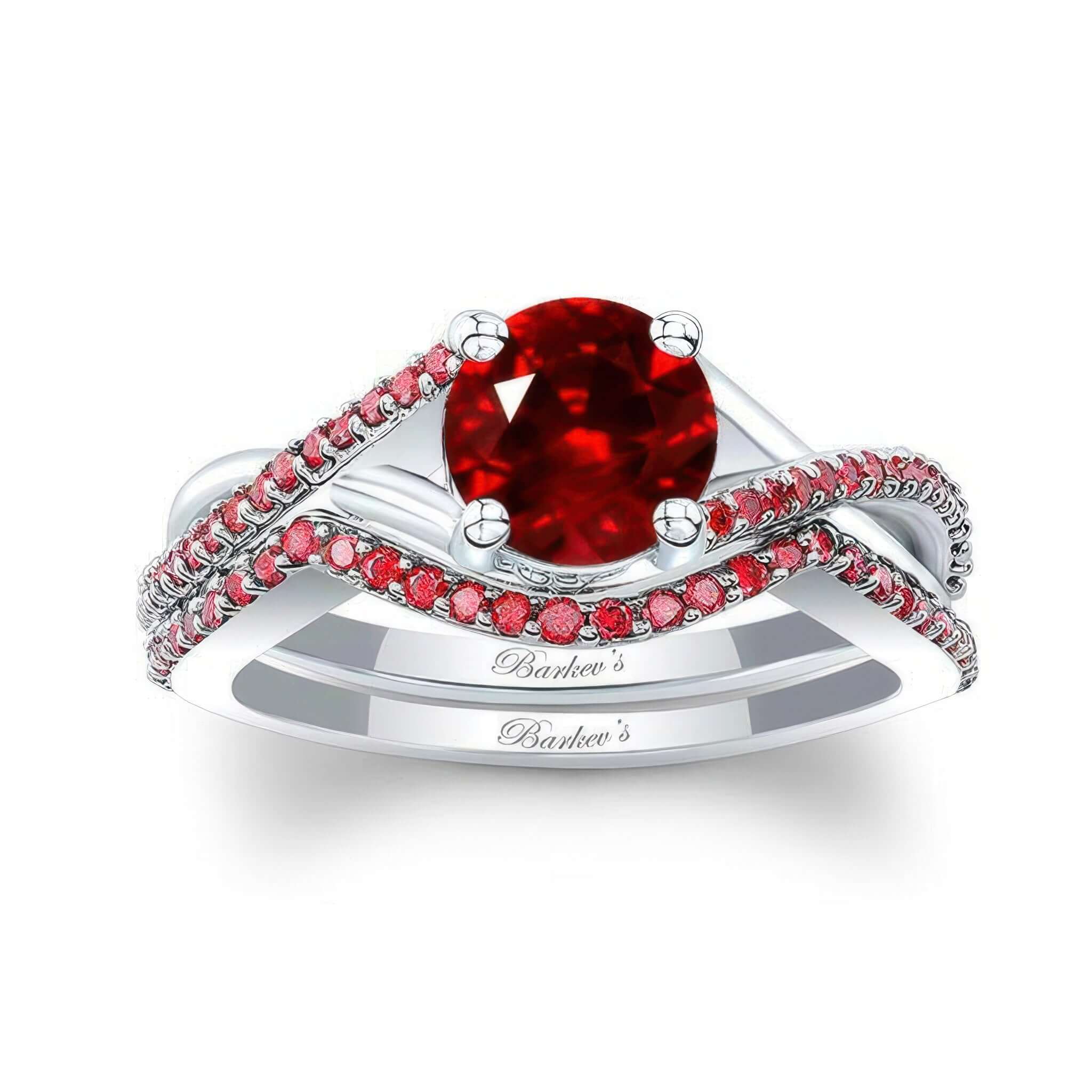 A simple one carat ruby bridal set featuring a round center, a criss crossing split shank and shared prong rubies on the sides. Comes with a matching wedding band.