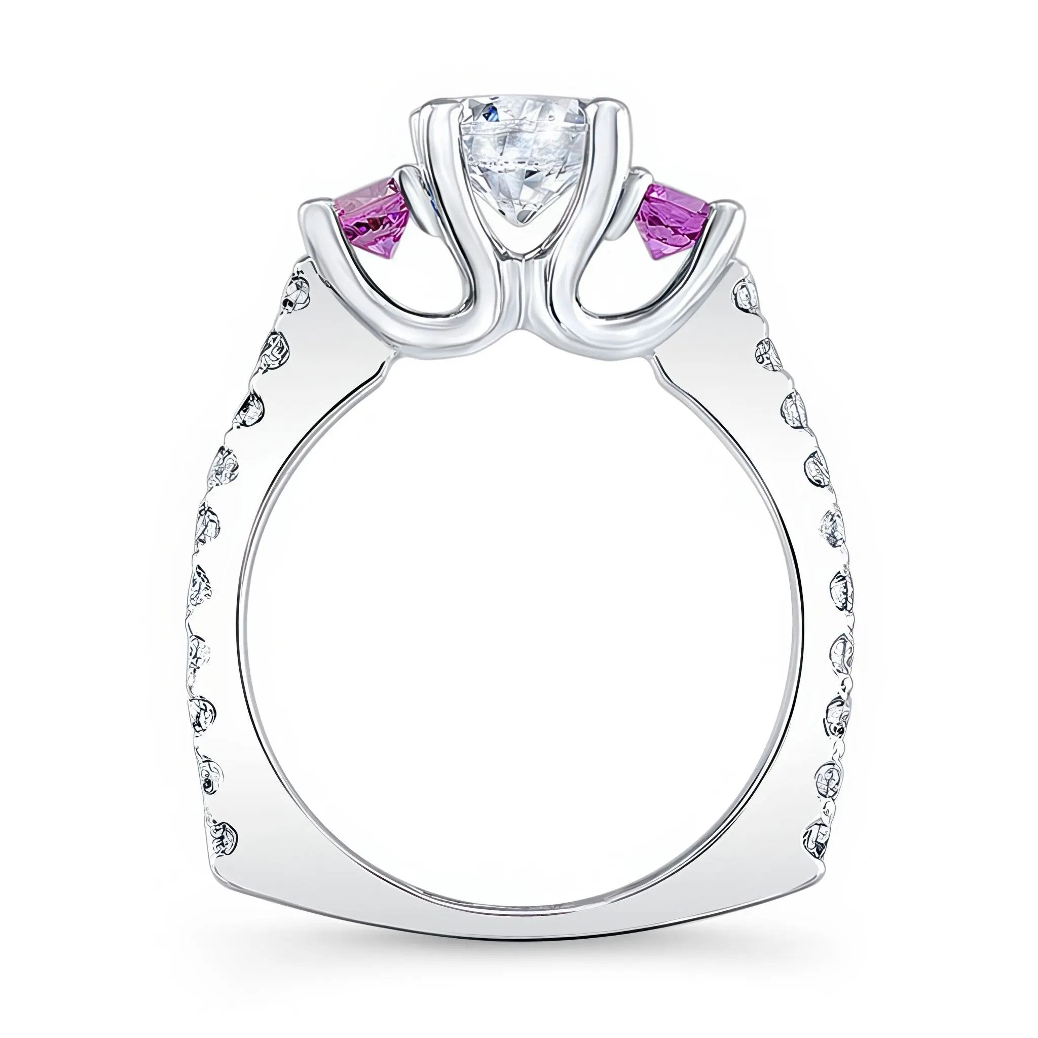 This pink sapphire accent 3 stone ring features a prong set round center flanked by smaller pink sapphires on each side with more diamond melees running down the ridge of the euro shank for a sophisticated modern look.