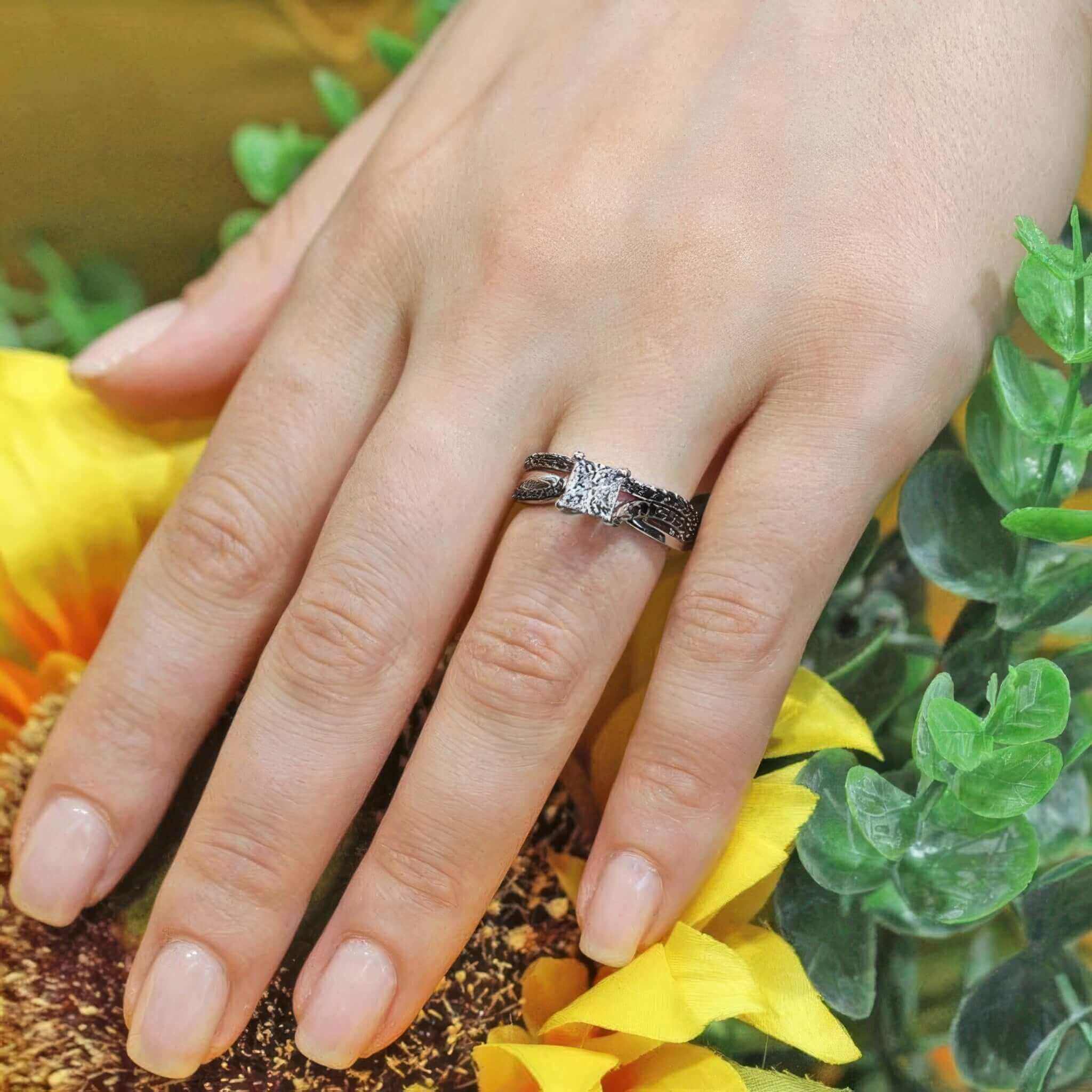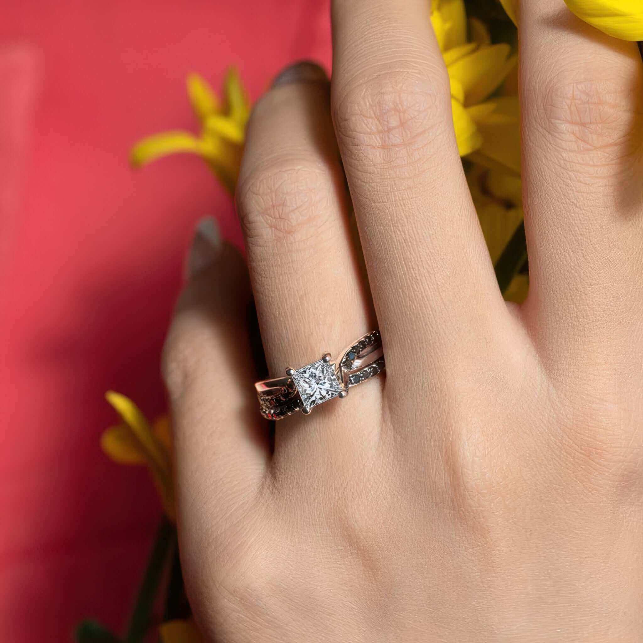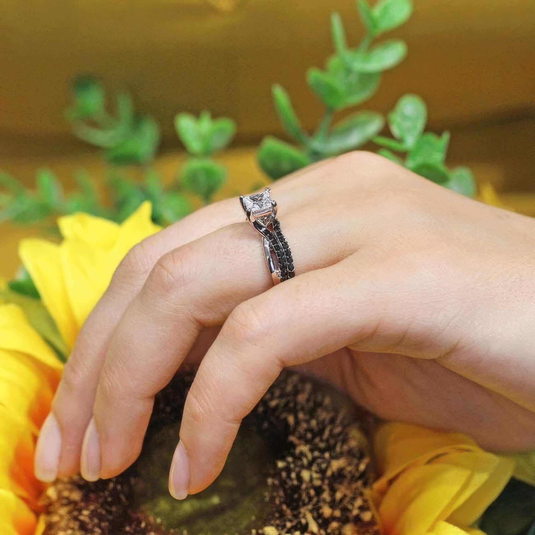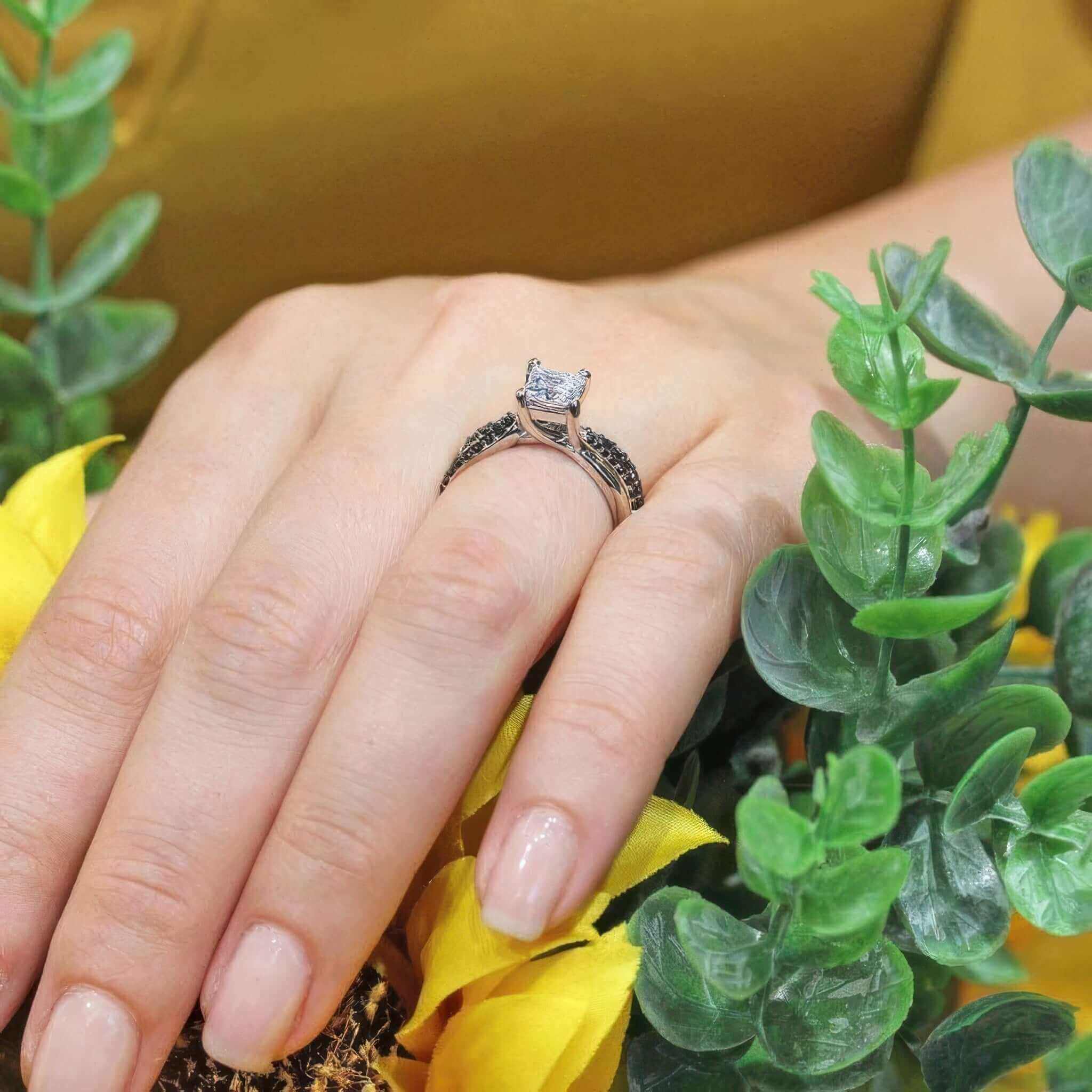 A stunning princess cut black diamond accent ring set featuring a prong set center with a sprinkle of shared prong black diamonds set on the slightly curving split shank for a truly beautiful statement. Comes with a matching wedding band.