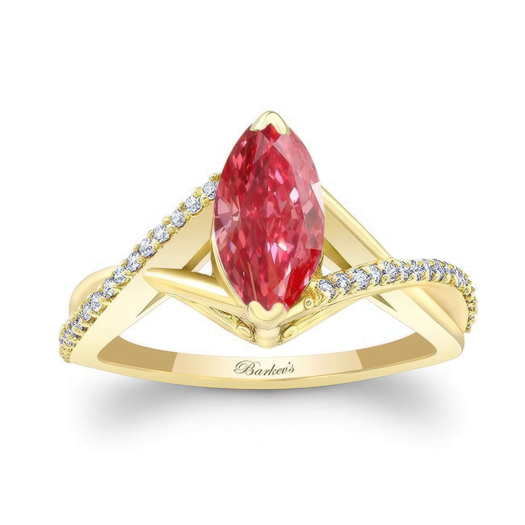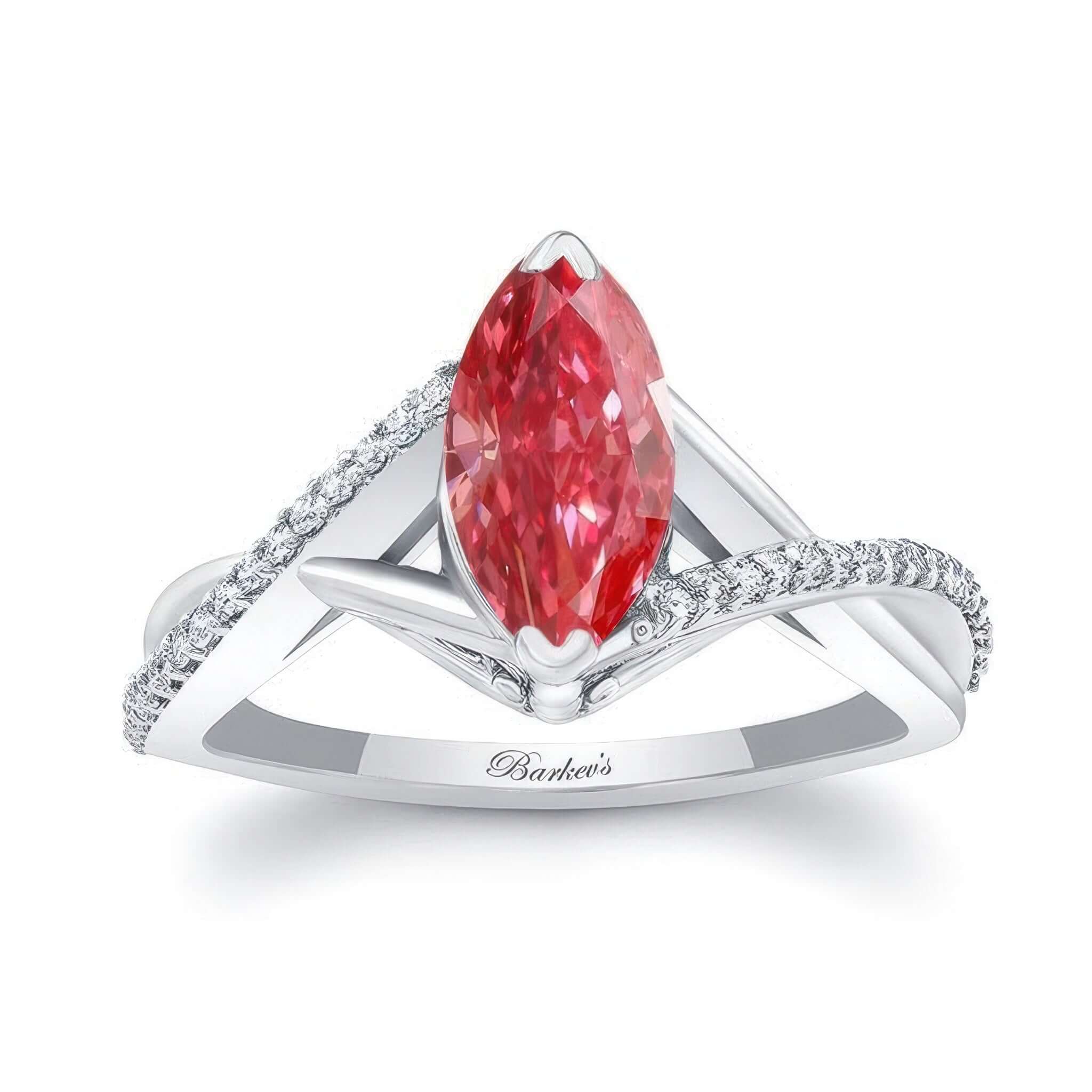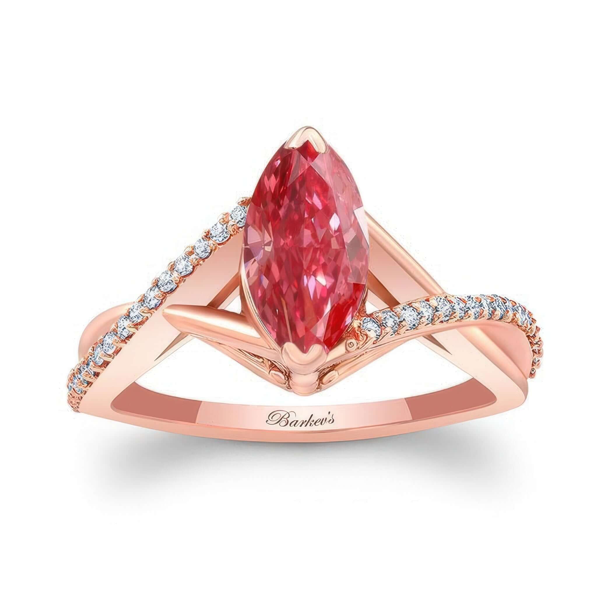This 1 carat marquise lab grown pink diamond ring features an overlapping diamond shank, a prong set marquise center and flower motif.