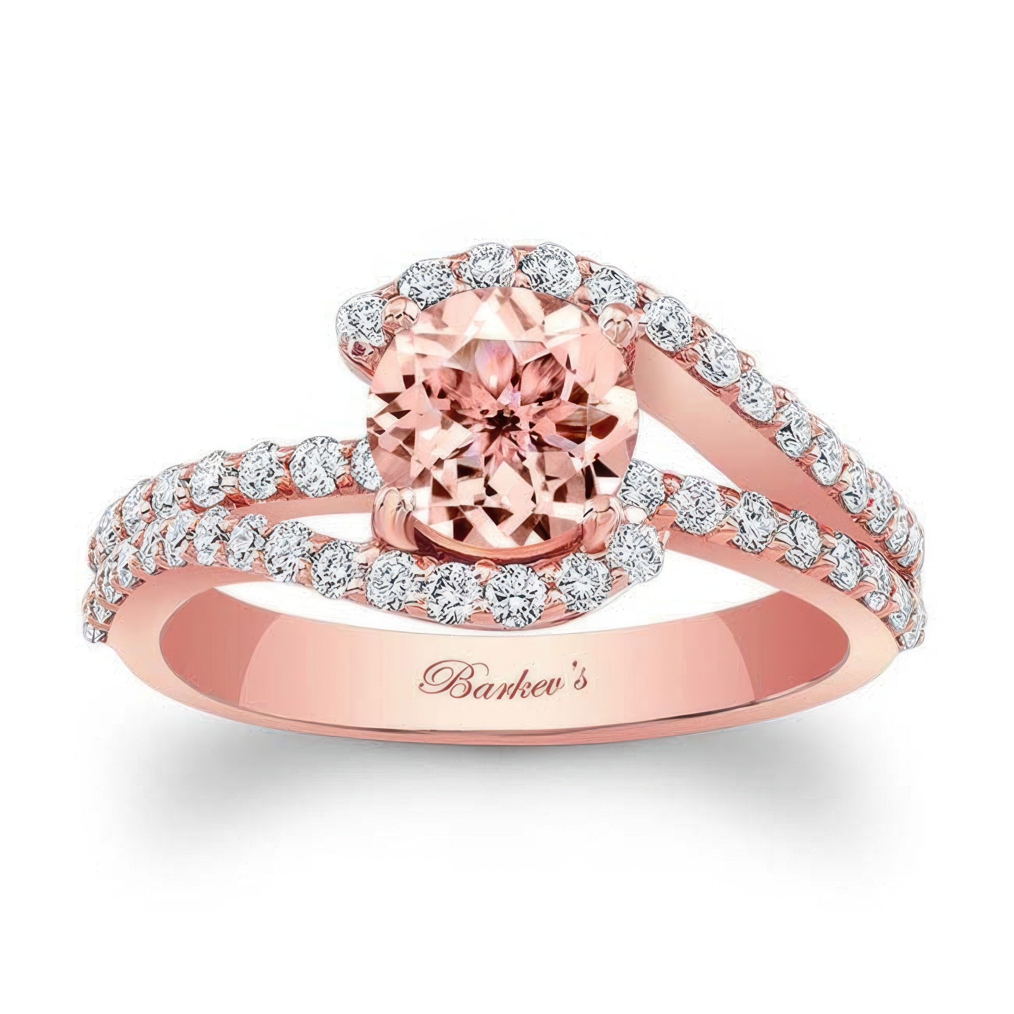 This 1 carat morganite ring features a split shank that curves around the prong set round center and a bridge running underneath adorned with shared prong set diamonds for a classic yet brilliant look.