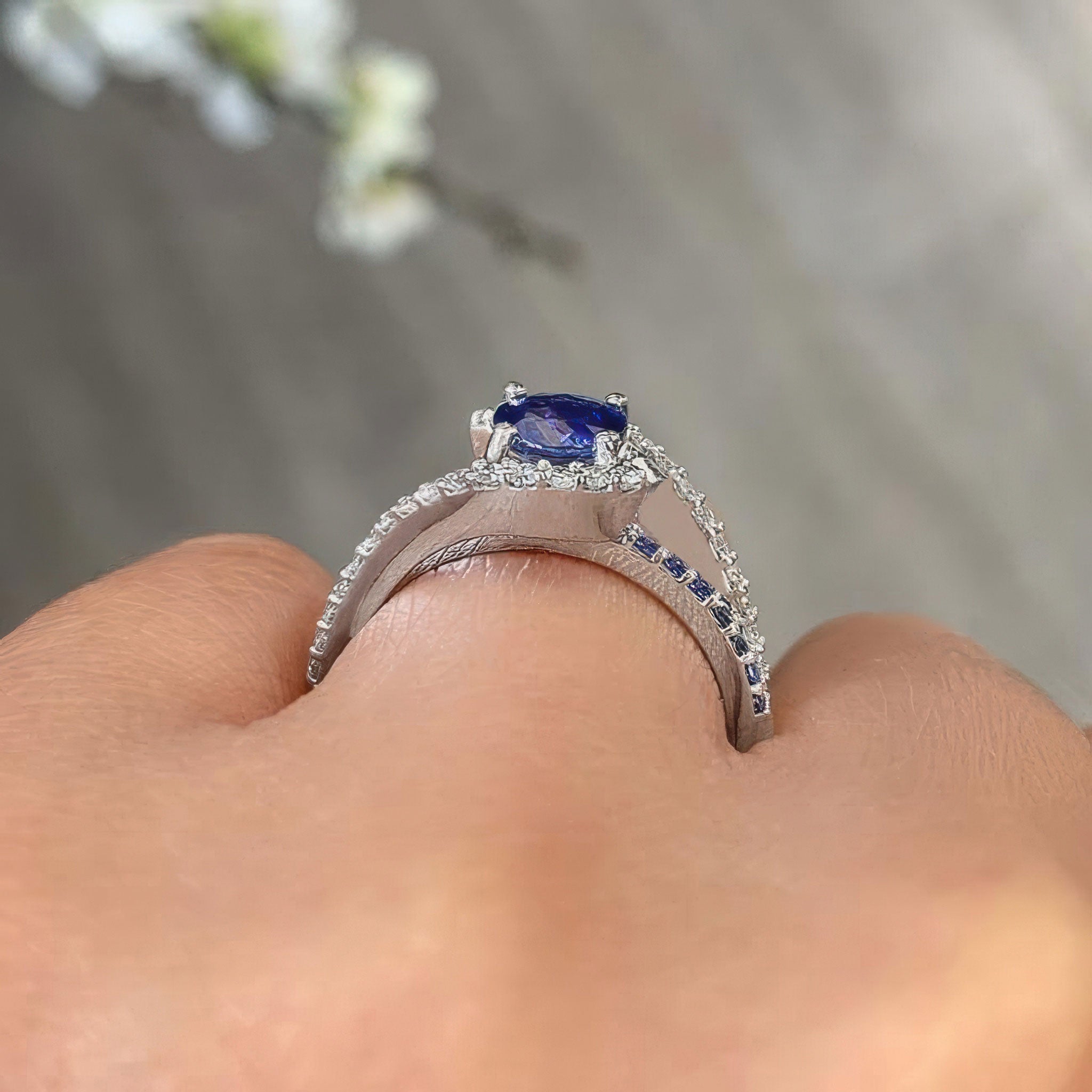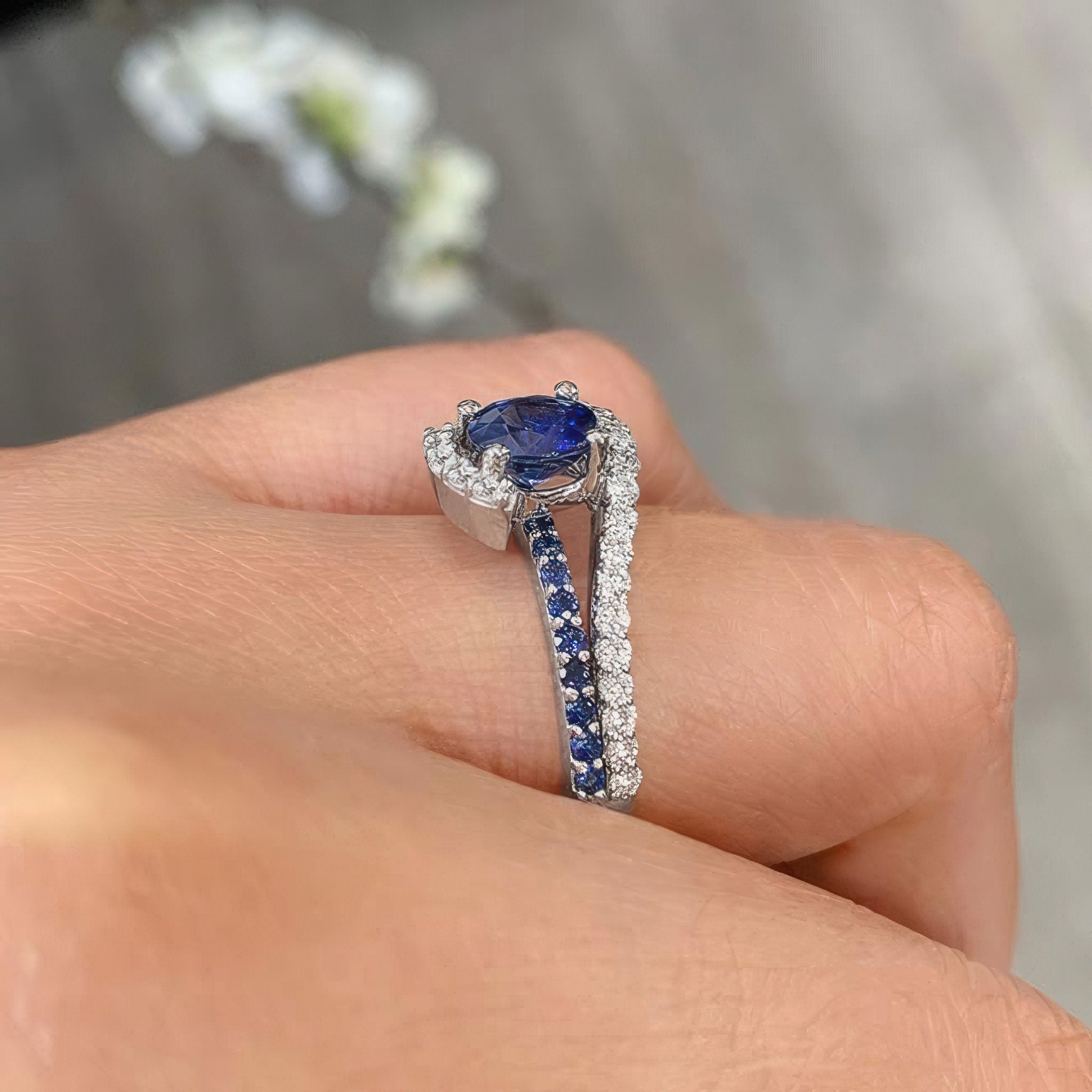 This 1 carat sapphire ring features shared prong set diamonds on the split shank that curves around the prong set round center and a bridge running underneath adorned with shared prong set blue sapphires for a classic yet brilliant look.
