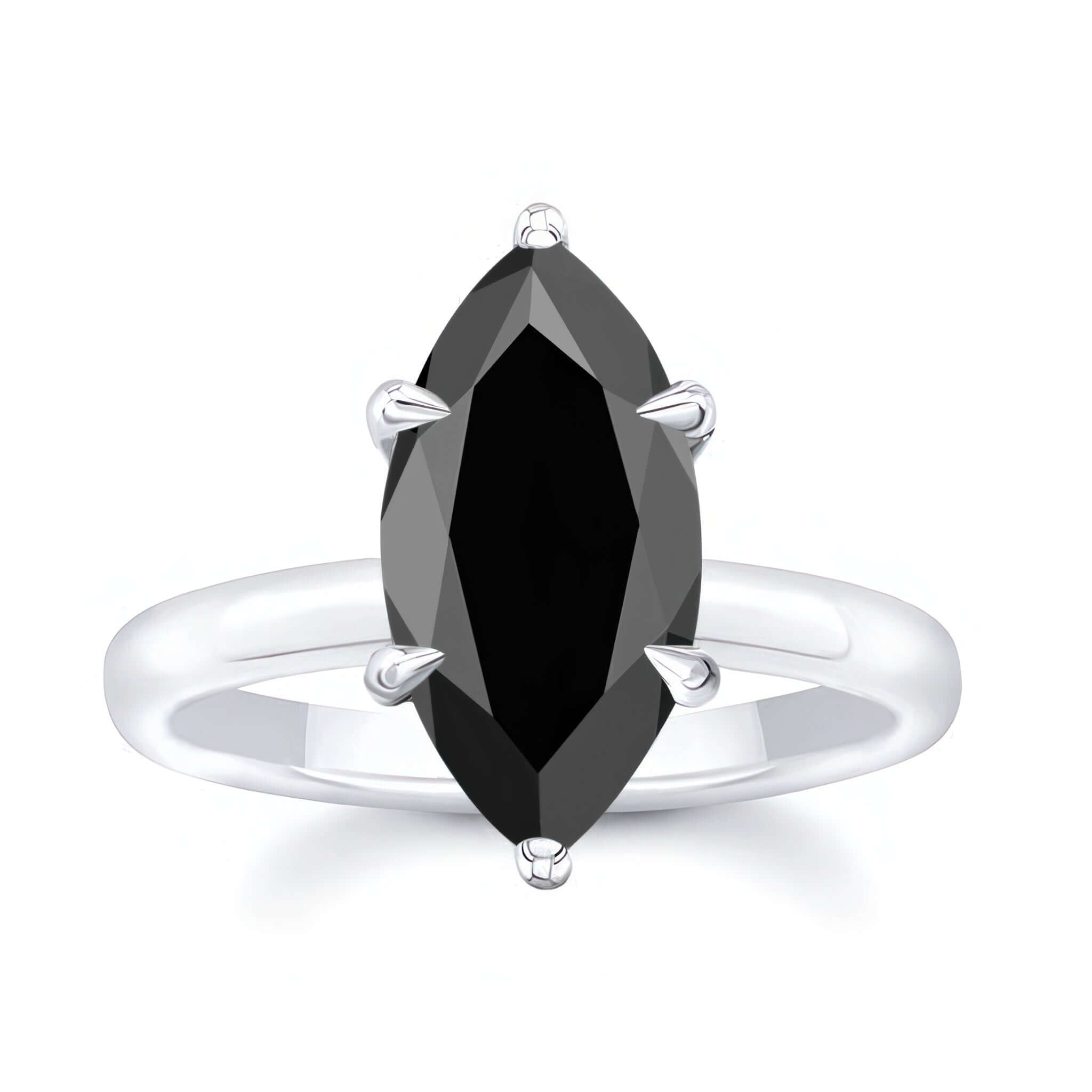A simple 2 carat marquise black diamond solitaire engagement ring featuring a six prong set marquise center for a stunning look of minimalist glamour.