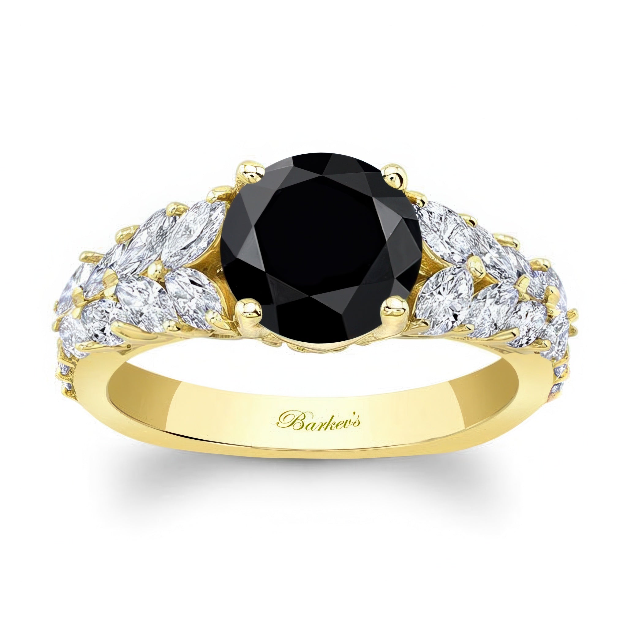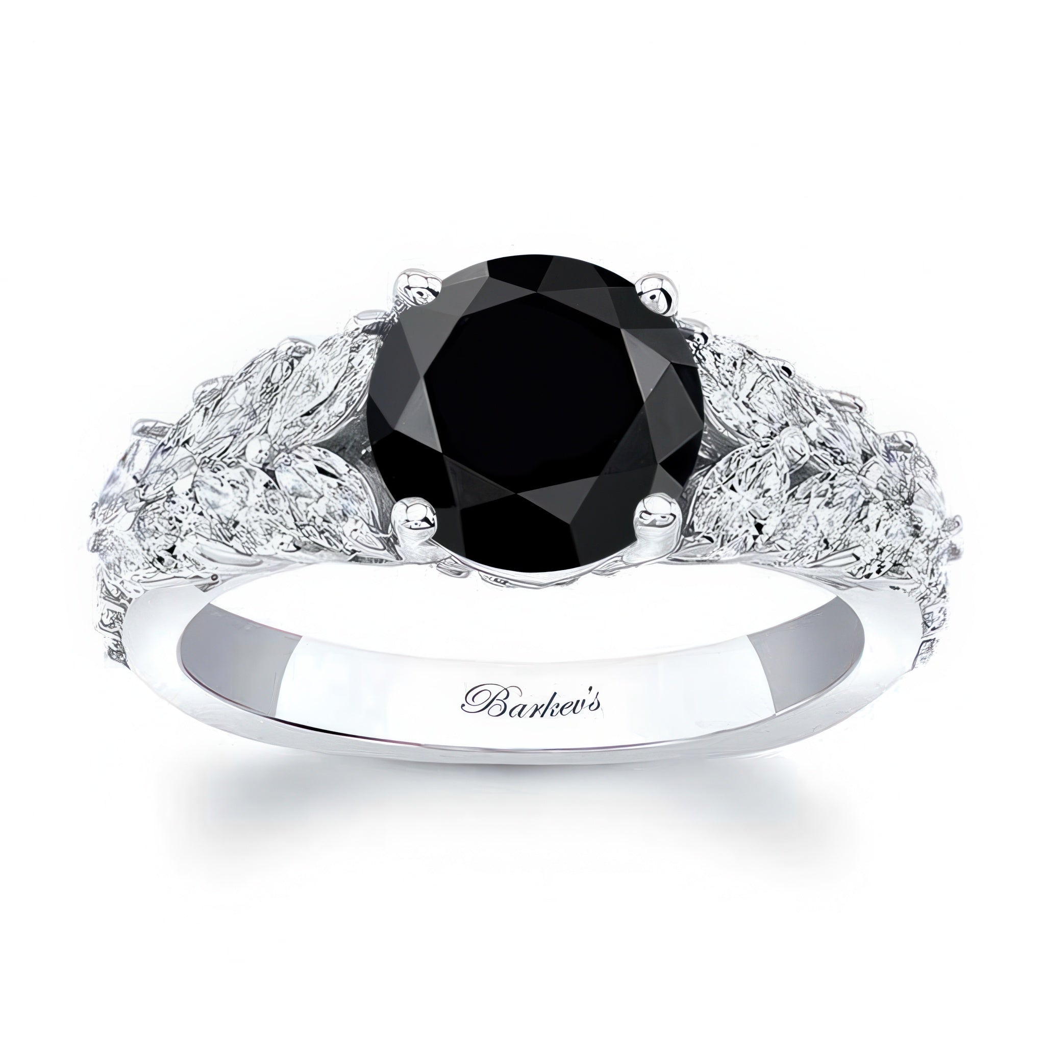 This 2 carat round black and white diamond engagement ring features a prong set center with graduating marquise cut diamonds set on the shank in a chevron pattern and round diamonds right underneath for an elegant eye catching piece.