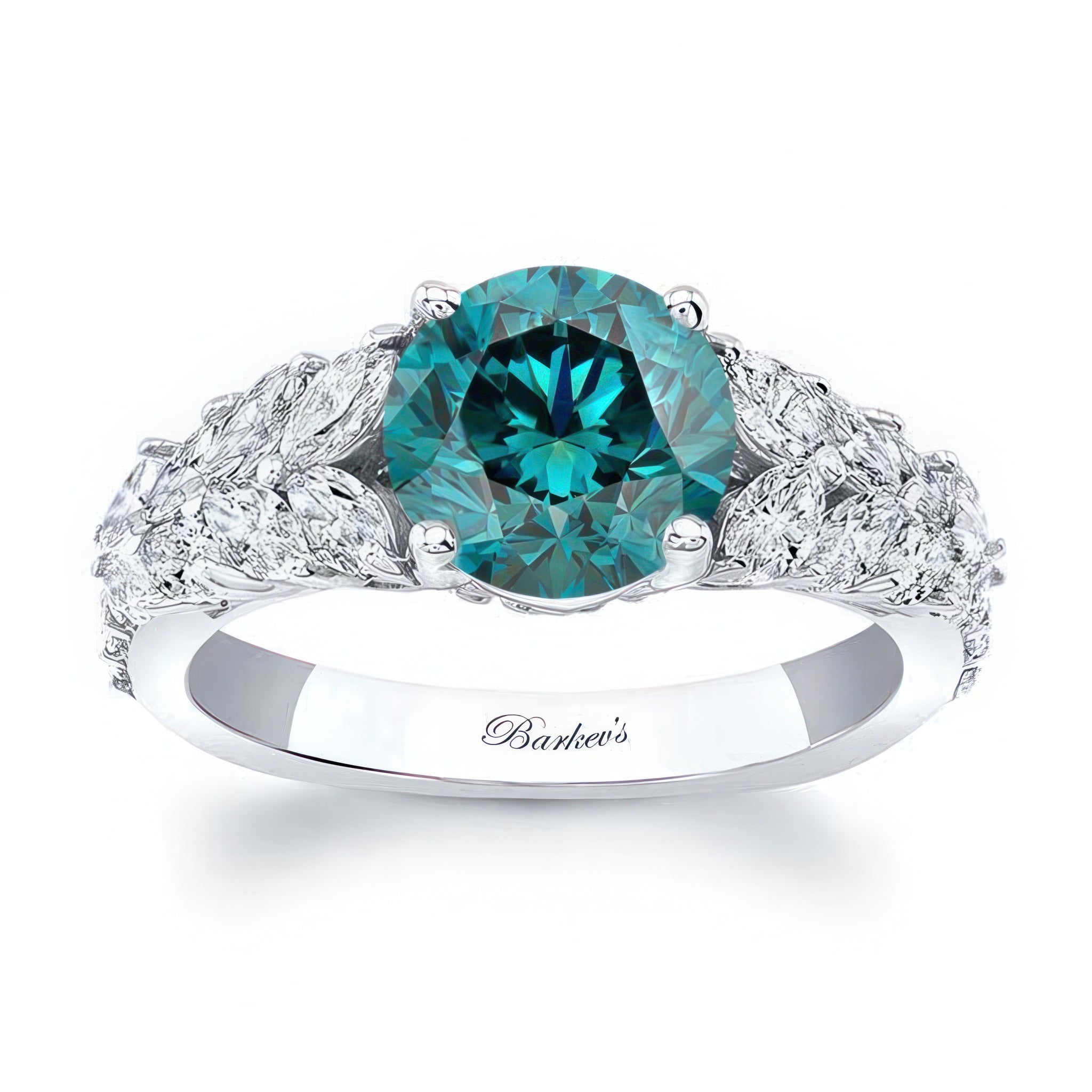 This 2 carat round blue and white diamond engagement ring features a prong set center with graduating marquise cut diamonds set on the shank in a chevron pattern and round diamonds right underneath for an elegant eye catching piece.