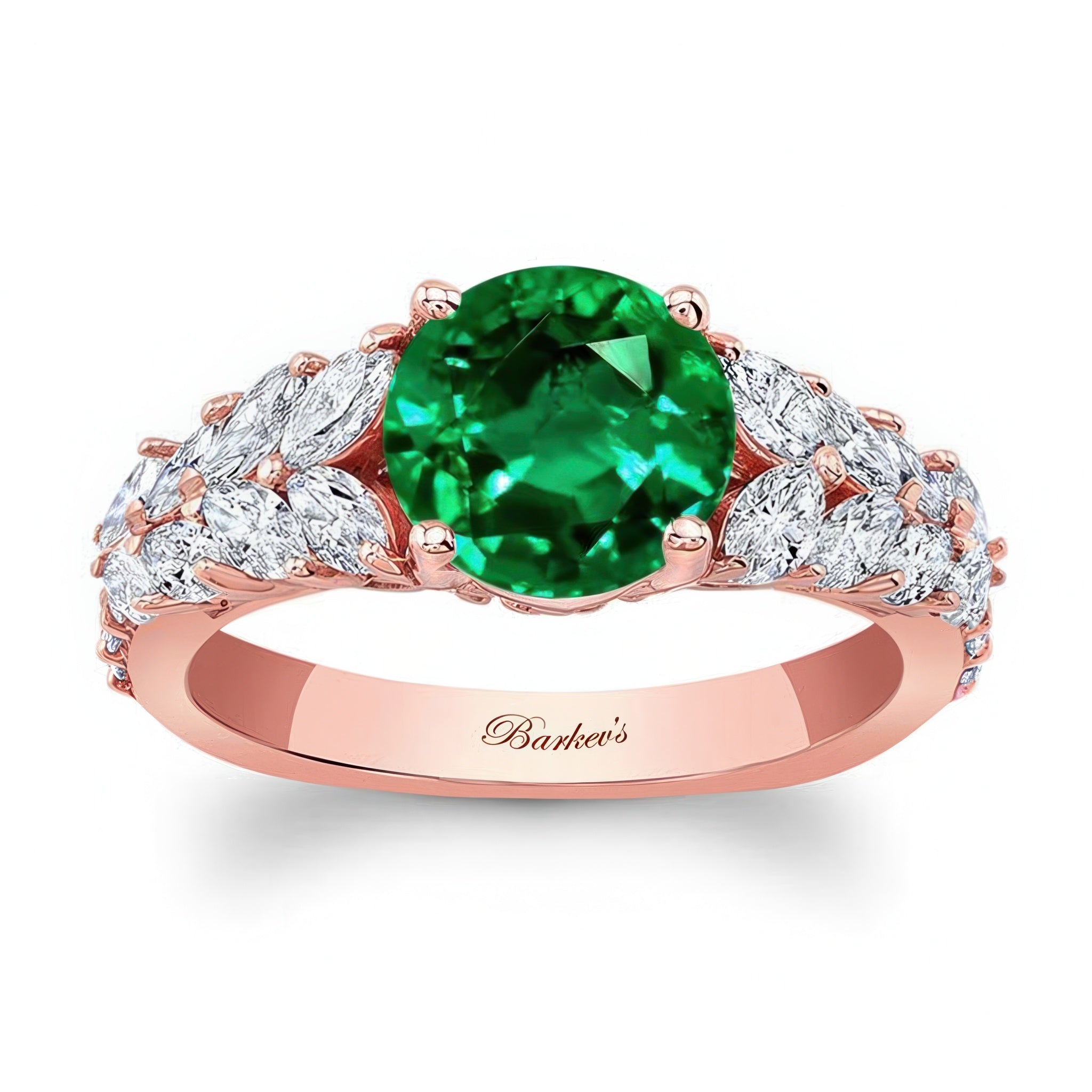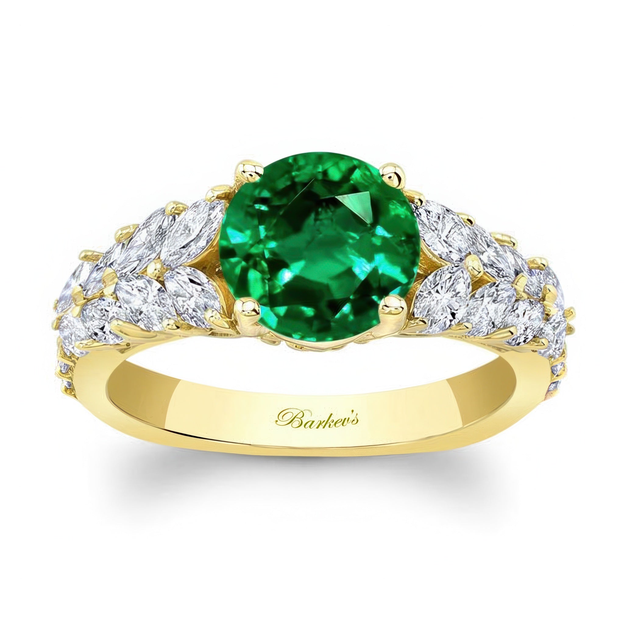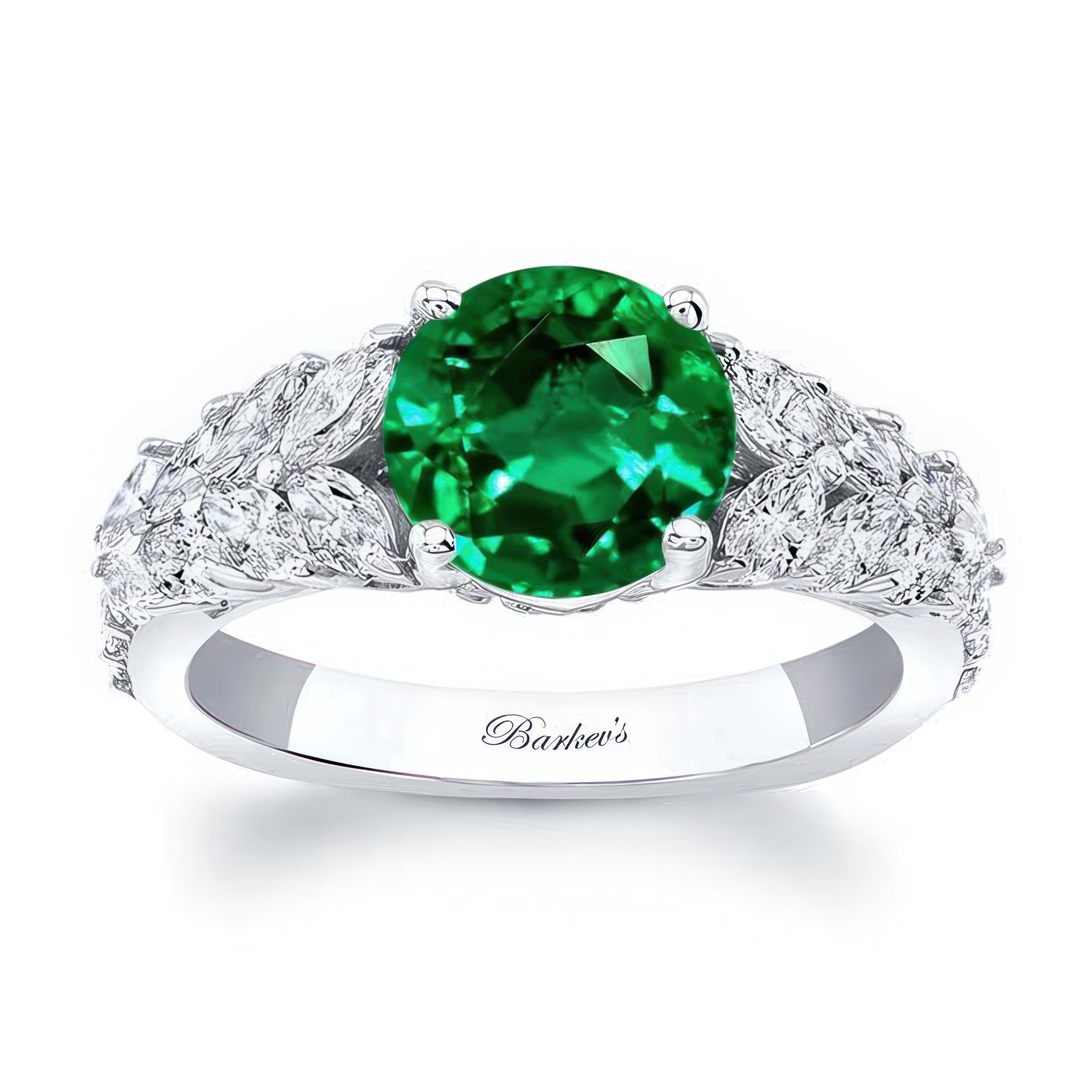 This 2 carat round emerald and diamond engagement ring features a prong set center with graduating marquise cut diamonds set on the shank in a chevron pattern and round diamonds right underneath for an elegant eye catching piece.