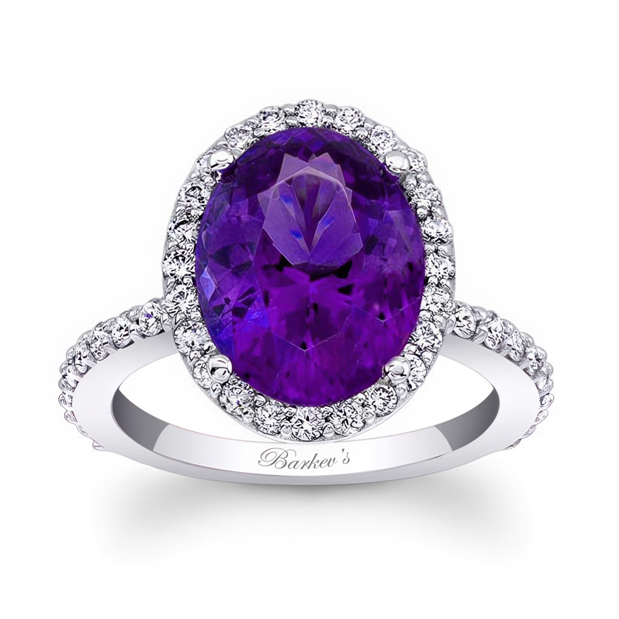 This 3.50 carat oval amethyst ring is stunning and in vogue. Featuring a halo of diamonds surrounding the large center and cascading down the dainty shank for a look of sheer elegance.