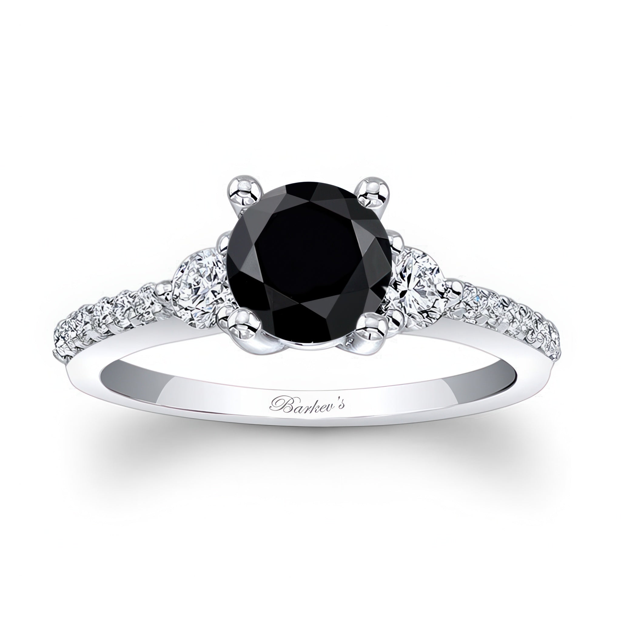 This 3 stone black and white diamond engagement ring features diamonds flanking the prong-set round center. The dainty shoulders are adorned with shared prong set diamonds adding the finishing touch of elegance to this ring.