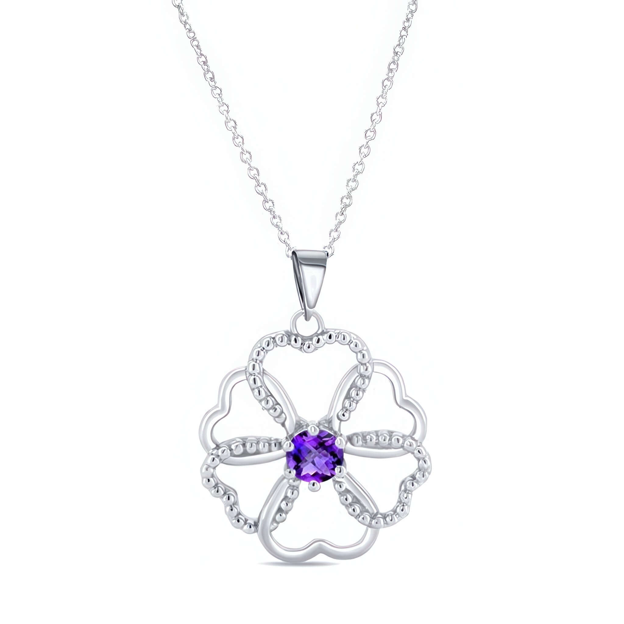 A beautiful amethyst silver intertwined hearts necklace featuring intertwined heart shapes and a half carat amethyst center.