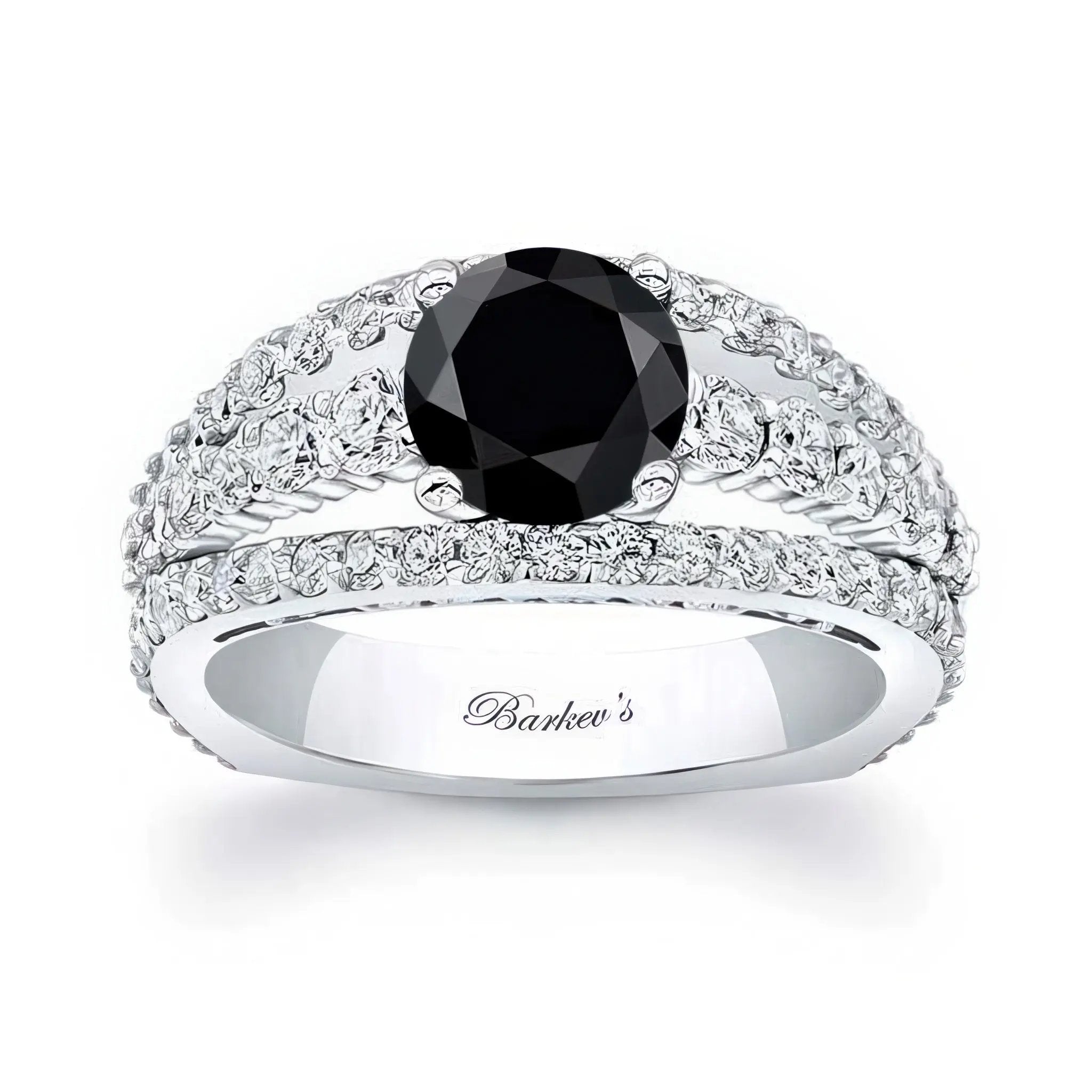 This beautiful art deco black and white diamond ring features a prong set round center with a split shank sporting shared prong set diamonds and an intricate flower and vine design visible on the side view.