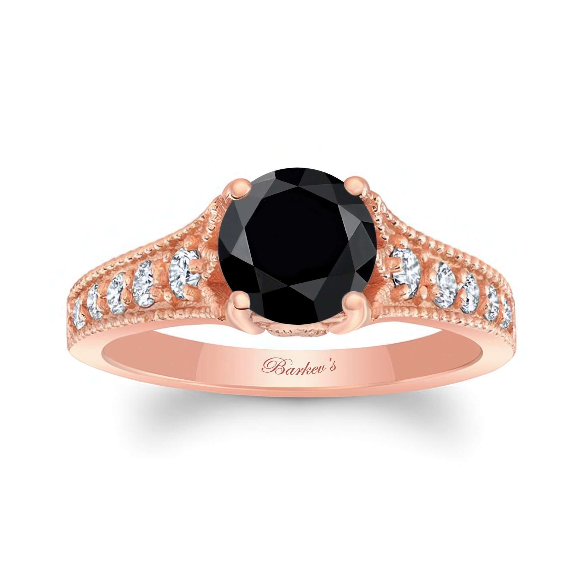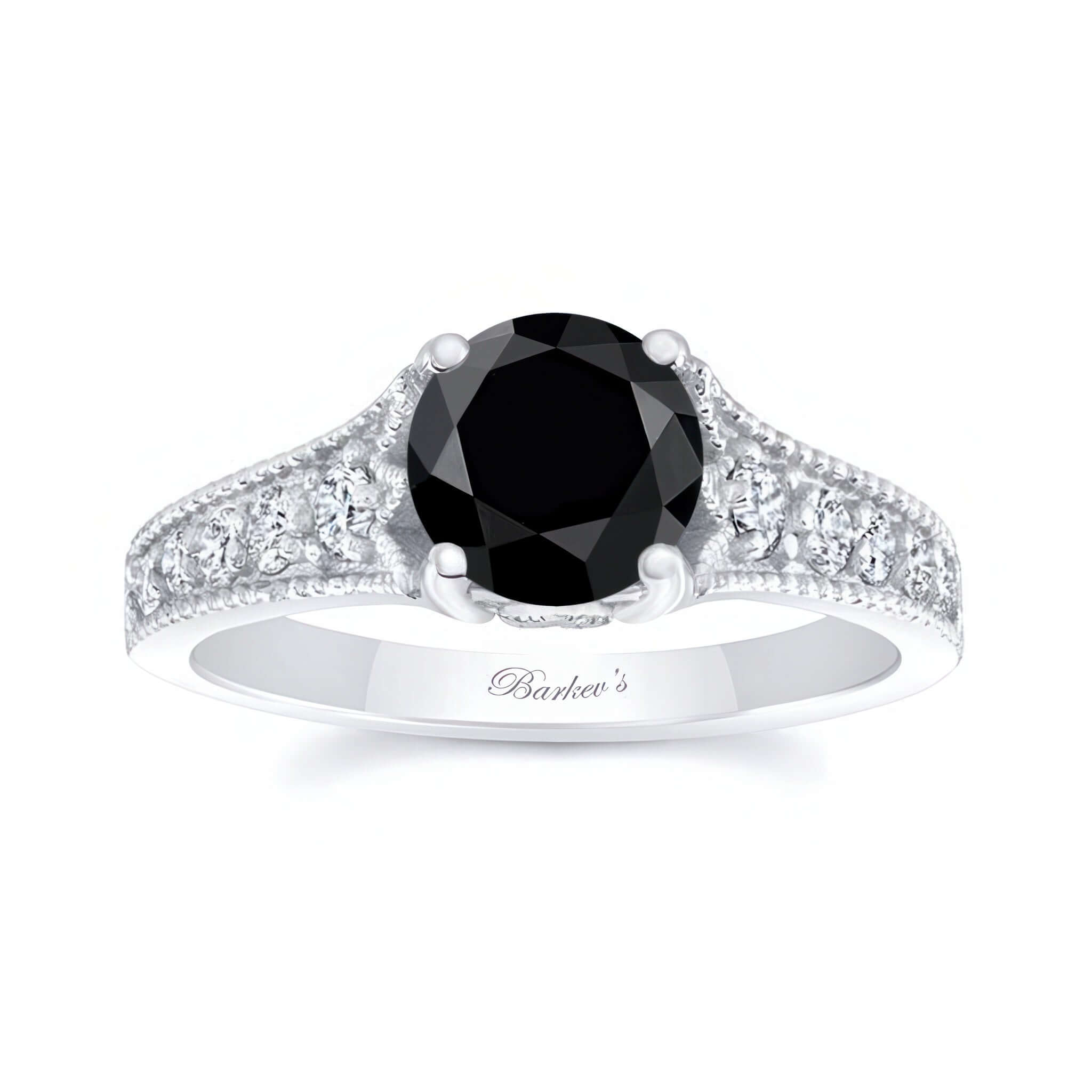 This beautiful black and white diamond vintage ring features a prong set round center with shared prong set diamonds on the sides and a milgrain finish for a vintage look.