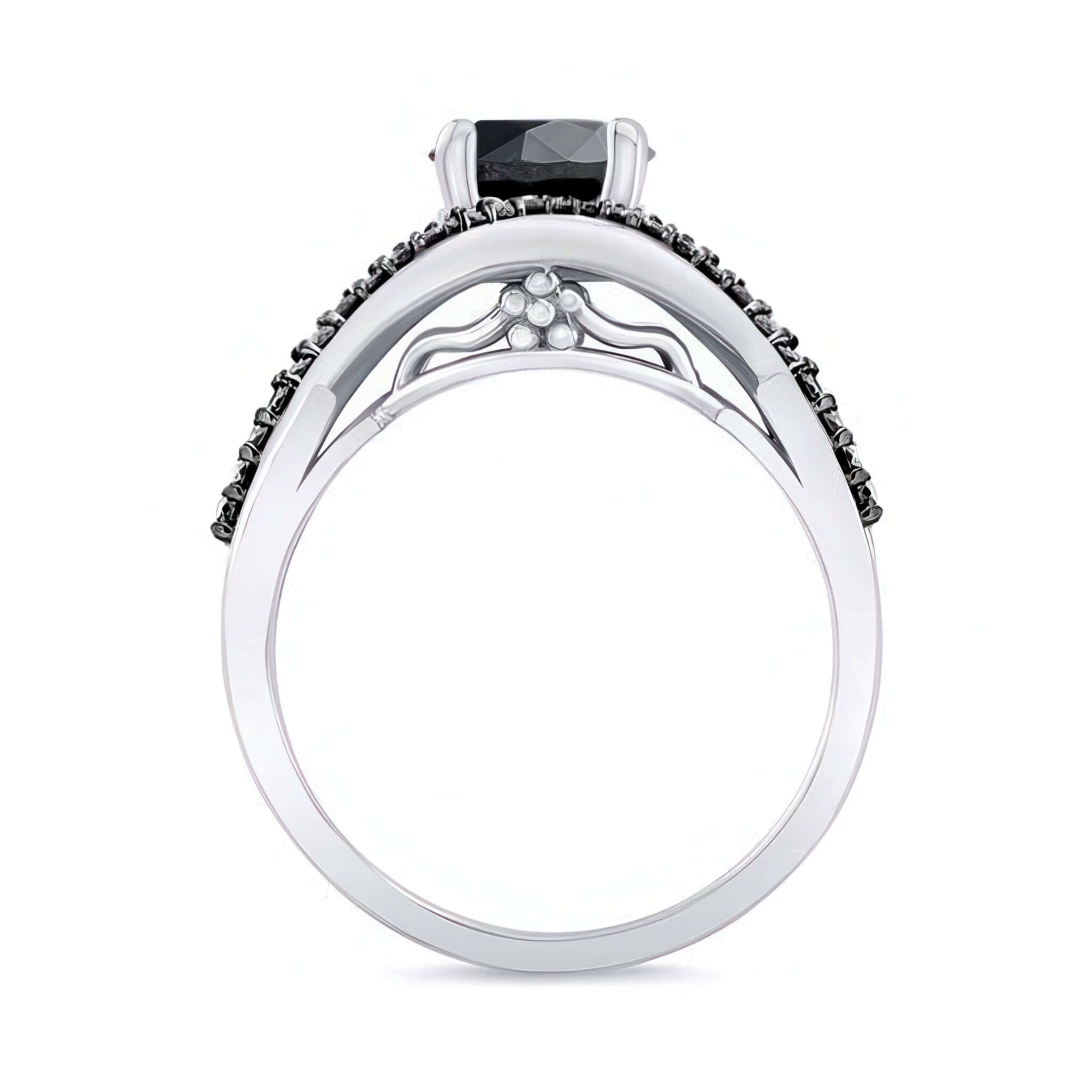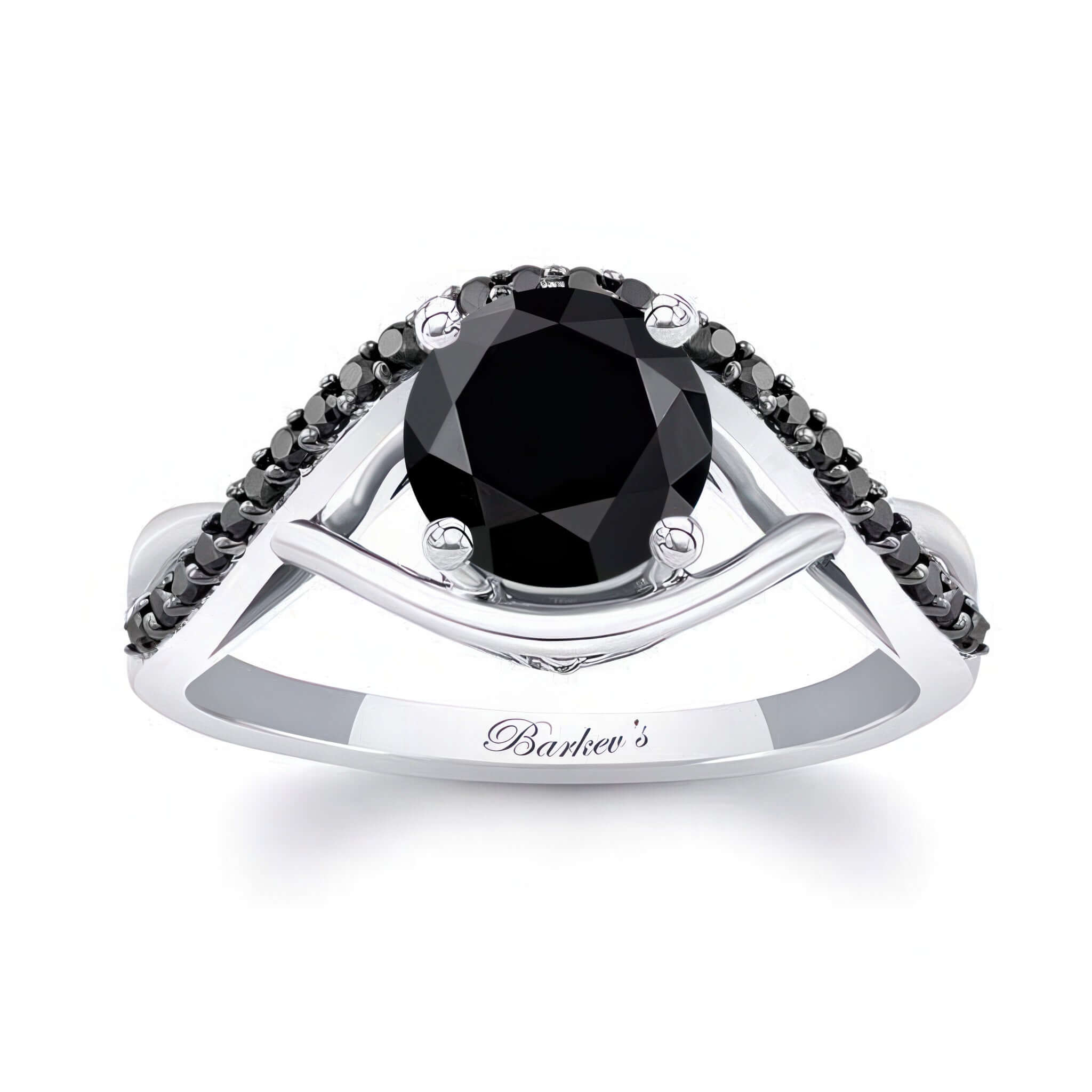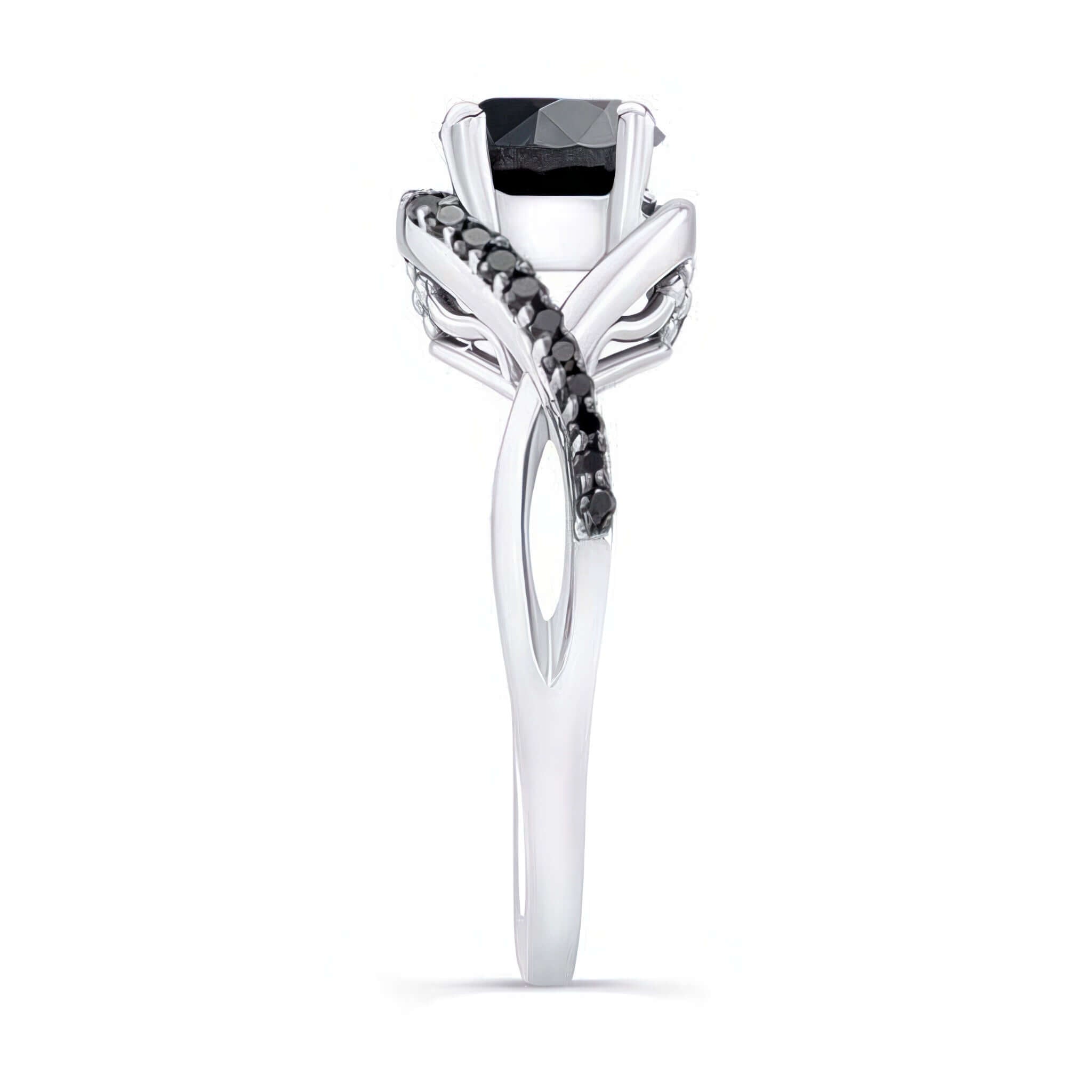A beautiful black diamond criss cross ring featuring a curving shank, shared prong set black diamond melees and a round center stone