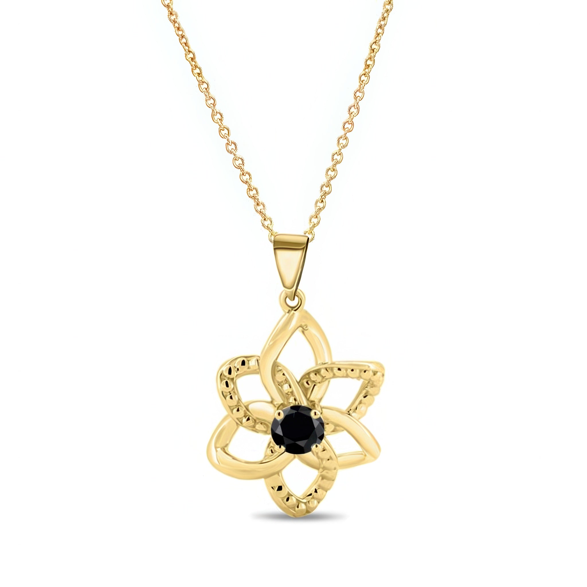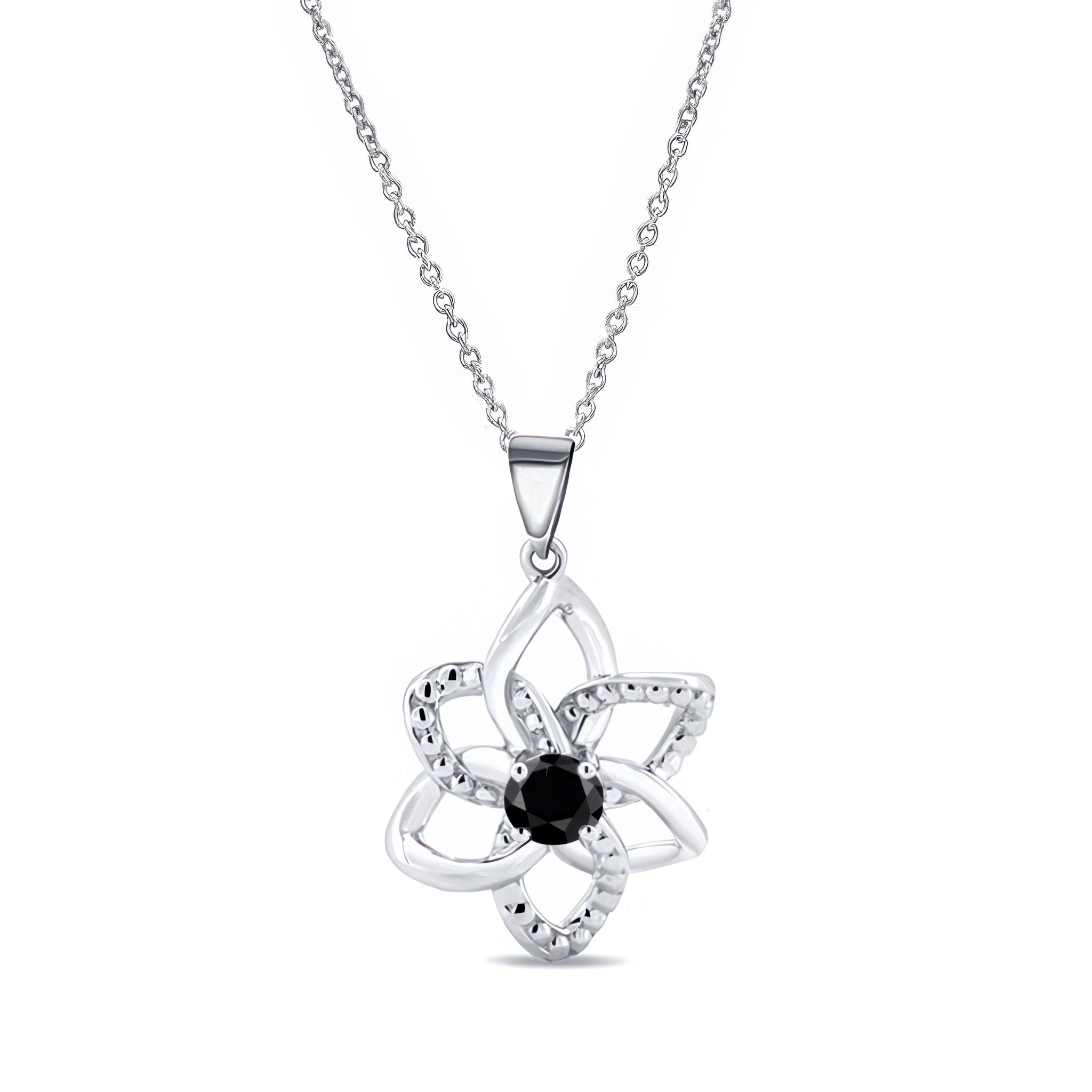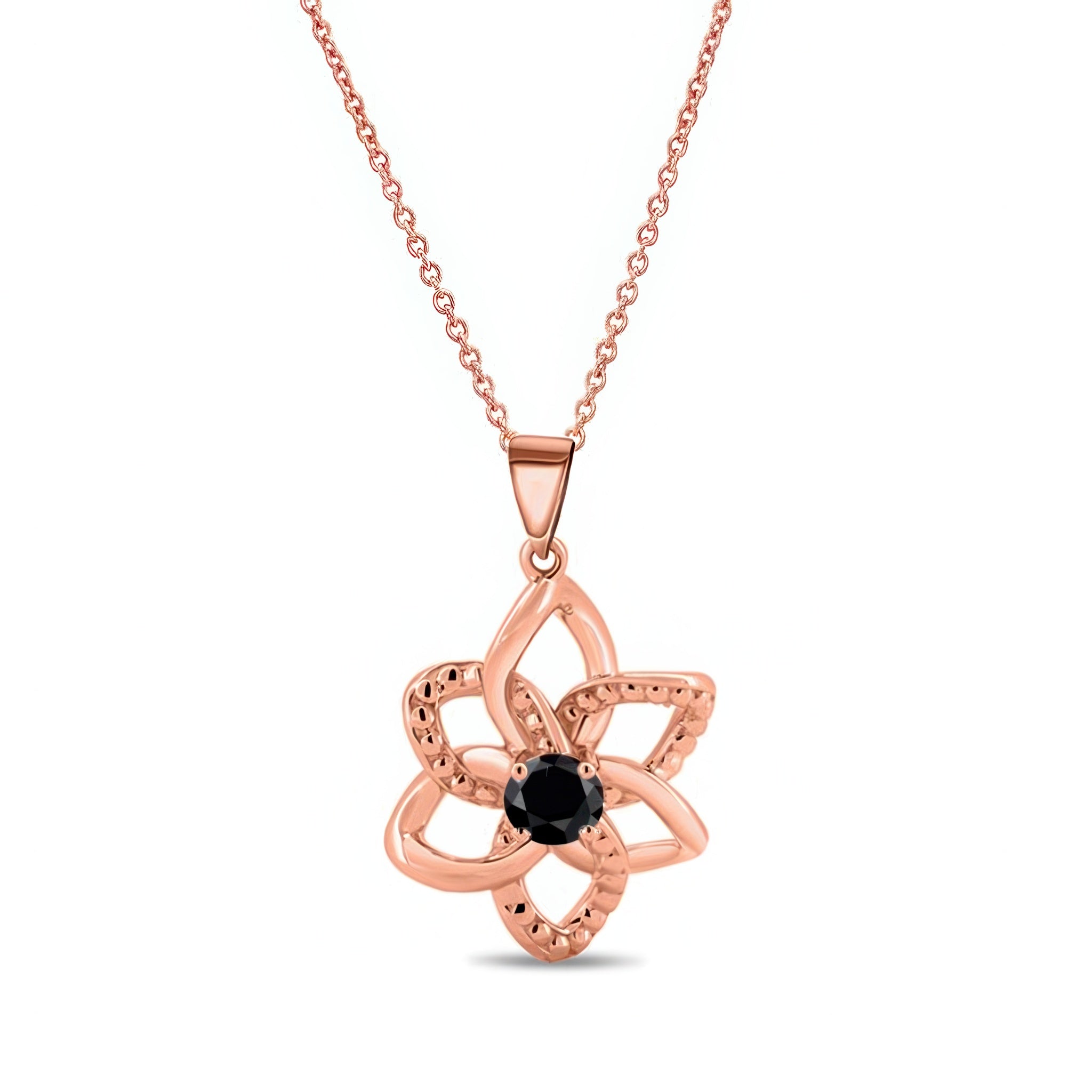 A beautiful black diamond flower necklace featuring intertwined leaf shapes and a half carat black diamond center.
