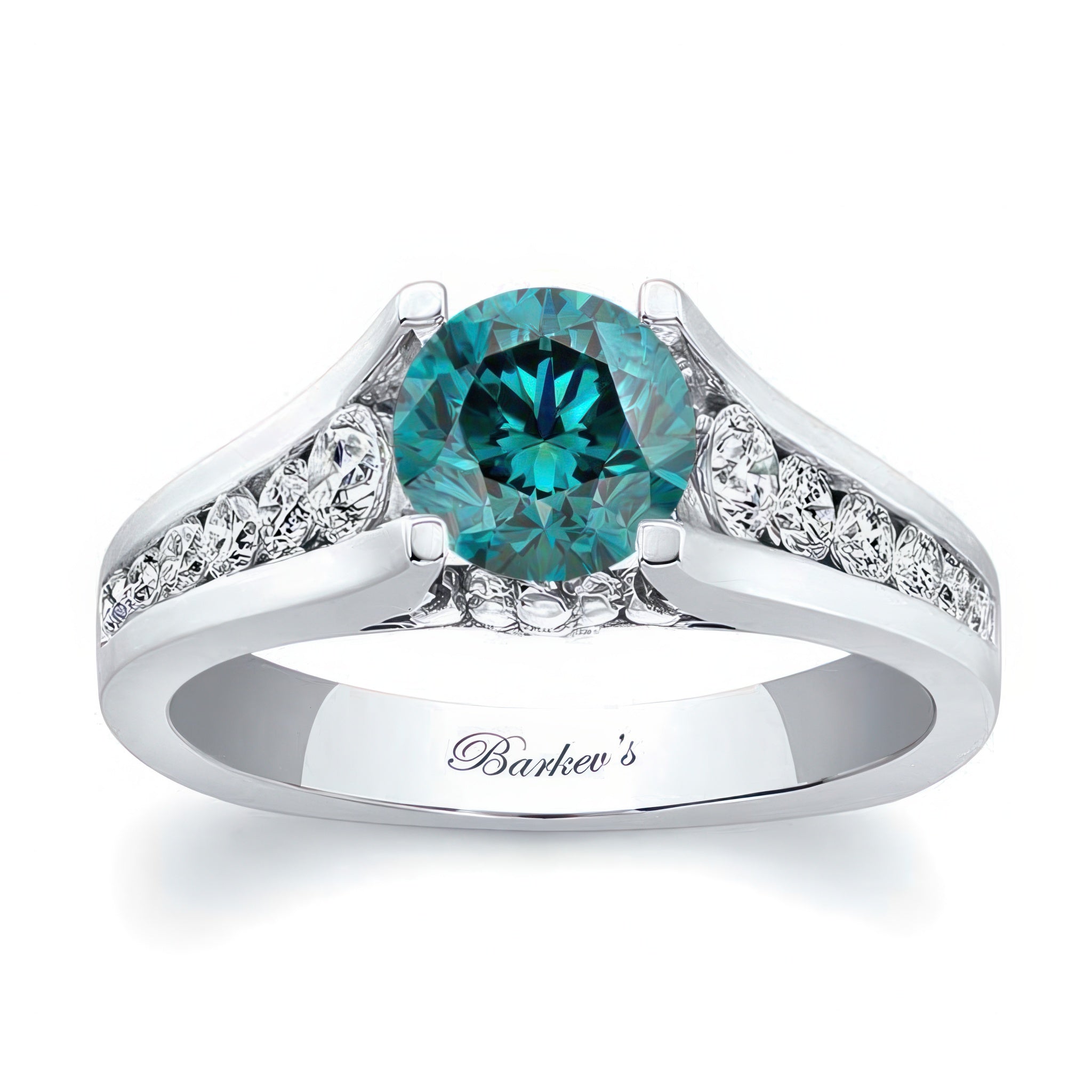 This cathedral blue and white diamond ring features a prong set round center with channel set diamonds graduating down the open shank and small flower accents on the sides for an elegant finish.