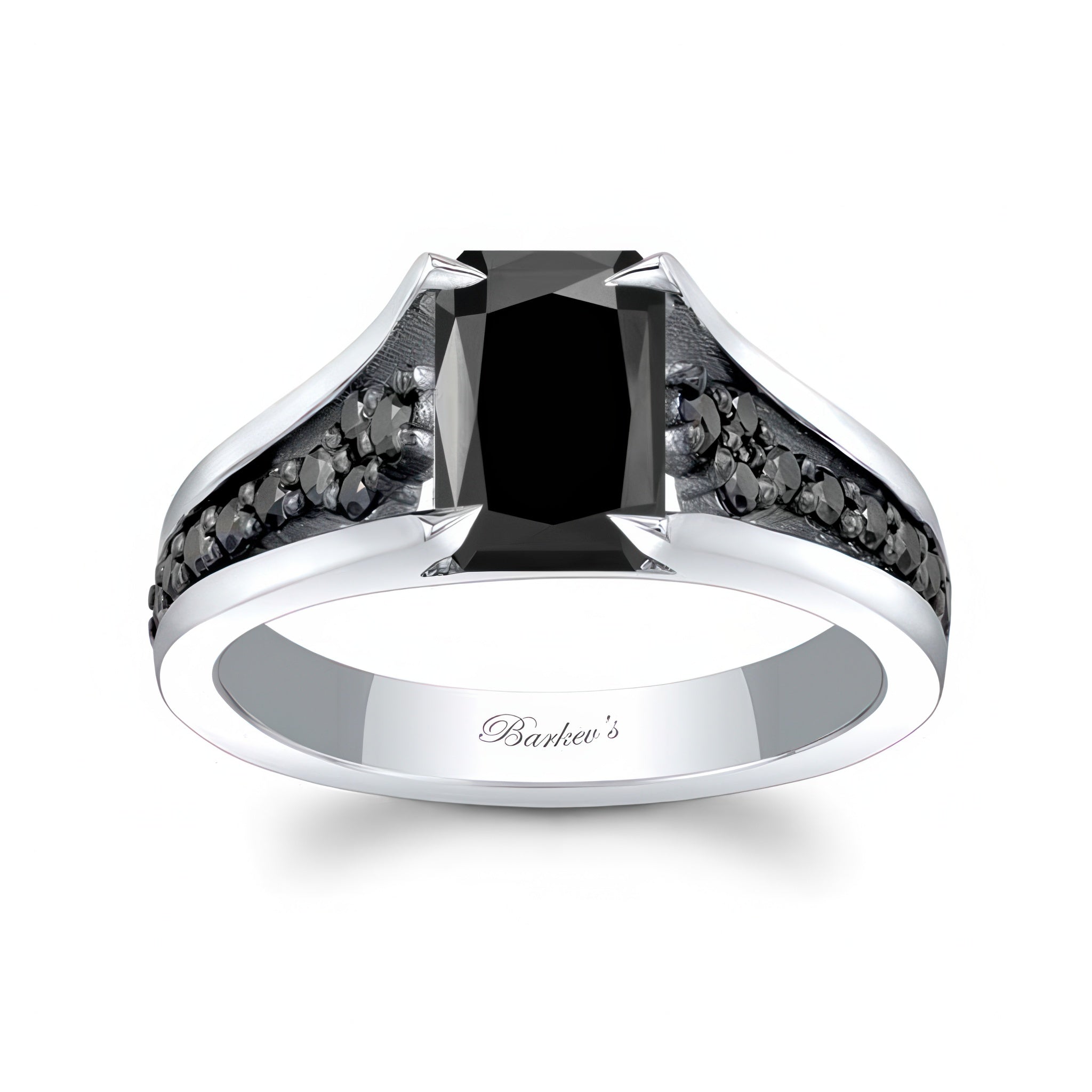 This cathedral radiant cut black diamond ring sports a prong set radiant cut center with shared prong set black diamonds cascading down the shoulders for a classic clean look of sophistication.