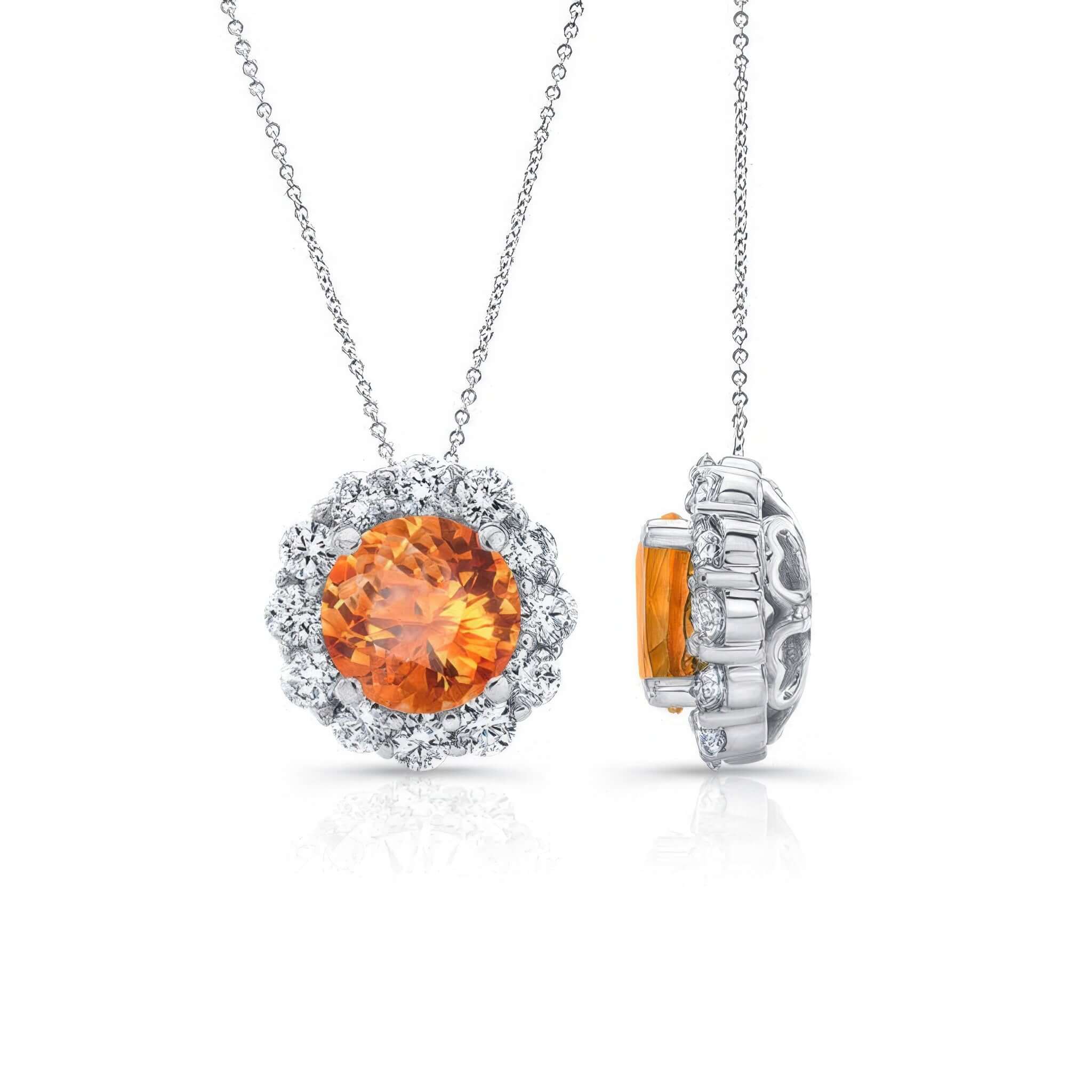A stunning citrine and diamond halo necklace featuring a prong set half carat round citrine center adorned with a halo of shared prong set diamonds for a touch of sophistication.