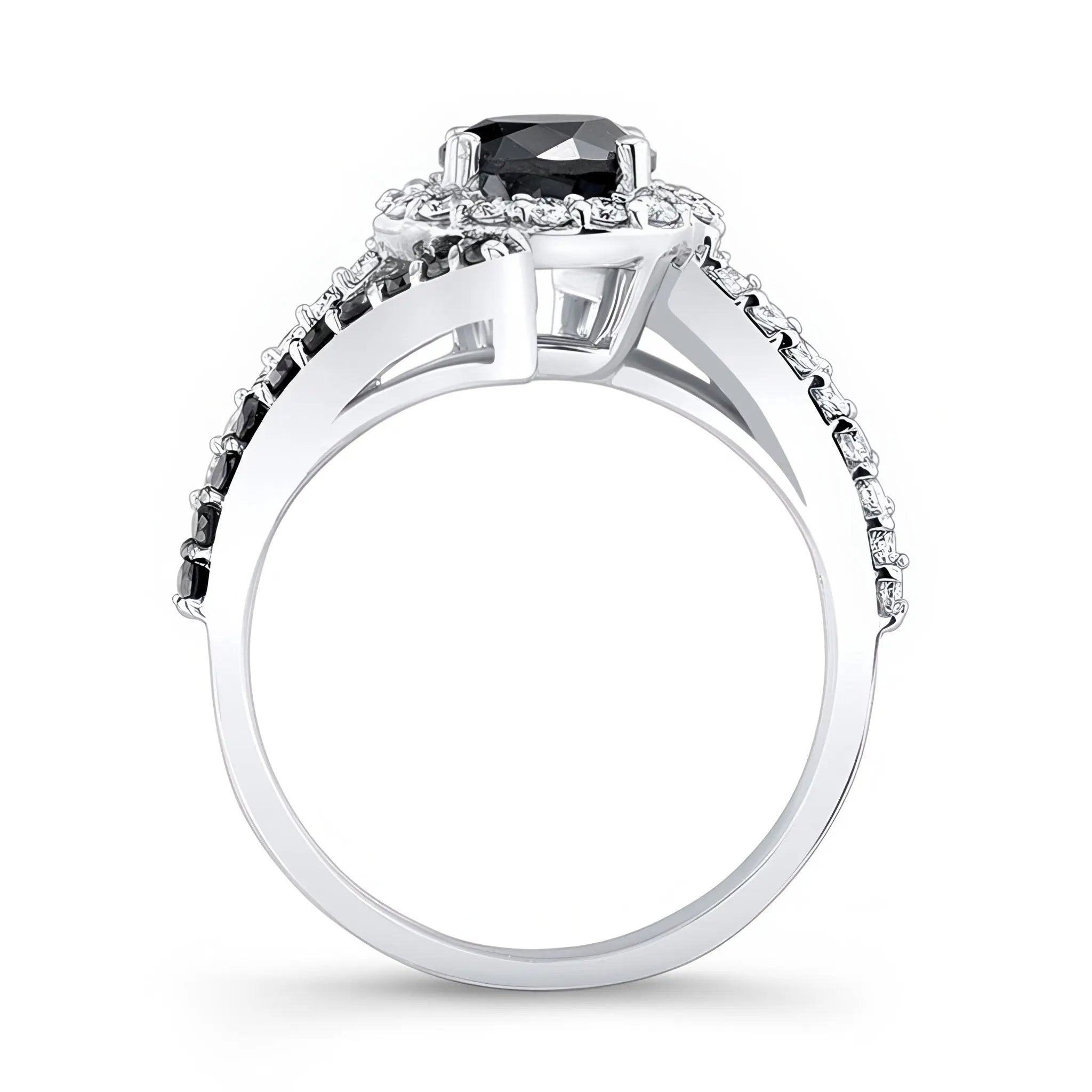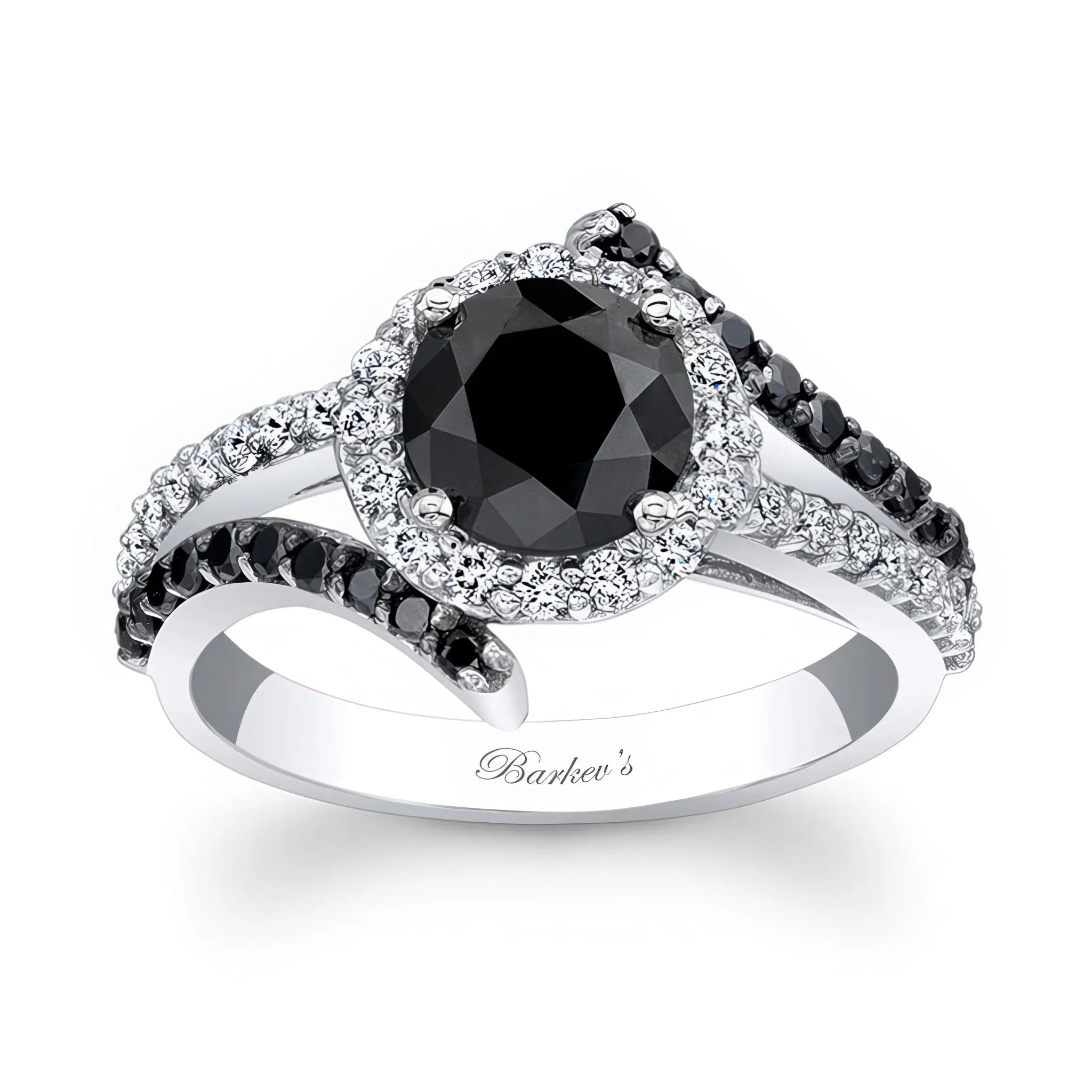 This contemporary black diamond engagement ring features a prong set round center encircled with a diamond halo and a split shank adorned with shared prong set black and white diamonds for an added touch of elegance.