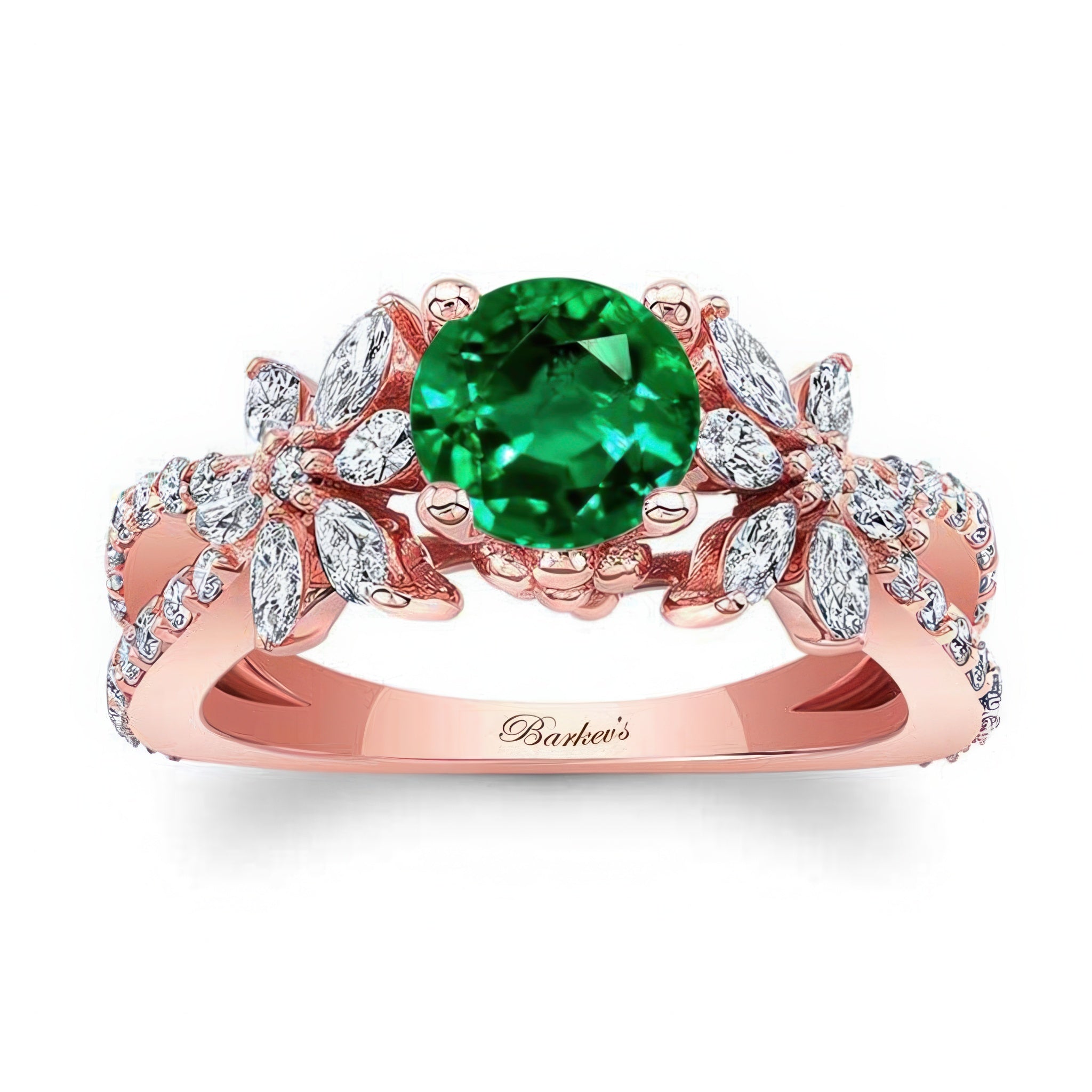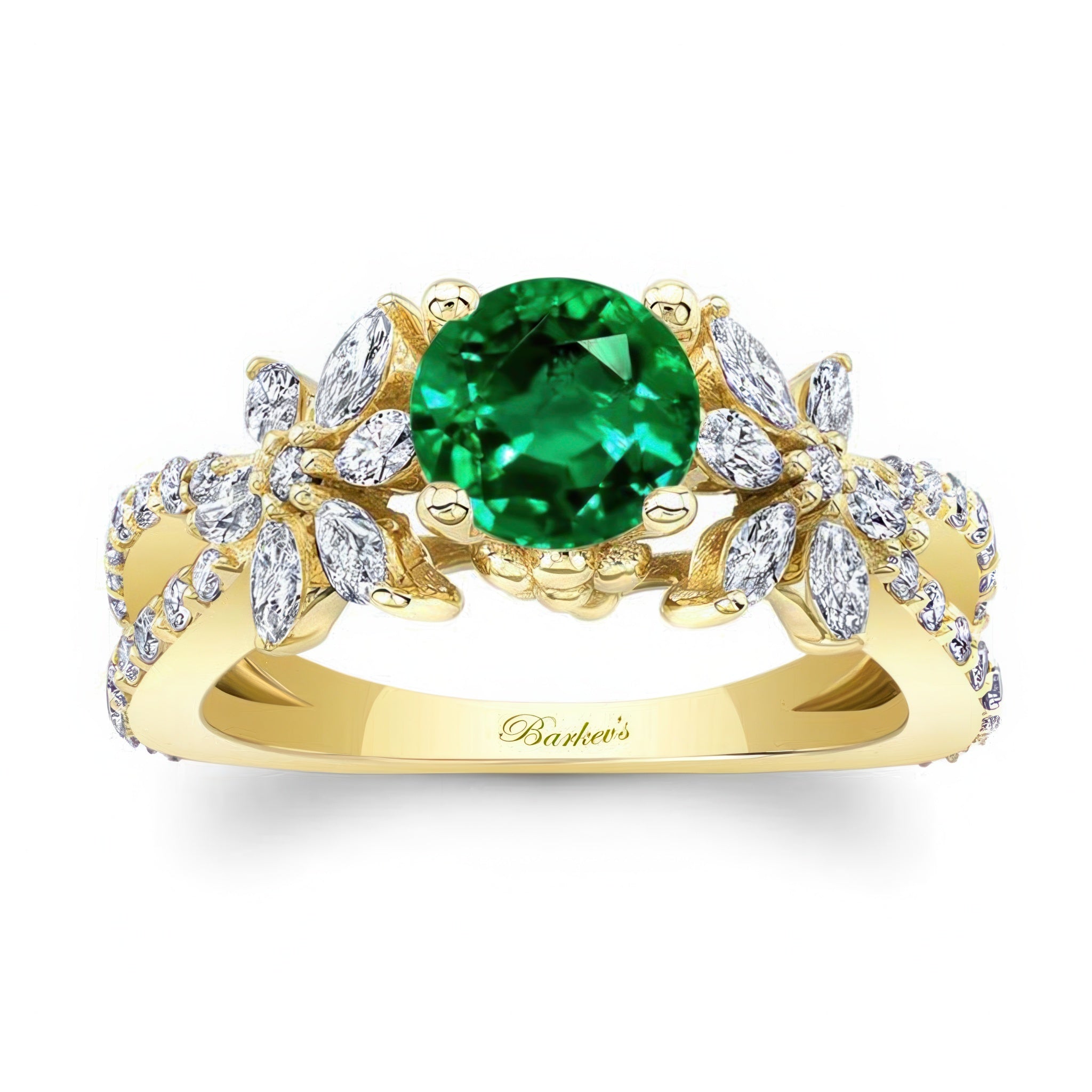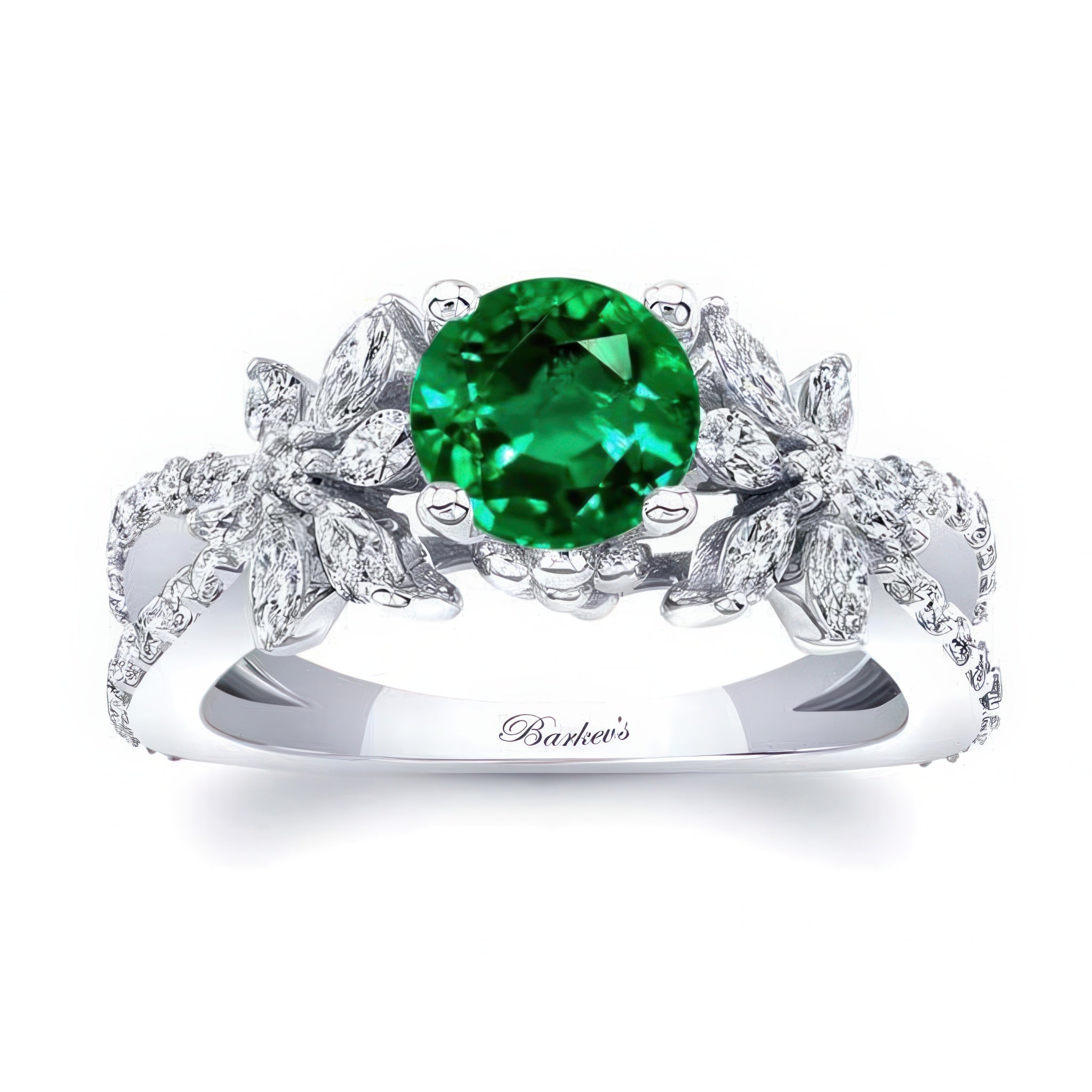 This unique emerald and diamond flower ring features a prong set round center with marquise cut diamonds gracing each shoulder like a flower in full bloom and diamond melees adorn the ridges of the shank for a finishing touch of elegance.
