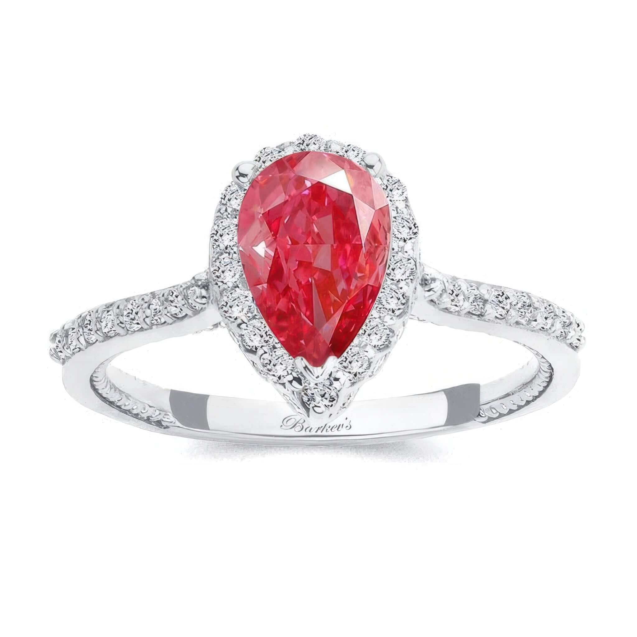 A beautiful pear shaped lab grown pink diamond halo ring featuring a teardrop center surrounded by diamonds with melees flowing down the shank. The profile view reveals a second set of diamonds surrounding the center from underneath with two bezel set diamonds that give this ring a distinct look.