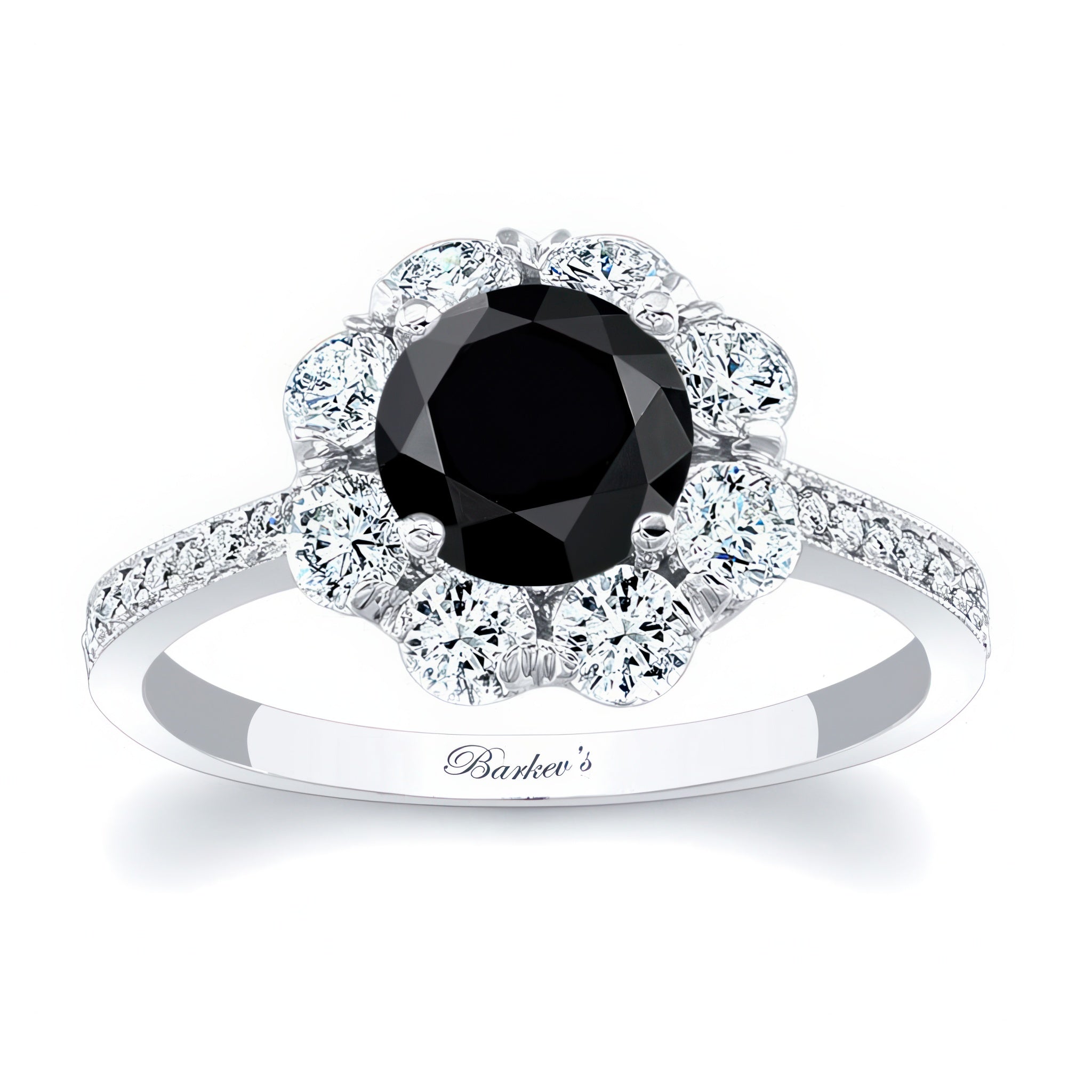 This flower halo black and white diamond engagement ring is stunning and in vogue featuring shared prong set diamonds encircling the low profile round center and pave set diamonds cascading down the dainty shank for a look of sheer elegance.
