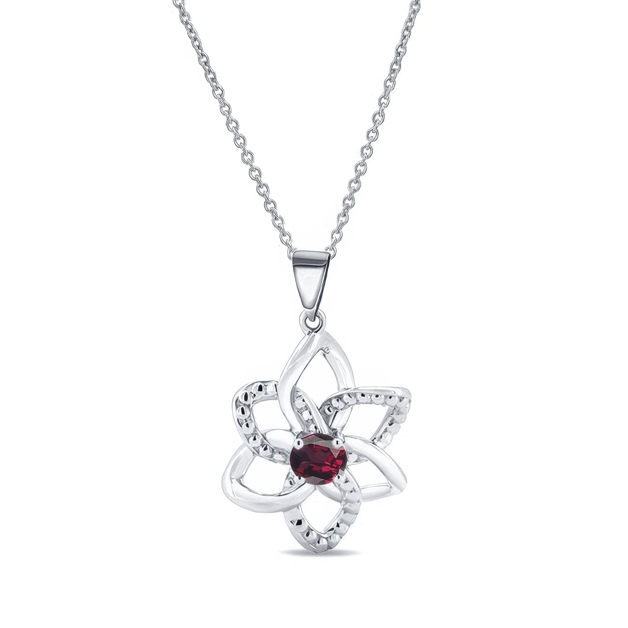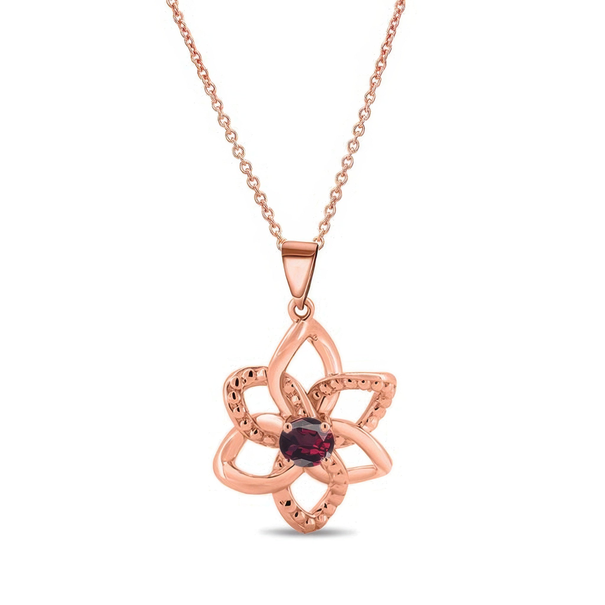 A beautiful garnet flower necklace featuring intertwined leaf shapes and a half carat garnet center.