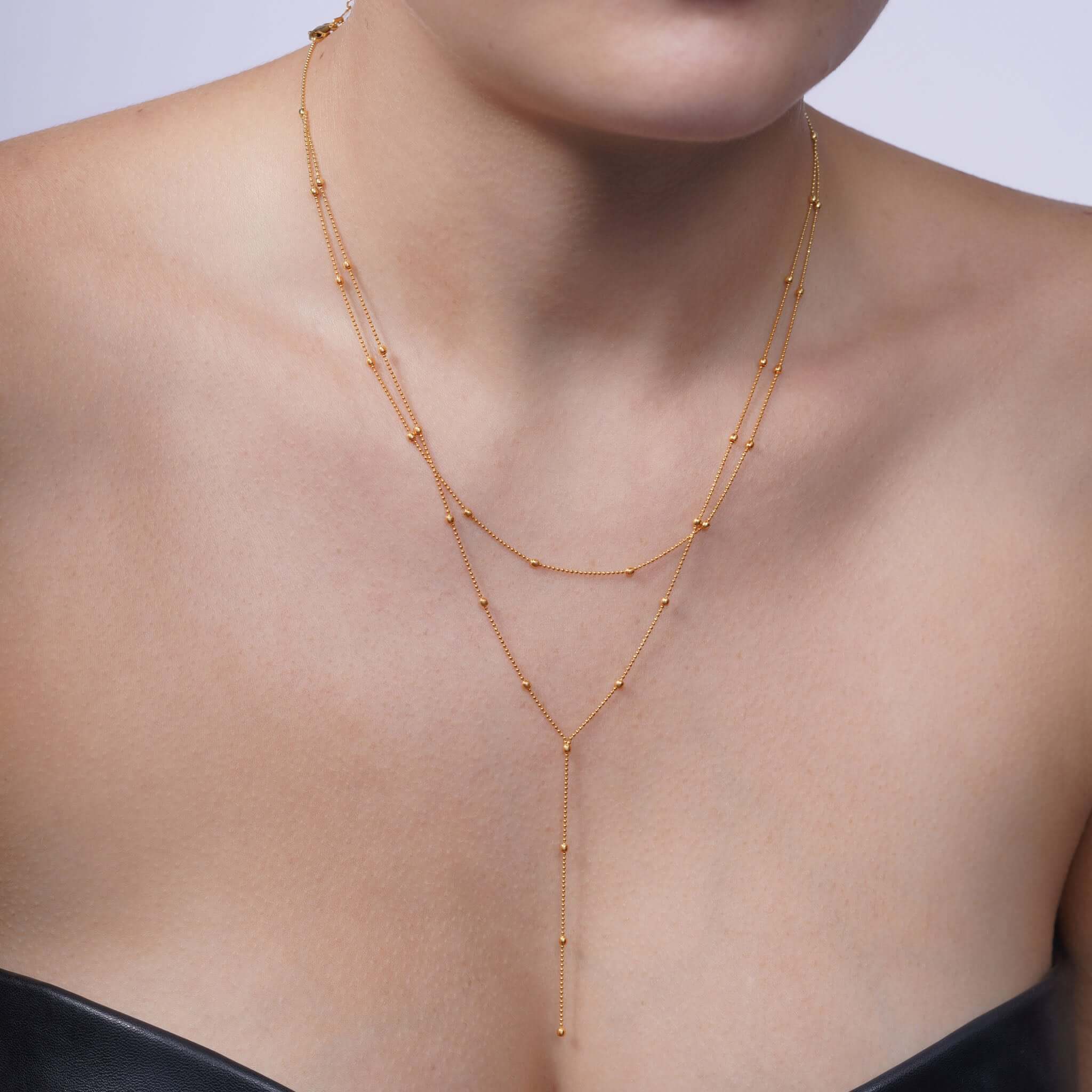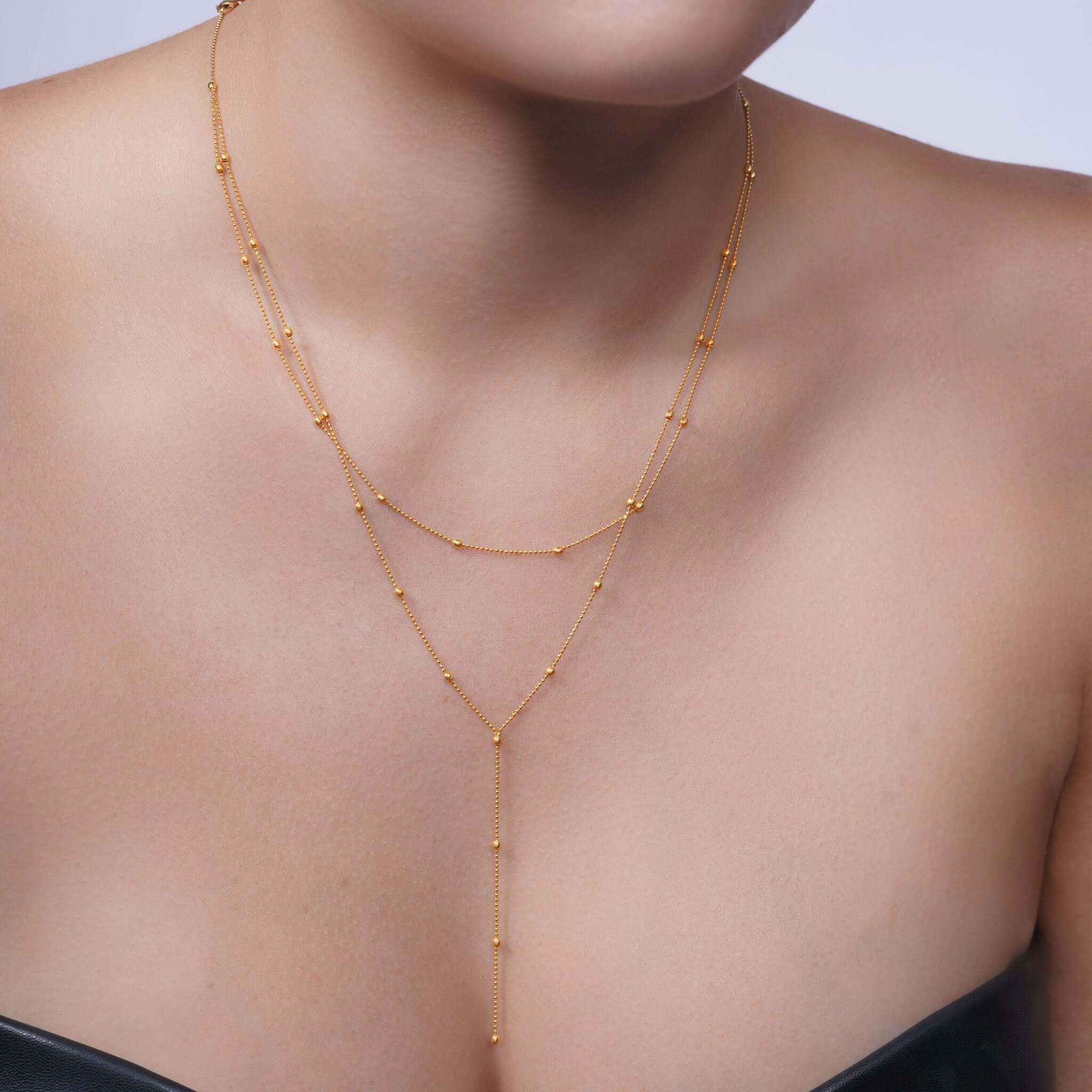 Elevate your elegance with this Gold Bead Dangle Necklace, featuring a distinctive Y shape that gracefully frames the neckline. Expertly crafted with a balanced mix of small and large golden beads, it offers a refined texture and dynamic visual appeal. This necklace adds a sophisticated accent to both formal and casual ensembles, making it an indispensable piece in any jewelry collection.