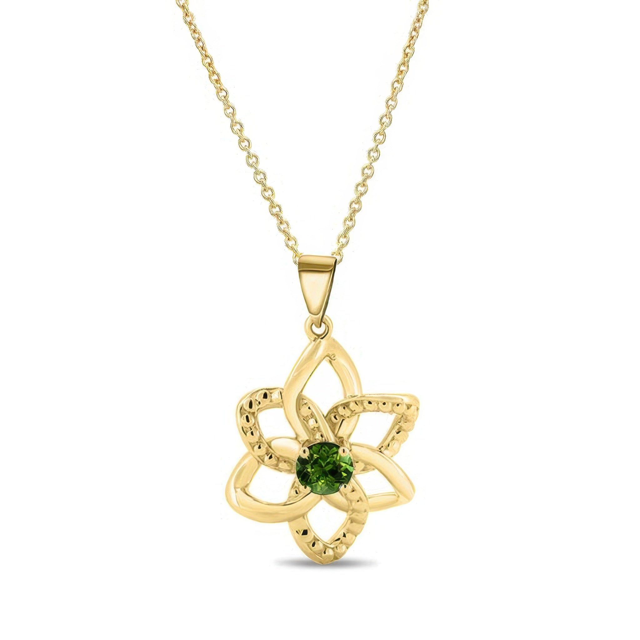 A beautiful green tourmaline flower necklace featuring intertwined leaf shapes and a half carat green tourmaline center.