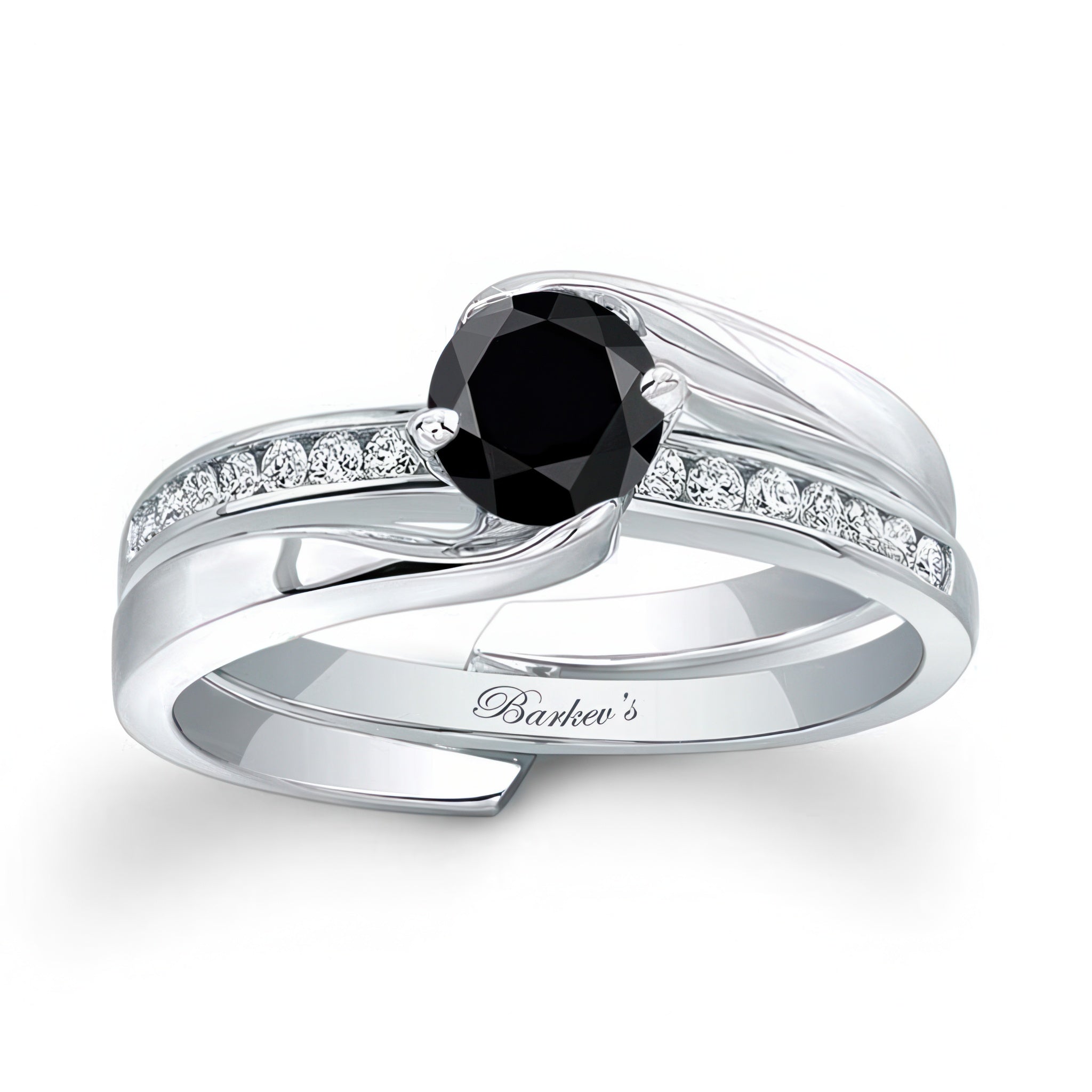Capture the moment with this half carat black and white diamond interlock bridal set featuring a half prong half channel set round center with an interlocking channel set diamond wedding band.
