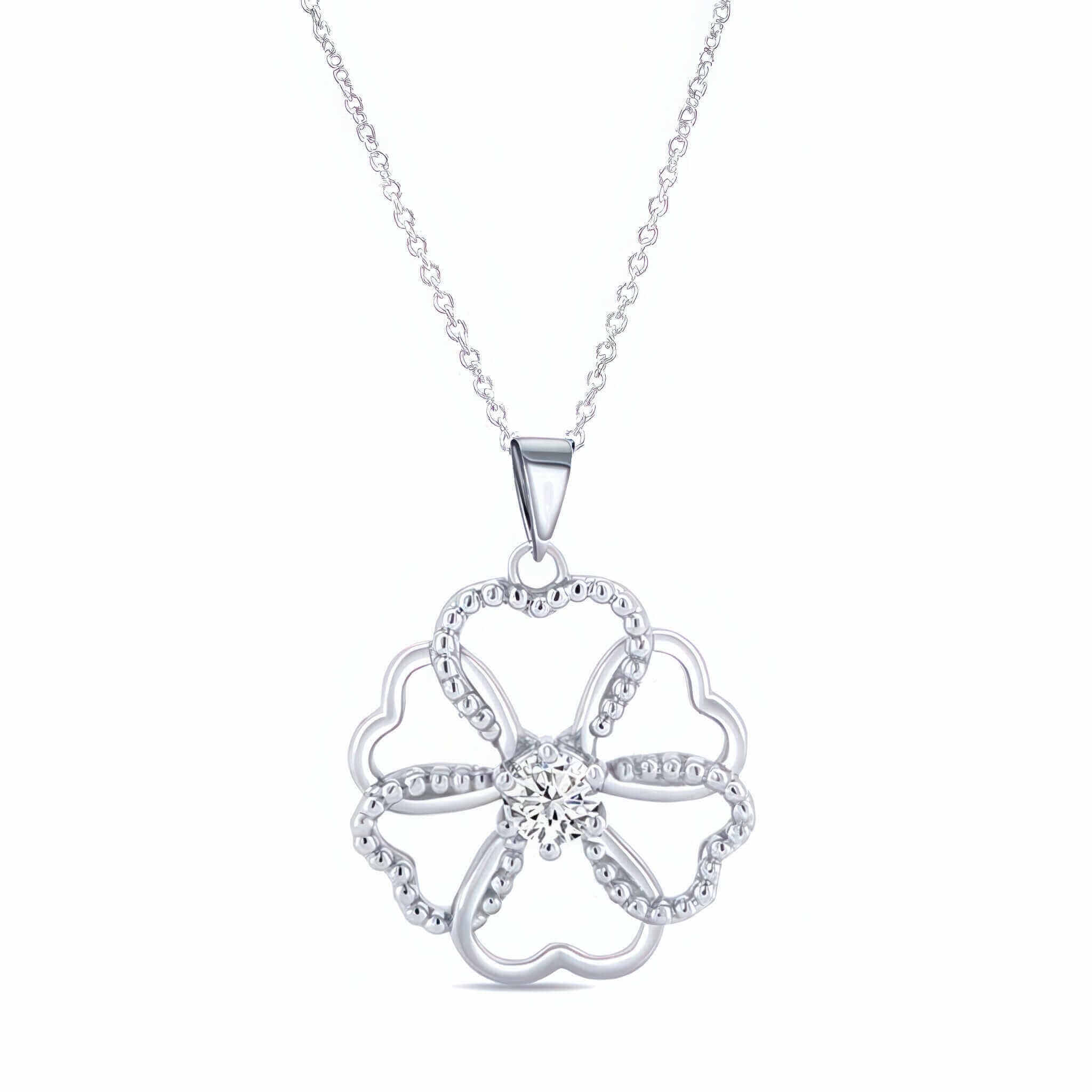 A beautiful lab diamond silver intertwined hearts necklace featuring intertwined heart shapes and a half carat lab diamond center.