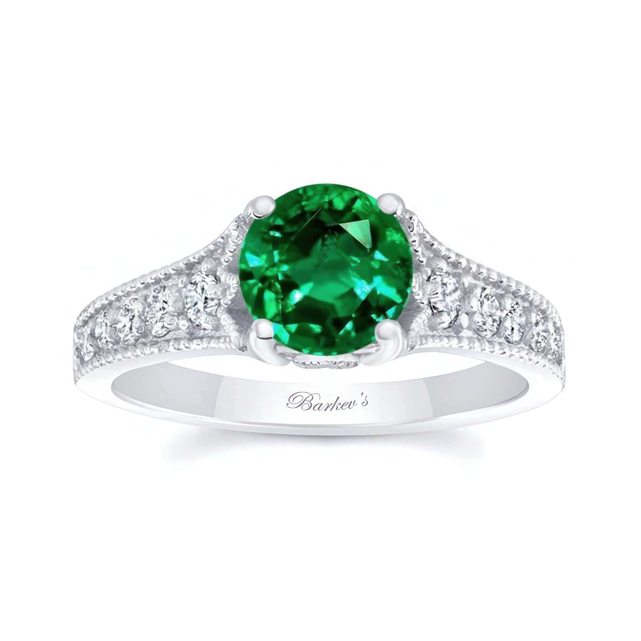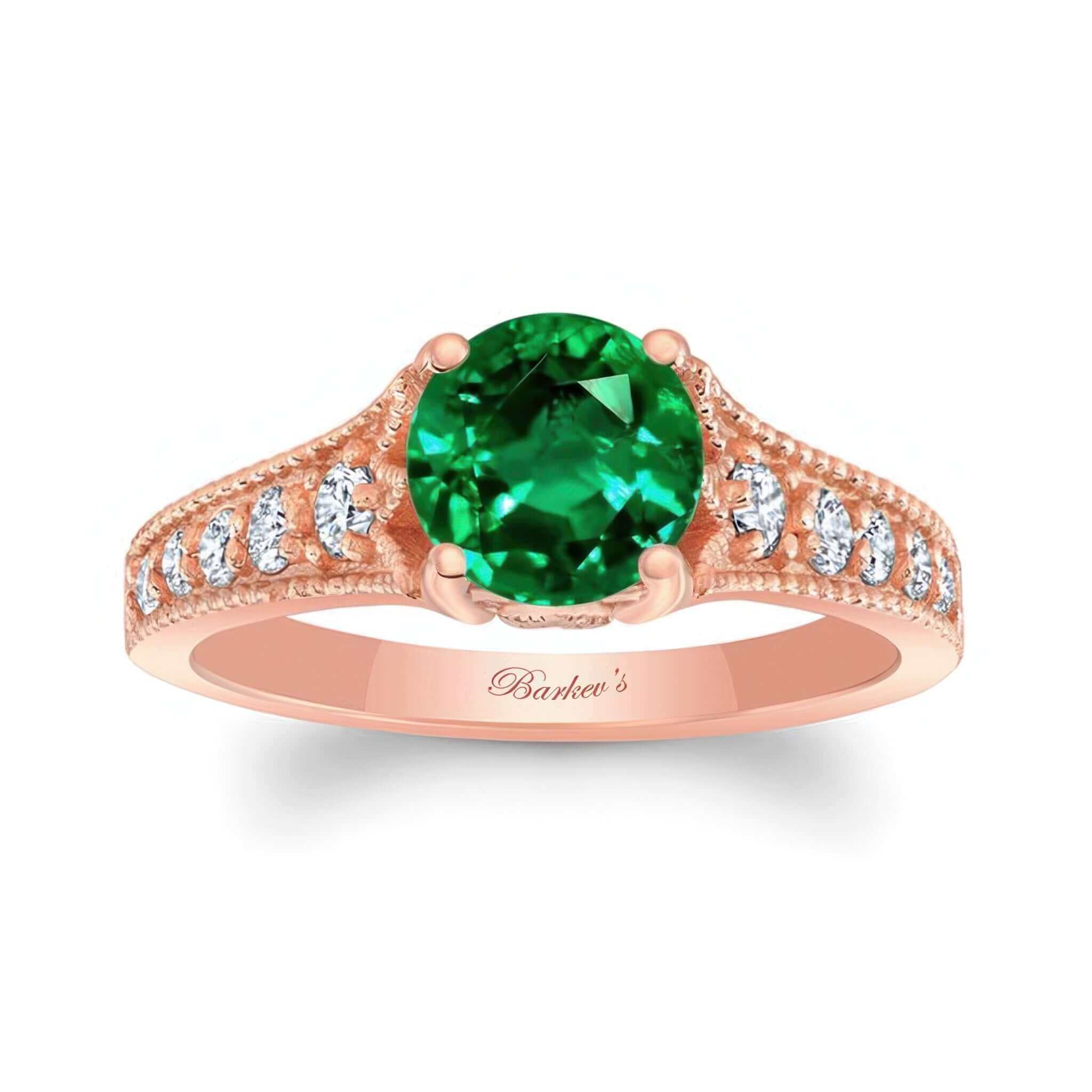 This beautiful lab emerald and diamond vintage ring features a prong set round center with shared prong set diamonds on the sides and a milgrain finish for a vintage look.