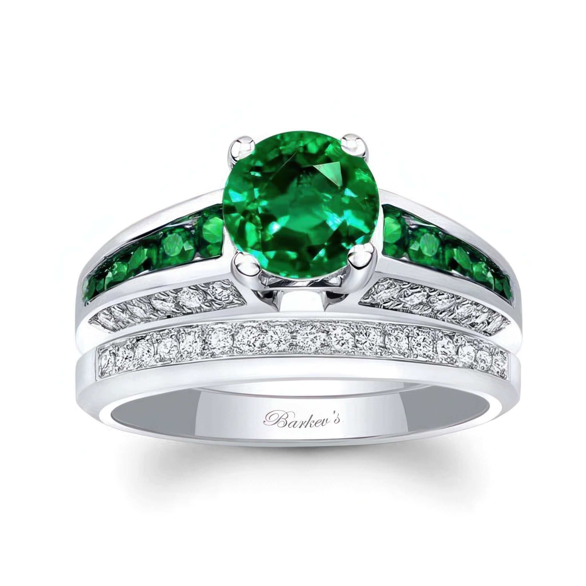 This magnificent lab emerald channel set wedding ring set boasts with sparkle from every angle featuring beveled edges and a round center that is met by a row of channel set emeralds and pave white diamonds adorning not only the top, but also each side of the shank. Adding to this brilliance, the diamond wedding band fits snuggly close to the engagement ring for an unparalleled look.