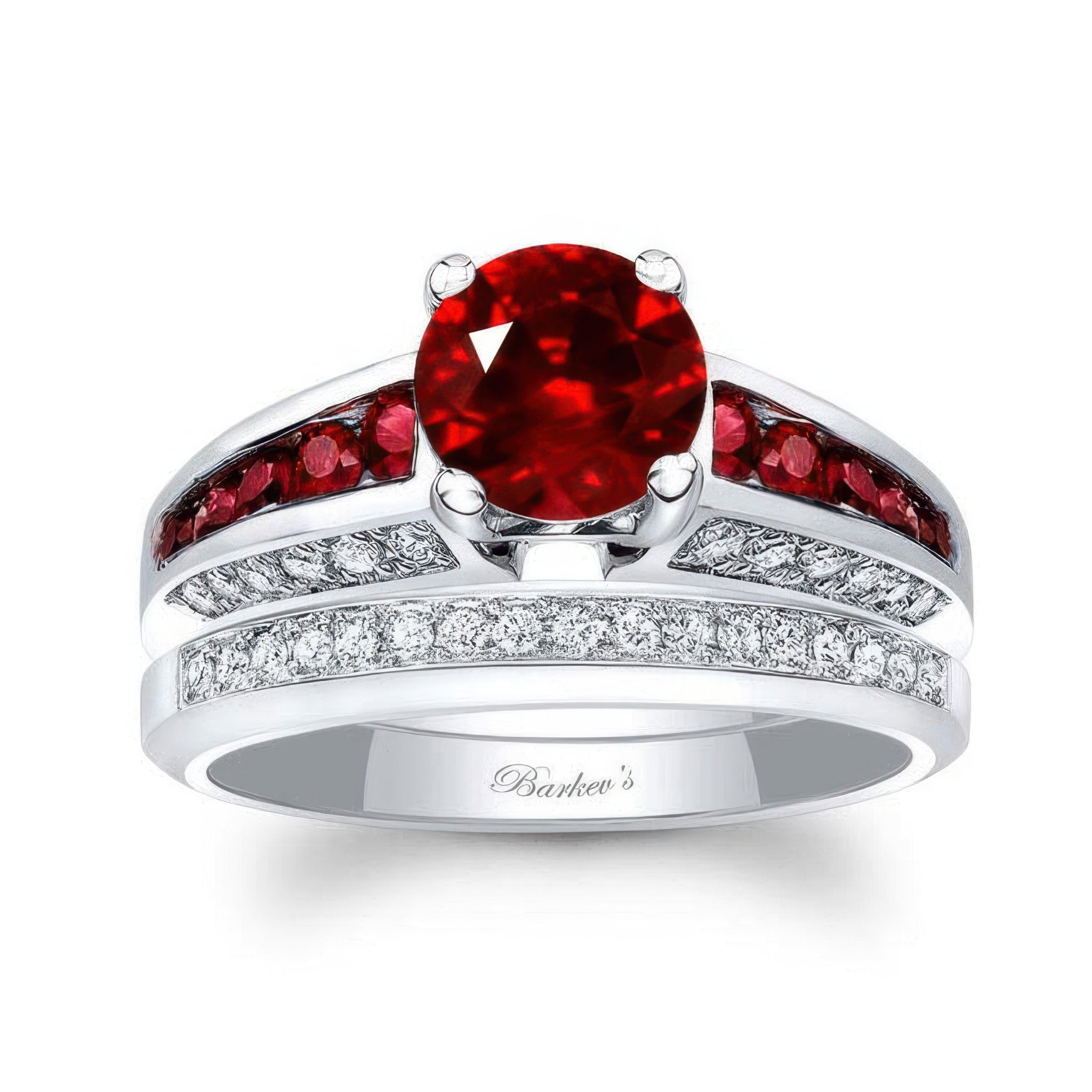 This magnificent lab ruby channel set wedding ring set boasts with sparkle from every angle featuring beveled edges and a round center that is met by a row of channel set rubies and pave white diamonds adorning not only the top, but also each side of the shank. Adding to this brilliance, the diamond wedding band fits snuggly close to the engagement ring for an unparalleled look.