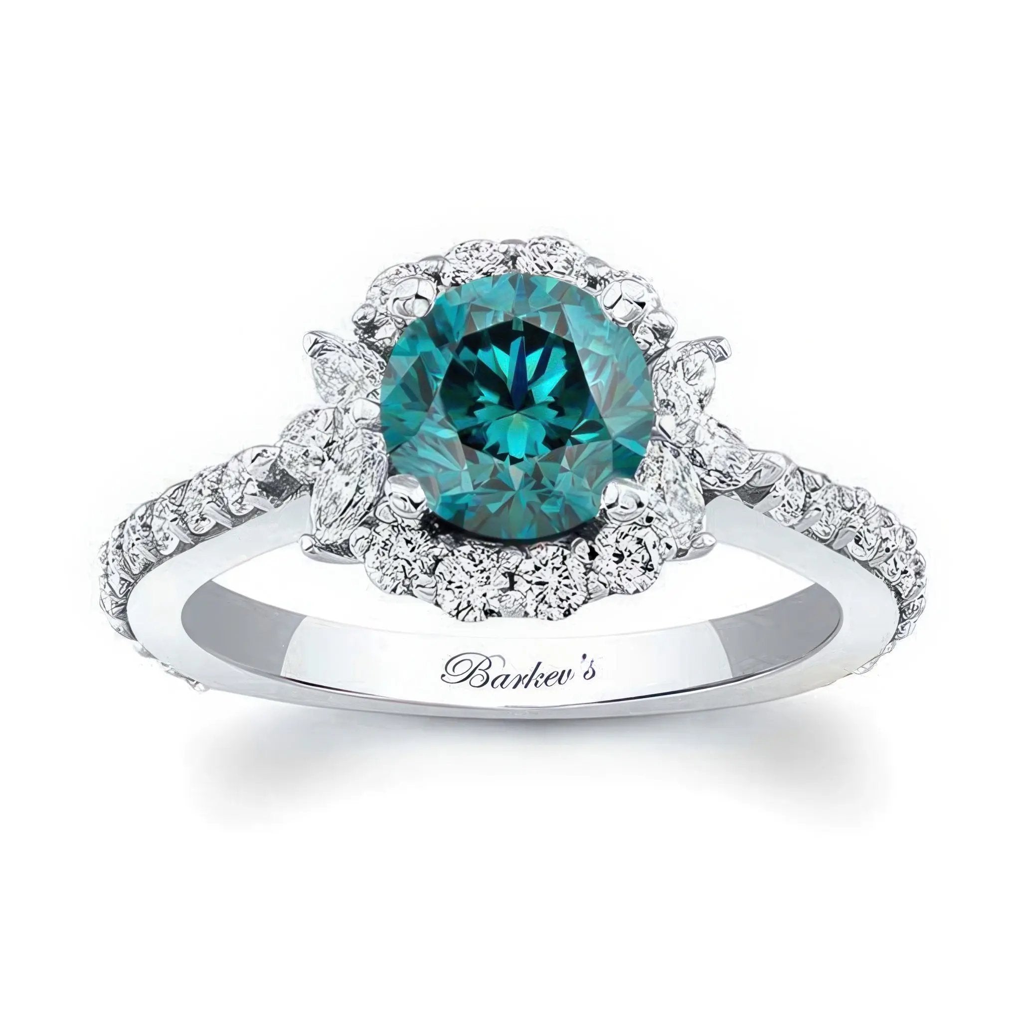 This marquise halo blue and white diamond ring features a prong set round center encircled with round and marquise cut diamonds for a stunning alternative to a traditional halo ring.