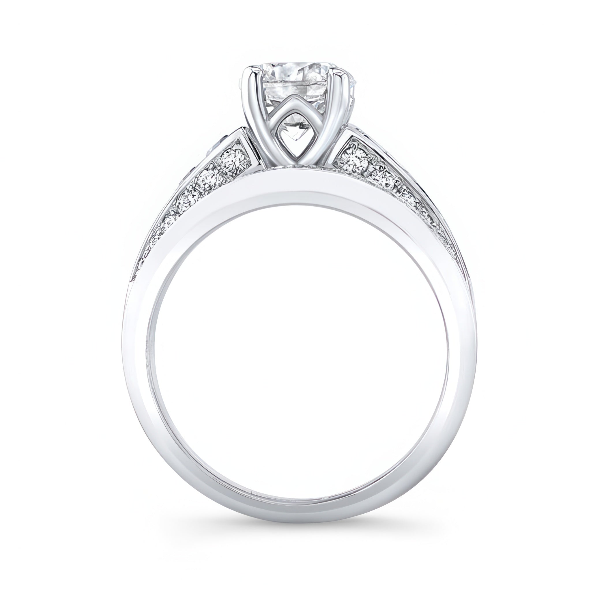 This magnificent moissanite channel set wedding ring set with rubies boasts with sparkle from every angle featuring beveled edges and a round center that is met by a row of channel set rubies and pave white diamonds adorning not only the top, but also each side of the shank. Adding to this brilliance, the diamond wedding band fits snuggly close to the engagement ring for an unparalleled look.
