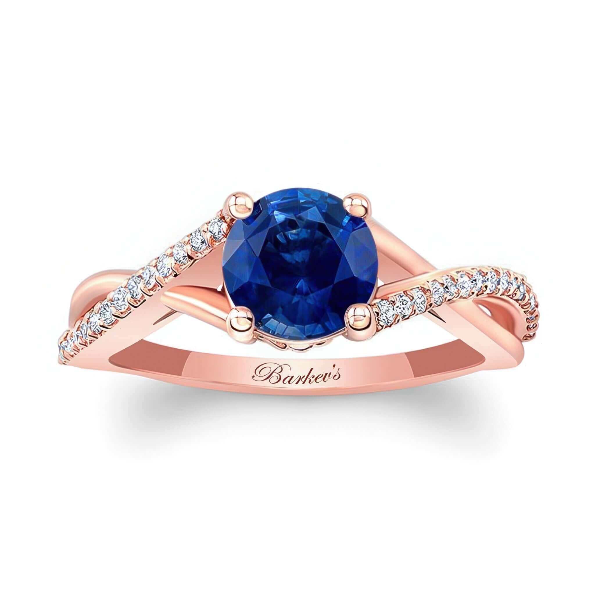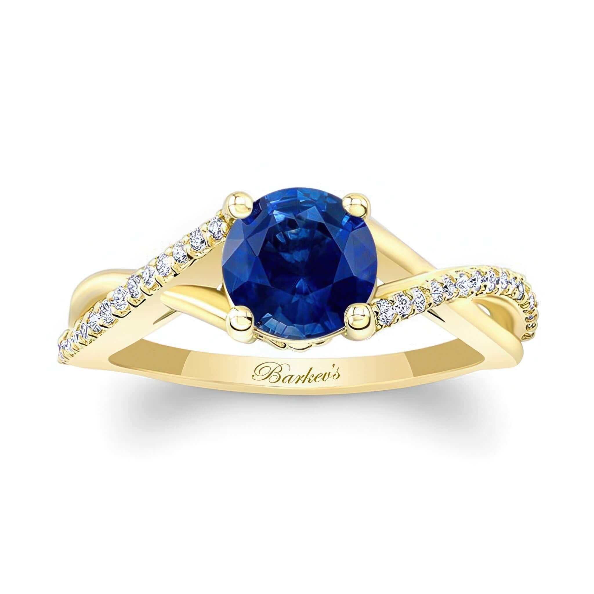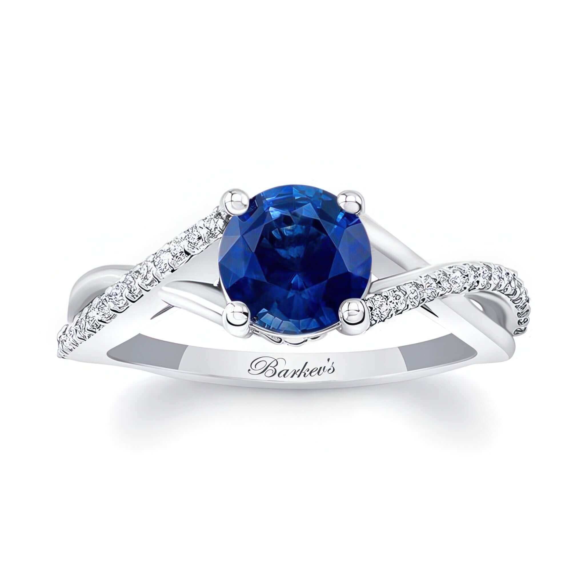 A simple one carat blue sapphire and diamond ring featuring a round center, a criss crossing split shank and shared prong diamonds on the sides.