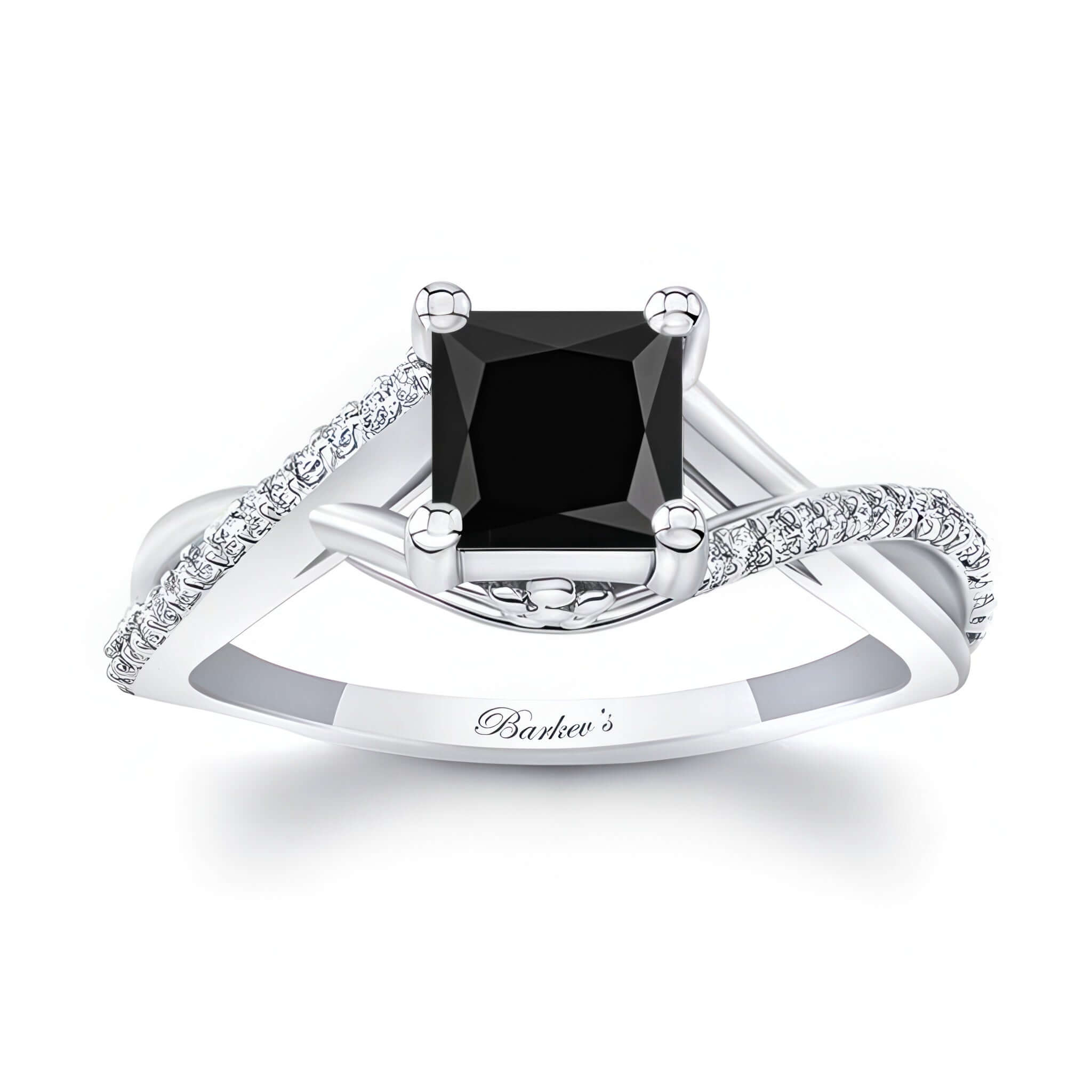 A simple one carat princess cut black and white diamond ring featuring a princess cut center, a criss crossing split shank and shared prong diamonds on the sides.