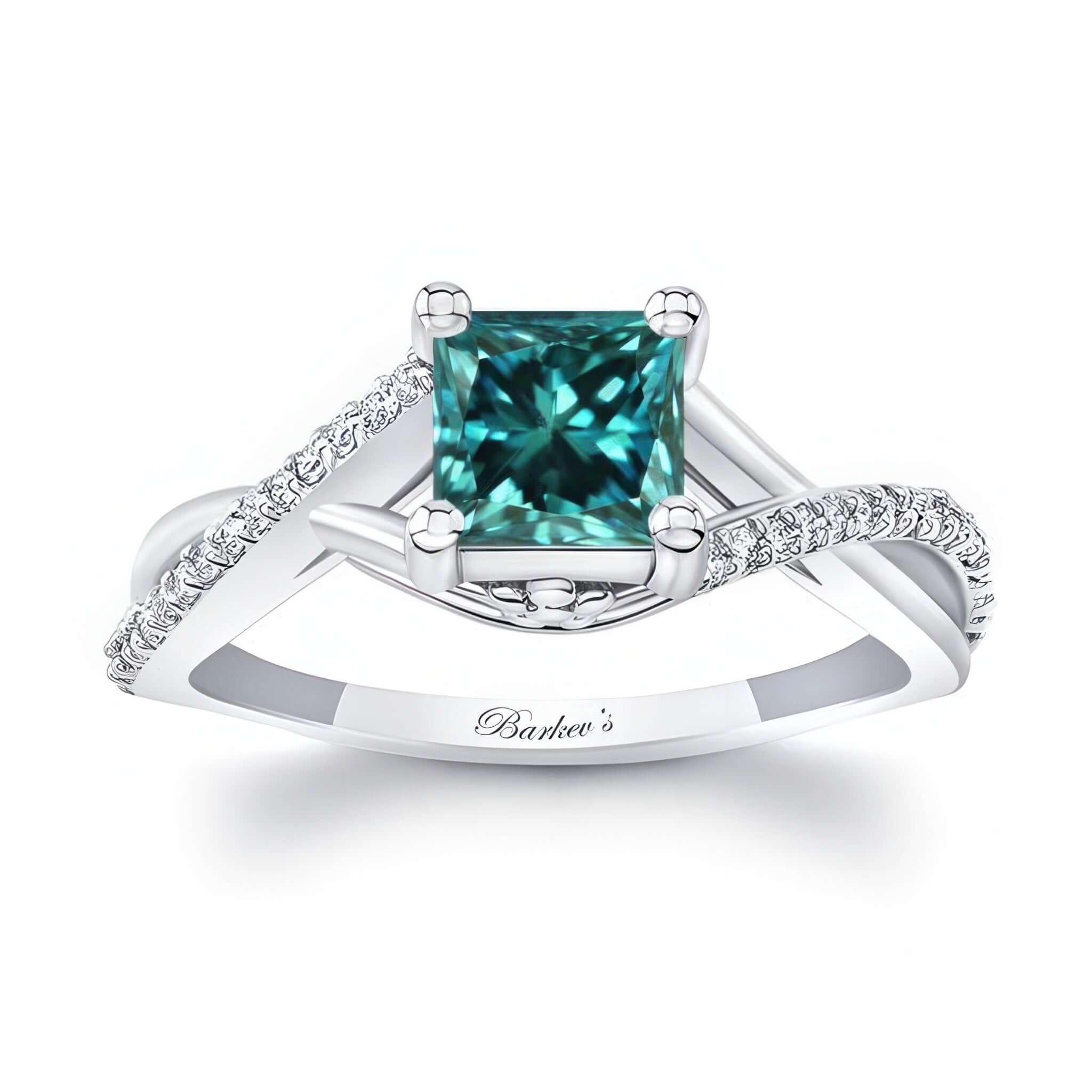 A simple one carat princess cut blue and white diamond ring featuring a princess cut center, a criss crossing split shank and shared prong diamonds on the sides.