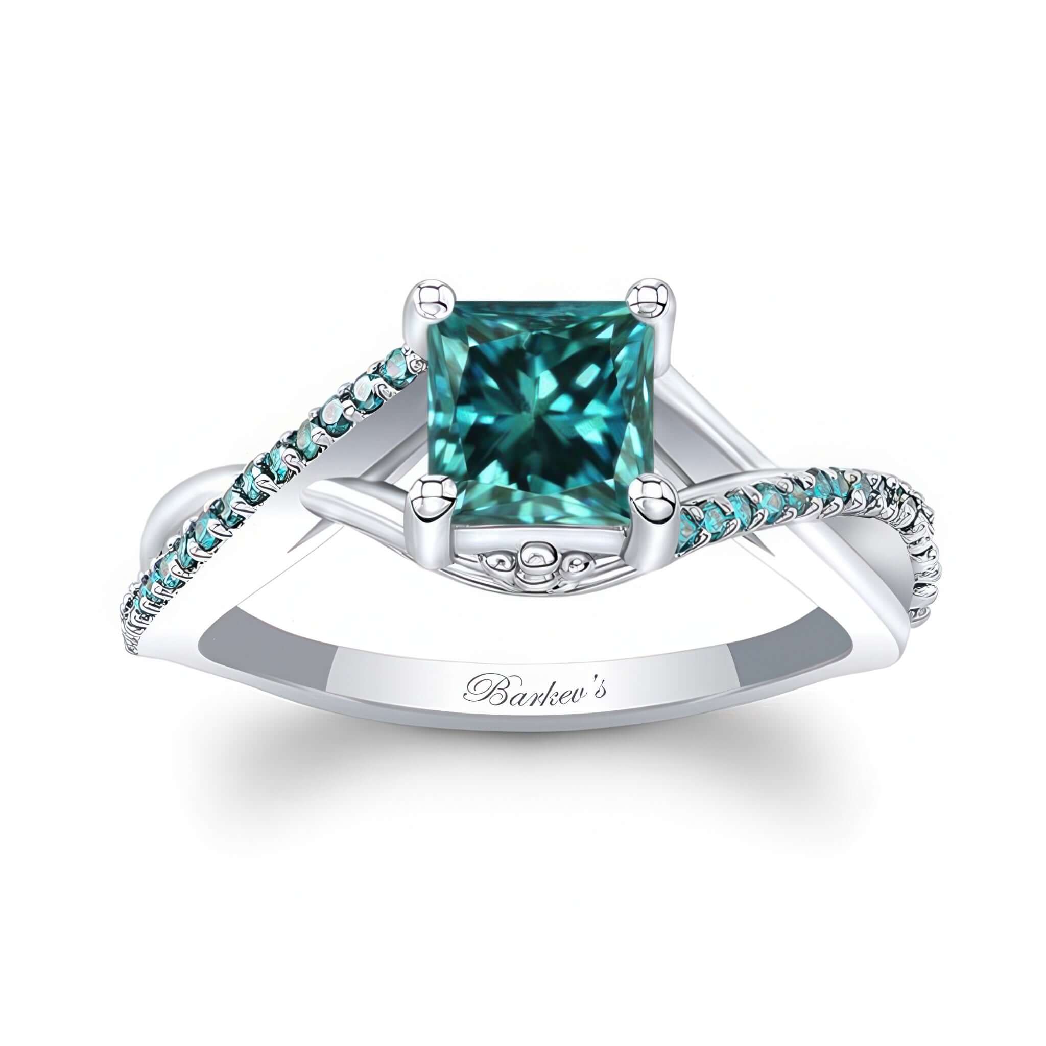 A simple one carat princess cut blue diamond ring featuring a princess cut center, a criss crossing split shank and shared prong blue diamonds on the sides.