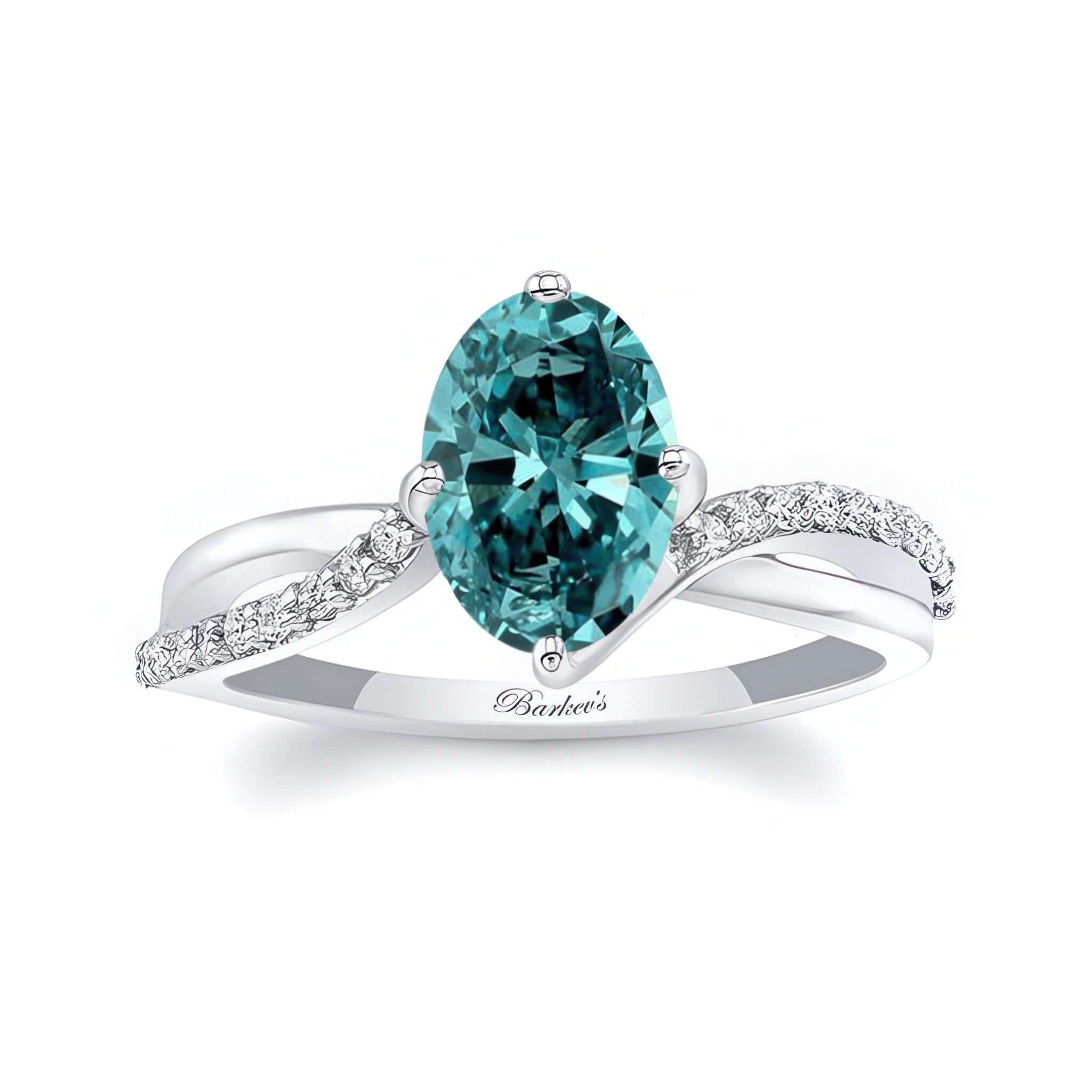 This oval blue and white diamond ring with twisted band features open curving shoulders sweeping up to create the prongs that hold the oval center while the opposing sides of the shank are adorned with shared-prong set diamonds for a subtle sparkle that will draw the eye.