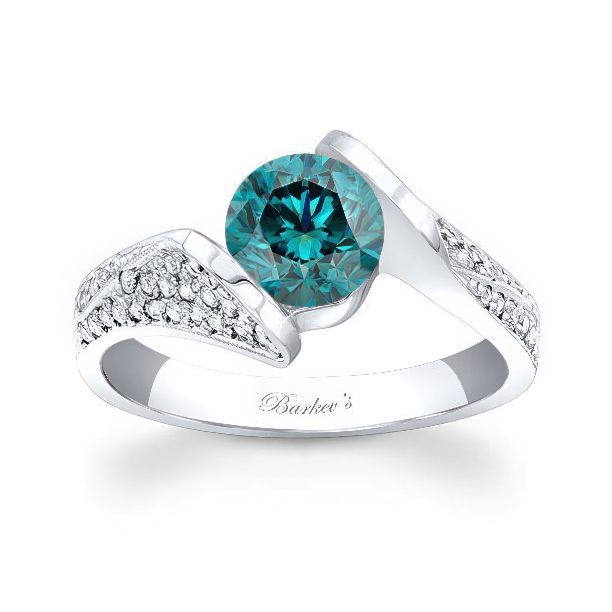 This pave round blue and white diamond ring features a channel set round center with pave set diamonds cascading down the shoulders.